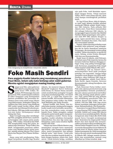 18 BERITAINDONESIA, 24 Mei 2007BERITA UTAMAFoke Masih SendiriPara anggota Koalisi Jakarta yang mendukung pencalonanFauzi Bowo, belum satu kata tentang calon wakil gubernur.Mereka ngotot mengajukan masing-masing calon.ampai awal Mei, calon gubernurDKI Jakarta yang diusung empatpartai besar—PPP, Golkar, Demokrat, PDI Perjuangan dan satupartai kecil, PDS, masih tampak sendiriandi stiker kampanye yang memaparkanjaminan pendidikan dan perawatan kesehatan cuma-cuma untuk warga Jakartayang tidak mampu. Sedangkan Adang Daradjatun dan Dani Anwar yang didukungPKS sudah tampil berdua dalam stikeryang beredar dan ditempel di seluruh penjuru Jakarta. PKS juga sudah menyiapkan100.000 kader, berkampanye untukAdang dan Dani.Siapa Cawagub yang akan mendampingi Foke, panggilan akrab Fauzi, masih dipertarungkan oleh empat partai pendukung—PPP, Golkar, Demokrat dan PDIP.PPP menghendaki orang dari partai, demikian juga Demokrat. Tetapi Golkar danPDIP, menghendaki pensiunan militer.Calon yang diajukan kedua partai tersebut, masing-masing Mayjen (Pur) DjasriMarin dan Mayjen (Pur) Slamet Kirbiantoro.Siapa yang jadi pendamping Foke,dapat berpotensi konflik bagi KoalisiJakarta. Ini menurut dugaan DirekturEksekutif Lingkaran Survei Indonesia(LSI) Denny JA. Namun Denny menolakuntuk membeberkan peringkat Cawagubyang akan mendampingi Foke, versi hasilsurvei LSI, 4-7 April lalu, karena berpotensi konflik. Hal tersebut dibenarkanoleh pimpinan fraksi Golkar dan PDIP,Andi Matalatta dan Tjahjo Kumolo.Potensi konflik, kata Denny, bisa tersulut kalau masing- masing partai anggotakoalisi masih terus berlomba menyodorkan dan memaksakan nama cawagubkepada Fauzi. Tjahjo mengakui, sampaikini partai-partai masih ngotot mengusulkan cawagubnya sendiri. Denny mengingatkan, koalisi sebaiknya bersepakatmenyodorkan dua atau tiga nama saja.Selanjutnya nama-nama tersebut dipilihsendiri oleh Foke.”Adopsi saja kasus Pilkada Banten yangmenetapkan cawagub harus memenuhitiga kriteria, yaitu mampu mendongkraksuara, punya kompetensi, dan mampubekerja sama,” kata Denny. Untuk poinsatu dan dua serahkan kepada Koalisi Jakarta dengan bantuan, antara lain, hasilsurvei. Untuk kriteria ketiga, serahkansaja pada Foke. Andi Matalatta sependapat dengan Denny. Tetapi menurutTjahjo, PDI-P cuma minta satu hal, calonyang mampu mendongkrak perolehansuara.Dr. Ing H Fauzi Bowo, lahir di Jakarta,10 April 1948, jabatan terakhir sebelummemasuki Pilkada adalah Wakil Gubernur DKI Jakarta. Pada pilkada DKIJakarta 2007, Fauzi Bowo mencalonkandiri sebagai Gubernur DKI Jakarta. Iamengungguli Agum Gumelar dan MahfudDjailani dalam penjaringan calon gubernur oleh PPP DKI Jakarta dengan 14suara. Agum meraih lima suara, sedangDjailani mendapat dua suara. Dua suaralain menyatakan abstain.Namun, dalam skorsing terhadap enamkandidat calon gubernur yang mengajukan diri ke Partai Demokrasi IndonesiaPerjuangan, dia menempati urutan palingterakhir. Dalam skorsing itu, ia meraih 80suara. Sedang, urutan teratas ditempatioleh Sarwono Kusumaatmadja.Banjir besar di Jakarta, awal Februari,membuat nama Foke terpuruk, karena diabersama Gubernur Sutiyoso dianggap sebagai orang yang paling bertanggungjawab. Karenanya, popularitas Foke sangattidak menjual untuk Pilkada DKI 2007.Sebaliknya, LSI 22 Januari 2007,menyampaikan hasil jajak pendapatterhadap 700 responden, minggu ketigaDesember 2006 dengan cara tatap muka.Hasilnya, calon Gubernur DKI yang paling diunggulkan adalah Fauzi Bowo,Rano Karno, Agum Gumelar, SarwonoKusumaatmadja, Adang Daradjatun, danBibit Waluyo.Pada Konvensi Partai Golkar 2007.Foke satu-satunya peserta konvensi yangmengembalikan formulir pendaftaran,dan satu-satunya peserta konvensi GolkarDKI yang diusung untuk jabatan gubernur. Tapi, partai PDS lah yang pertamakali mendukung pencalonan Foke, kemudian disusul oleh Golkar, PPP, Demokrat, PDI dan PBR. Foke juga secarakhusus mendapat dukungan pucuk pimpinan Muhammadiyah, Din Syamsudin.Sementara Cawagub Slamet Kirbiantoro yang diusung PDIP belakangan makinberkibar. Sekitar 44% warga DKI Jakartadari etnis Jawa mendukung Kirbi. Merekamengancam akan Golput jika Kirbi tidakmasuk bursa Cawagub mendampingiFoke. Sementara itu empat puluh OrmasBetawi dan etnis daerah lain menyampaikan pernyataan sikap mendukung pencalonan bekas Pangdam Jaya itu. Dukungan mereka disampaikan lewat deklarasi disebuah hotel di Jakarta belum lama ini.Dalam kesempatan itu, Kirbi menegaskanbahwa dia siap untuk mendampingi Fokedi Pilkada DKI. Sebagai mantan tentara,Kirbi siap menjalankan amanah yangdiberikan 40 Ormas tersebut. SHSFoke mengusung isu kesejahteraan masyarakat Jakarta foto: berindo wilson