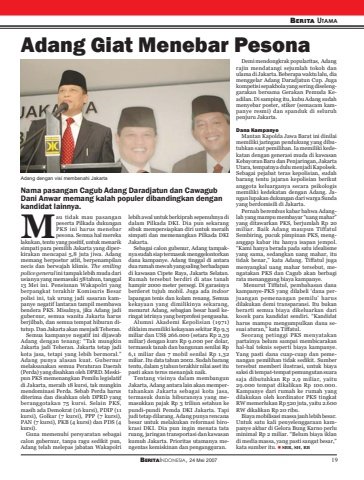 BERITAINDONESIA, 24 Mei 2007 19BERITA UTAMAAdang Giat Menebar PesonaNama pasangan Cagub Adang Daradjatun dan CawagubDani Anwar memang kalah populer dibandingkan dengankandidat lainnya.au tidak mau pasanganpeserta Pilkada dukunganPKS ini harus menebarpesona. Semua hal merekalakukan, tentu yang positif, untuk menariksimpati para pemilih Jakarta yang diperkirakan mencapai 5,8 juta jiwa. Adangmemang berpostur atlit, berpenampilannecis dan berwajah klimis. The smilingpolice general ini tampak lebih muda dariusianya yang memasuki 58 tahun, tanggal13 Mei ini. Pensiunan Wakapolri yangberpangkat terakhir Komisaris Besarpolisi ini, tak urung jadi sasaran kampanye negatif lantaran tampil membawabendera PKS. Misalnya, jika Adang jadigubernur, semua wanita Jakarta harusberjilbab, dan semua tempat hiburan ditutup. Dan Jakarta akan menjadi Teheran.Semua kampanye negatif ini dijawabAdang dengan tenang: “Tak mungkinJakarta jadi Teheran. Jakarta tetap jadikota jasa, tetapi yang lebih bermoral.”Adang punya alasan kuat. Gubernurmelaksanakan semua Peraturan Daerah(Perda) yang disahkan oleh DPRD. Meskipun PKS memenangkan Pemilu legislatifdi Jakarta, meraih 18 kursi, tak mungkinmendominasi Perda. Sebab Perda harusditerima dan disahkan oleh DPRD yangberanggotakan 75 kursi. Selain PKS,masih ada Demokrat (16 kursi), PDIP (11kursi), Golkar (7 kursi), PPP (7 kursi),PAN (7 kursi), PKB (4 kursi) dan PDS (4kursi).Guna memenuhi persyaratan sebagaicalon gubernur, tanpa ragu sedikit pun,Adang telah melepas jabatan Wakapolrilebih awal untuk berkiprah sepenuhnya didalam Pilkada DKI. Dia pun sekarangsibuk mempersiapkan diri untuk meraihsimpati dan memenangkan Pilkada DKIJakarta.Sebagai calon gubenur, Adang tampaknya sudah siap termasuk menggelontorkandana kampanye. Adang tinggal di antaradua rumah mewah yang saling berhadapandi kawasan Cipete Raya, Jakarta Selatan.Rumah tersebut berdiri di atas tanahhampir 2000 meter persegi. Di garasinyaberderet tujuh mobil. Juga ada indoorlapangan tenis dan kolam renang. Semuakekayaan yang dimilikinya sekarang,menurut Adang, sebagian besar hasil keringat istrinya yang berprofesi pengusaha.Alumni Akademi Kepolisian (1971)diklaim memiliki kekayaan sekitar Rp 9,3miliar dan US$ 266.000 (setara Rp 2,39miliar) dengan kurs Rp 9.000 per dolar,termasuk tanah dan bangunan senilai Rp6,1 miliar dan 7 mobil senilai Rp 1,32miliar. Itu data tahun 2002. Sudah barangtentu, dalam 5 tahun terakhir nilai aset itupasti akan terus menanjak naik.Tentang visinya dalam membangunJakarta, Adang antara lain akan mempertahankan Jakarta sebagai kota jasa,termasuk dunia hiburannya yang memasukkan pajak Rp 3 triliun setahun kepundi-pundi Pemda DKI Jakarta. Tapijudi tetap dilarang. Adang punya rencanabesar untuk melakukan reformasi birokrasi DKI. Dia pun ingin menata tataruang, jaringan transportasi dan kawasankumuh Jakarta. Prioritas utamanya mengentas kemiskinan dan pengangguran.Demi mendongkrak popularitas, Adangrajin mendatangi sejumlah tokoh danulama di Jakarta. Beberapa waktu lalu, diamenggelar Adang Daradjatun Cup. Jugakompetisi sepakbola yang sering diselenggarakan bersama Gerakan Pemuda Keadilan. Di samping itu, kubu Adang sudahmenyebar poster, stiker (semacam kampanye resmi) dan spanduk di seluruhpenjuru Jakarta.Dana KampanyeMantan Kapolda Jawa Barat ini dinilaimemiliki jaringan pendukung yang dibutuhkan saat pemilihan. Ia memiliki kedekatan dengan generasi muda di kawasanKebayoran Baru dan Penjaringan, JakartaUtara, tempatnya dulu menjadi Kapolsek.Sebagai pejabat teras kepolisian, sudahbarang tentu jajaran kepolisian berikutanggota keluarganya secara psikologismemiliki kedekatan dengan Adang. Jangan lupakan dukungan dari warga Sundayang berdomisili di Jakarta.Pernah berembus kabar bahwa Adanglah yang mampu membayar “uang mahar”yang ditawarkan PKS, berjumlah Rp 20miliar. Baik Adang maupun TiffatulSembiring, pucuk pimpinan PKS, menganggap kabar itu hanya isapan jempol.“Kami hanya berada pada satu idealismeyang sama, sedangkan uang mahar, itutidak benar,” kata Adang. Tiffatul jugamenyangkal uang mahar tersebut, mengatakan PKS dan Cagub akan berbagirata menanggung biaya kampanye. Menurut Tiffatul, pembahasan danakampanye-PKS yang dilabeli ‘dana perjuangan pemenangan pemilu’ harusdilakukan demi transparansi. Itu bukanberarti semua biaya dikeluarkan darikocek para kandidat sendiri. “Kandidatharus mampu mengumpulkan dana sesuai aturan,” kata Tiffatul.Seorang petinggi PKS menyatakanpartainya belum sampai membicarakanhal-hal teknis seperti biaya kampanye.Yang pasti dana cuap-cuap dan pemenangan pemilihan tidak sedikit. Sumbertersebut memberi ilustrasi, untuk biayasaksi di tempat-tempat pemungutan suarasaja dibutuhkan Rp 2,9 miliar, yaitu29.000 tempat dikalikan Rp 100.000.Kampanye dari rumah ke rumah yangdilakukan oleh kordinator PKS tingkatRW memerlukan Rp 520 juta, yaitu 2.600RW dikalikan Rp 20 ribu.Biaya mobilisasi massa jauh lebih besar.Untuk satu kali penyelenggaraan kampanye akbar di Gelora Bung Karno perluminimal Rp 2 miliar. “Belum biaya iklandi media massa, yang pasti sangat besar,”kata sumber itu. SBR, SH, RBMAdang dengan visi membenahi Jakarta