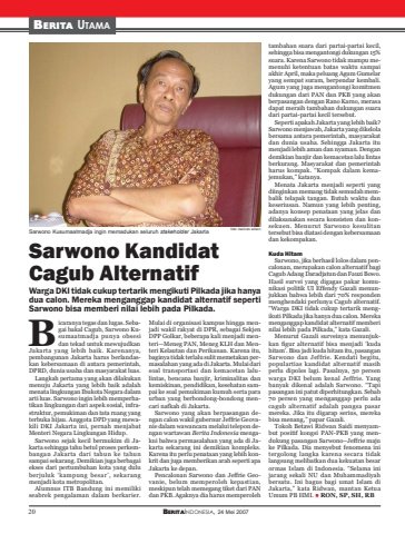 20 BERITAINDONESIA, 24 Mei 2007BERITA UTAMASarwono KandidatCagub AlternatifWarga DKI tidak cukup tertarik mengikuti Pilkada jika hanyadua calon. Mereka menganggap kandidat alternatif sepertiSarwono bisa memberi nilai lebih pada Pilkada.icaranya tegas dan lugas. Sebagai bakal Cagub, Sarwono Kusumaatmadja punya obsesidan tekad untuk mewujudkanJakarta yang lebih baik. Karenanya,pembangunan Jakarta harus berlandaskan kebersamaan di antara pemerintah,DPRD, dunia usaha dan masyarakat luas.Langkah pertama yang akan dilakukanmenuju Jakarta yang lebih baik adalahmenata lingkungan Ibukota Negara dalamarti luas. Sarwono ingin lebih memperhatikan lingkungan dari aspek sosial, infrastruktur, pemukiman dan tata ruang yangterbuka hijau. Anggota DPD yang mewakili DKI Jakarta ini, pernah menjabatMenteri Negara Lingkungan Hidup.Sarwono sejak kecil bermukim di Jakarta sehingga tahu betul proses perkembangan Jakarta dari tahun ke tahunsampai sekarang. Demikian juga berbagaiekses dari pertumbuhan kota yang duluberjuluk ‘kampung besar’, sekarangmenjadi kota metropolitan.Alumnus ITB Bandung ini memilikiseabrek pengalaman dalam berkarier.Mulai di organisasi kampus hingga menjadi wakil rakyat di DPR, sebagai SekjenDPP Golkar, beberapa kali menjadi menteri—Meneg PAN, Meneg KLH dan Menteri Kelautan dan Perikanan. Karena itu,baginya tidak terlalu sulit memetakan permasalahan yang ada di Jakarta. Mulai darisoal transportasi dan kemacetan lalulintas, bencana banjir, kriminalitas dankemiskinan, pendidikan, kesehatan sampai ke soal pemukiman kumuh serta paraurban yang berbondong-bondong mencari nafkah di Jakarta.Sarwono yang akan berpasangan dengan calon wakil gubernur Jeffrie Geovanie dalam wawancara melalui telepon dengan wartawan Berita Indonesia mengakui bahwa permasalahan yang ada di Jakarta sekarang ini demikian kompleks.Karena itu perlu penataan yang lebih konkrit dan juga memberikan arah seperti apaJakarta ke depan.Pencalonan Sarwono dan Jeffrie Geovanie, belum memperoleh kepastian,meskipun telah memegang tiket dari PANdan PKB. Agaknya dia harus memperolehtambahan suara dari partai-partai kecil,sehingga bisa mengantongi dukungan 15%suara. Karena Sarwono tidak mampu memenuhi ketentuan batas waktu sampaiakhir April, maka peluang Agum Gumelaryang sempat suram, berpendar kembali.Agum yang juga mengantongi komitmendukungan dari PAN dan PKB yang akanberpasangan dengan Rano Karno, merasadapat meraih tambahan dukungan suaradari partai-partai kecil tersebut.Seperti apakah Jakarta yang lebih baik?Sarwono menjawab, Jakarta yang dikelolabersama antara pemerintah, masyarakatdan dunia usaha. Sehingga Jakarta itumenjadi lebih aman dan nyaman. Dengandemikian banjir dan kemacetan lalu lintasberkurang. Masyarakat dan pemerintahharus kompak. “Kompak dalam kemajemukan,” katanya.Menata Jakarta menjadi seperti yangdiinginkan memang tidak semudah membalik telapak tangan. Butuh waktu dankeseriusan. Namun yang lebih penting,adanya konsep penataan yang jelas dandilaksanakan secara konsisten dan konsekuen. Menurut Sarwono kesulitantersebut bisa diatasi dengan kebersamaandan kekompakan.Kuda HitamSarwono, jika berhasil lolos dalam pencalonan, merupakan calon alternatif bagiCagub Adang Daradjatun dan Fauzi Bowo.Hasil survei yang digagas pakar komunikasi politik UI Effendy Gazali menunjukkan bahwa lebih dari 70% respondenmenghendaki perlunya Cagub alternatif.“Warga DKI tidak cukup tertarik mengikuti Pilkada jika hanya dua calon. Merekamenganggap kandidat alternatif memberinilai lebih pada Pilkada,” kata Gazali.Menurut Gazali surveinya menunjukkan figur alternatif bisa menjadi ‘kudahitam’. Bisa jadi kuda hitam itu, pasanganSarwono dan Jeffrie. Kendati begitu,populartias kandidat alternatif masihperlu dipoles lagi. Pasalnya, 50 persenwarga DKI belum kenal Jeffrie. Yangbanyak dikenal adalah Sarwono. “Tapipasangan ini patut diperhitungkan. Sebab70 persen yang menganggap perlu adacagub alternatif adalah pangsa pasarmereka. Jika itu digarap serius, merekabisa menang,” papar Gazali.Tokoh Betawi Ridwan Saidi menyambut positif kongsi PAN-PKB yang mendukung pasangan Sarwono–Jeffrie majuke Pilkada. Dia menyebut fenomena initergolong langka karena secara tidaklangsung melibatkan dua kekuatan besarormas Islam di Indonesia. “Selama inijarang sekali NU dan Muhammadiyahbersatu. Ini bagus bagi umat Islam diJakarta,” kata Ridwan, mantan KetuaUmum PB HMI. RON, SP, SH, RBBSarwono Kusumaatmadja ingin memadukan seluruh stakeholder Jakarta foto: berindo wilson