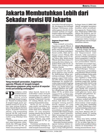 BERITAINDONESIA, 24 Mei 2007 21BERITA UTAMAJakarta Membutuhkan Lebih dariSekadar Revisi UU JakartaYang menjadi persoalan, bagaimanaagenda Pilkada di tengah-tengahbanyaknya gagasan yang muncul di seputarrevisi perundang-undangan?erubahan selalumembawa kesempatan dan kesempatan selalumengundang banyak keinginan”. Risalah ini sedang terjadidi tengah-tengah proses perubahan (revisi) UU No 34 Tahun 1999 tentang Pemerintahan Daerah Khusus Ibu KotaNegara Republik IndonesiaJakarta, yang mengundangbanyak ide-ide yang kononbertujuan menyelesaikan persoalan yang dihadapi kotaJakarta.Terlebih-lebih karena padasaat yang bersamaan, pemerintah dan DPR juga tengahmengkaji revisi UU No. 32Tahun 2004 tentang Pemerintahan Daerah. Revisi ini dimaksudkan untuk mensplit(memisahkan) UU Pemda itumenjadi 3 (tiga) UU, yakni UUtentang Pemerintah Daerah,UU tentang Pilkada, dan UUtentang Pemerintahan Desa.Revisi UU No. 34 Tahun1999 sendiri merupakan sebuah keharusan yang tidakboleh tidak harus dilakukan.Sebab, UU yang mengaturtentang Jakarta saat ini masihberinduk pada UU No. 22Tahun 1999 tentang Pemerintahan Daerah, yang sudahdiubah menjadi UU No. 32Tahun 2004.Perubahan-perubahan dalam perundang-undangan initelah menjadi momentum bagimunculnya banyak keinginan,ide, dan gagasan dari berbagaikalangan. Keleluasaan mengajukan gagasan dan ide-ide itu,semakin terbuka di tengahtengah realitas dari kompleksnya masalah yang dihadapimasayarat Jakarta.Gagasan Empat WakilGubernurYang menjadi persoalan,bagaimana agenda Pilkada ditengah-tengah banyaknya gagasan yang muncul di seputarrevisi perundang-undangan?Secara yuridis, tidak ada hubungan antara Pilkada DKIJakarta dengan revisi UU No.34 Tahun 1999. Sebab aturanPilkada tidak diatur dalam UUtentang Ibu Kota Jakarta, melainkan diatur pada UU No. 32Tahun 2004 tentang Pemerintahan Daerah.Akan tetapi, permasalahanakan menjadi lain jika gagasan-gagasan yang munculitu diakomodasi dalam perundang-undangan. Misalnya,gagasan empat Wakil Gubernur DKI Jakarta yang hangatbelakangan ini, menjadi persoalan yang menukik langsungpada landasan hukum pilkada.Sebab, yang dipilih bukan lagipasangan gubernur dan wakilnya sebagaimana yang diaturdalam UU No. 32 tahun 2004maupun UU No. 34 Tahun 1999,melainkan seorang gubernurdengan 4 wakil gubernur.Itu membutuhkan landasanhukum, baik dalam UU yangmengatur tentang otonomidaerah maupun UU yangmengatur Jakarta. Sementaragagasan yang menginginkanpenambahan perangkat Pemerintah DKI Jakarta dengan4 (empat) Deputi Gubernur,tidak mempengaruhi prosespilkada, karena keempat Deputi Gubernur DKI Jakartatersebut tidak ikut dipilih.Menyadari beratnya pembangunan landasan hukum terhadap pasangan gubernur dengan 4 orang wakil gubernur,berbagai fraksi di DPRD DKIJakarta mengakui banyaknyakesulitan untuk merealisasikan gagasan itu. Namun demikian, Wakil Ketua DPRD DKIJakarta Ilal Ferhard, saat dikonfirmasi Berita Indonesia,Jumat (4/5) menegaskan pandangannya bahwa konsep 4wakil gubernur relevan dengankebutuhan Jakarta.Jakarta MembutuhkanLebih dari Sekadar RevisiBerbeda dengan Ilal, KetuaMetropolitan Cabin for Watchand Empowerment AmirHamzah, tidak sepenuhnyapercaya terhadap pandanganbahwa pengadaan 4 wakil gubernur akan dapat menyelesaikan permasalahan Jakarta.“Dari tahun 1974 sampai 1997,Jakarta mempunyai 4 wakilgubernur tetapi Jakarta tetapberhasil dibangun,” katanya.Menurutnya, permasalahanyang dihadapi Jakarta terletakpada kewenangan, bukan padabanyaknya pejabat. “Walaupun wagubnya 4 tetapi kalautidak ada wewenang, akan jadikambing congek juga. Apalagidengan pola pikir seperti yangdisuguhkan Sutiyoso. Empatwakil gubernur, gubernur sajayang dipilih dan wagubnyaditunjuk gubernur. Itu berartiwakil gubernur hanya akanmengabdi pada gubernur, bukan pada rakyat,” tuturnya.Permasalahan yang palingmendasar, tambah Amir Hamzah, karena sebuah UU tidakdirencanakan untuk jangkawaktu yang lama. Disampingitu, tidak dilakukakan suatuevaluasi terhadap pelaksanaansebuah UU. “Menurut saya,yang harus dituntut oleh pemerintah adalah UU tentangotonomi khusus DKI Jakarta,”katanya.Kalau mau betul, tambahAmir Hamzah, lupakan revisiUU No 34 tahun 1999 dan rumuskan suatu pemikiran bahwaJakarta ini memerlukan UUtentang otonomi khusus. MH“PAmir Hamzah foto: dok