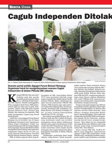 22 BERITAINDONESIA, 24 Mei 2007BERITA UTAMACagub Independen DitolakDomain partai politik digugat Forum Betawi Rempug.Organisasi lokal ini mengedepankan wacana Cagubindependen di dalam Pilkada DKI Jakarta.enapa FBR tiba-tiba meronta?Padahal sejak dini merekamendukung pencalonan FauziBowo, sekarang Wakil Gubernur DKI Jakarta. Setelah meninggalkanFoke, panggilan akrab Fauzi, FBR melontarkan gagasan bagi porsi Cagub independen, seperti yang diberikan kepadaDaerah Istimewa Aceh. Namun bisaditebak, jika tuntutan itu dipenuhi, FBRboleh mengajukan Cagub yang kentaldialek Betawi.Lebih dari 1.000 anggota Forum BetawiRempug (19/4) berunjuk rasa di depanMahkamah Konstitusi dan DepartemenDalam Negeri (Depdagri). Unjuk rasayang berlangsung tertib ini sebagai bagiandari perjuangan masyarakat Betawi dalammenggolkan pasal tentang calon gubernurindependen dalam Revisi UU (No 34/1999) tentang Pemerintahan ProvinsiDaerah Khusus Ibukota Negara, Jakarta.FBR, di dalam sepucuk surat yang dilayangkan ke MK, menyatakan bahwaUUD 1945 menjamin hak-hak warganegara memilih dan dipilih dalam Pemilumaupun Pilkada. Maka, sehubungan dengan rencana pelaksanaan Pilkada DKIJakarta, FBR meminta agar calon gubernur independen diakomodasi. Karenanya,mereka mendesak MK melakukan Yudicial Review (Uji Materi) terhadap UUNo. 32/2004 tentang PemerintahanDaerah dan UU No. 34/1999.Dua tokoh masyarakat Betawi, Drs. H.Ridwan Saidi dan KH. Fadholi El Munir,yang memimpin unjuk rasa tersebutmengajukan alasan bahwa kekhususanJakarta sama seperti keistimewaan NAD(Aceh) dan DIY (Yogyakarta). Karena itu,sudah semestinya calon kepala daerah(Cakepda) alias Cagub independen diberikesempatan berlomba di dalam PilkadaDKI Jakarta.“Kedatangan rombongan kami wargaJakarta, orang Betawi, untuk menyampaikan aspirasi. Kami menuntut adanyacalon independen di dalam Pilkada DKI,”kata Ridwan dan Fadholi. Menurut mereka, demokrasi di Indonesia bukan hanyamilik partai politik. Ridwan, bekas anggota DPR dari PPP, mempertanyakan kenapa status khusus Jakarta dibedakandari Aceh? Pilkada NAD menerima pasangan calon independen yang kemudiandinyatakan sebagai pemenang.Dengan nada agak mengancam, Ridwanmengatakan bahwa pihaknya tidak inginmuncul ketidakstabilan di Ibukota jikaaspirasi mereka tidak diterima. Saatditanya, mengapa masyarakat Betawihanya memperjuangkan calon gubernurindependen untuk DKI? Ridwan mengatakan kepada Berita Indonesia, masingmasing daerah harus memperjuangkannya. “Kita dalam hal ini mengambilapa yang efisien saja. Silahkan saja orangdaerah, tetapi kami memperjuangkanuntuk DKI,” kata Ridwan.Ketua Umum FBR KH. Fadloli El.Munir yang dijagokan organisasinyasebagai Cagub DKI independen untukPilkada 2007, mengkritisi perilaku partaipartai politik yang disebutnya memilikiKDrs. H. Ridwan Saidi didampingi KH. Fadholi El Munir ketika berorasi di depan gedung Departemen Dalam Negeri foto-foto: berindo wilson