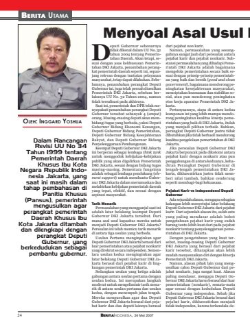 24 BERITAINDONESIA, 24 Mei 2007BERITA UTAMAMenyoal Asal Usul DDalam RancanganRevisi UU No 34Tahun 1999 tentangPemerintah DaerahKhusus Ibu KotaNegara Republik Indonesia Jakarta, yangsaat ini masih dalamtahap pembahasan diPanitia Khusus(Pansus), pemerintahmengusulkan agarperangkat pemerintahDaerah Khusus IbuKota Jakarta ditambahdan dilengkapi denganperangkat DeputiGubernur, yangberkedudukan sebagaipembantu gubernur.eputi Gubernur sebenarnyatidak dikenal dalam UU No. 32tahun 2004 tentang Pemerintahan Daerah. Akan tetapi, sesuai dengan asas kekhususan Pemerintahan DKI Jakarta, penambahan perangkat pemerintah daerah seperti ini, sepanjang relevan dengan tuntutan pelayananmasyarakat, tetap dapat dilakukan. Sebelumnya, penambahan perangkat DeputiGubernur ini, juga telah pernah diusulkanPemerintah DKI Jakarta, sebelum berlakunya UU No. 32 Tahun 2004, namuntidak terealisasi pada akhirnya.Saat ini, pemerintah dan DPR telah menyepakati penambahan perangkat DeputiGubernur tersebut sebanyak 4 (empat)orang. Masing-masing deputi akan membidangi tugas yang berbeda, yakni DeputiGubernur Bidang Ekonomi Keuangan,Deputi Gubernur Bidang Pemerintahan,Deputi Gubernur Bidang KesejahteraanRakyat, dan Deputi Gubernur BidangPenyelenggaraan Pembangunan.Keempat Deputi Gubernur DKI Jakartaini berperan sebagai lembaga think tankuntuk menggodok kebijakan-kebijakanpublik yang akan digulirkan PemerintahDKI Jakarta, sesuai dengan bidang tugasmasing-masing. Sementara fungsinyaadalah sebagai lembaga pendukung (element support) untuk membantu Gubernur DKI Jakarta dalam merumuskan danmelahirkan kebijakan pemerintah daerahyang tepat, efektif, dan sesuai denganaspirasi masyarakat.Tarik MenarikPermasalahan yang mengganjal saat iniadalah latar belakang keempat DeputiGubernur DKI Jakarta tersebut. Darimana asal usul kapasitas mereka untukmenjadi Deputi Gubernur DKI Jakarta?Persoalan ini telah memicu tarik menarikdi antara tiga usulan yang berbeda.Usulan Pertama menginginkan agarDeputi Gubernur DKI Jakarta berasal dariluar pemerintahan atau pejabat nonkariryang direkrut secara independen. Sementara usulan kedua menginginkan agarlatar belakang Deputi Gubernur DKI Jakarta berasal dari pejabat karir di lingkungan pemerintah DKI Jakarta.Sedangkan usulan yang ketiga adalahgabungan antara usulan pertama denganusulan kedua. Ini merupakan langkahmoderat untuk mengeliminir tarik menarik di antara usulan pertama dan usulankedua, dengan menempuh jalan tengah.Mereka mengusulkan agar dua DeputiGubernur DKI Jakarta berasal dari pejabat karir dan dua deputi lainnya berasaldari pejabat non karir.Namun, permasalahan yang sesungguhnya sangat jauh dari persoalan antarapejabat karir dan pejabat nonkarir. Substansi permasalahan yang dihadapi Pemerintah DKI Jakarta adalah bagaimanamengelola pemerintahan secara baik sesuai dengan prinsip-prinsip pemerintahan yang baik dan bersih (good and cleangovernment), bagaimana mendorong peningkatan kesejahteraan masyarakat,menciptakan keamanan dan stabilitas sosial, atau pun mendorong peningkatanetos kerja aparatur Pemerintah DKI Jakarta.Pertanyaannya, siapa di antara keduakomponen ini yang lebih mampu mendorong peningkatan kualitas kinerja pemerintahan yang baik di DKI Jakarta, itulahyang menjadi pilihan terbaik. Bahkan,perangkat Deputi Gubernur justru tidakdibutuhkan jika tidak berhasil mendorongkualitas pengelolaan pemerintahan di DKIJakarta.Jika persoalan Deputi Gubernur DKIJakarta berpuncak pada dikotomi antarapejabat karir dengan nonkarir atau punpenggabungan di antara keduanya, kehadiran Perangkat Deputi Gubernur ditengah-tengah pemerintahan DKI Jakarta, dikhawatirkan justru tidak memberi nilai tambah, bahkan cenderungseperti membagi-bagi kekuasaan.Pejabat Karir vs Independensi DeputiGubernurAda sejumlah alasan, mengapa sebagiankalangan lebih menyetujui latar belakangDeputi Gubernur DKI Jakarta dari pejabatkarir. Dari sejumlah alasan itu, salah satuyang paling mendasar adalah bobotpengetahuan pejabat karir yang sudahbarang tentu lebih kuat dari pada pejabatnonkarir tentang penyelenggaraan pemerintahan di DKI Jakarta.Dengan pengetahuan yang kuat tersebut, masing-masing Deputi GubernurDKI Jakarta yang berasal dari pejabatkarir tersebut, diharapkan akan lebihmudah menyesuaikan diri dengan kinerjaPemerintah DKI Jakarta.Namun, alasan pihak lain yang mengusulkan calon Deputi Gubernur dari pejabat nonkarir, juga sangat kuat. Alasanpaling mendasar, mengapa Deputi Gubernur DKI Jakarta harus berasal dari luarpemerintahan (nonkarir), semata-mataagar sesuai dengan kedudukan DeputiGubernur yang independen. Sebab jikaDeputi Gubernur DKI Jakarta berasal daripejabat karir, dikhawatirkan menjaditidak independen, karena terkendala deOLEH: INGGARD YOSHUAD