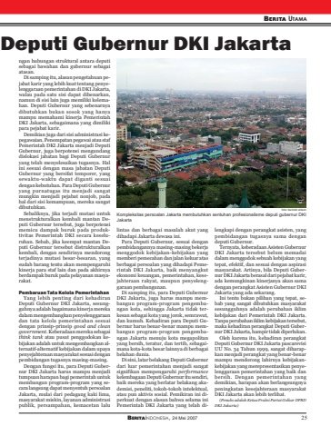 BERITAINDONESIA, 24 Mei 2007 25BERITA UTAMA Deputi Gubernur DKI Jakartangan hubungan struktural antara deputisebagai bawahan dan gubernur sebagaiatasan.Di samping itu, alasan pengetahuan pejabat karir yang lebih kuat tentang penyelenggaraan pemerintahan di DKI Jakarta,walau pada satu sisi dapat dibenarkan,namun di sisi lain juga memiliki kelemahan. Deputi Gubernur yang sebenarnyadibutuhkan bukan sosok yang hanyamampu memahami kinerja PemerintahDKI Jakarta, sebagaimana yang dimilikipara pejabat karir.Demikian juga dari sisi administrasi kepegawaian. Penempatan pegawai atau stafPemerintah DKI Jakarta menjadi DeputiGubernur, juga berpotensi mengundangdislokasi jabatan bagi Deputi Gubernuryang telah menyelesaikan tugasnya. Halini sesuai dengan masa jabatan DeputiGubernur yang bersifat temporer, yangsewaktu-waktu dapat diganti sesuaidengan kebutuhan. Para Deputi Gubernuryang purnatugas itu menjadi sangatmungkin menjadi pejabat nonjob, padahal dari sisi kemampuan, mereka sangatdibutuhkan.Sebaliknya, jika terjadi mutasi untukmenstrukturalkan kembali mantan Deputi Gubernur tersebut, juga berpotensimemicu dampak buruk pada produktivitas Pemerintah DKI secara keseluruhan. Sebab, jika keempat mantan Deputi Gubernur tersebut distrukturalkankembali, dengan sendirinya mendorongterjadinya mutasi besar-besaran, yangsudah barang tentu akan mempengaruhikinerja para staf lain dan pada akhirnyaberdampak buruk pada pelayanan masyarakat.Pembaruan Tata Kelola PemerintahanYang lebih penting dari kehadiranDeputi Gubernur DKI Jakarta, sesungguhnya adalah bagaimana kinerja merekadalam mengembangkan penyelenggaraandan tata kelola pemerintahan sesuaidengan prinsip-prinsip good and cleangovernment. Keberadaan mereka sebagaithink tank atau pusat penggodokan kebijakan adalah untuk mengembangkan alternatif-alternatif kebijakan dalam upayapenyejahteraan masyarakat sesuai denganpembidangan tugasnya masing-masing.Dengan fungsi itu, para Deputi Gubernur DKI Jakarta harus mampu menjaditumpuan harapan bagi pemerintah untukmembangun program-program yang secara langsung dapat menyentuh persoalanJakarta, mulai dari pedagang kaki lima,masyarakat miskin, layanan administrasipublik, persampahan, kemacetan lalulintas dan berbagai masalah akut yangdihadapi Jakarta dewasa ini.Para Deputi Gubernur, sesuai denganpembidangannya masing-masing bekerjamenggodok kebijakan-kebijakan yangmemberi pemecahan dan jalan keluar atasberbagai persoalan yang dihadapi Pemerintah DKI Jakarta, baik menyangkutekonomi keuangan, pemerintahan, kesejahteraan rakyat, maupun penyelenggaraan pembangunan.Di samping itu, para Deputi GubernurDKI Jakarta, juga harus mampu membangun program-program pengembangan kota, sehingga Jakarta tidak terkesan sebagai kota yang jorok, semrawut,dan kumuh. Kehadiran para Deputi Gubernur harus benar-benar mampu membangun program-program pengembangan Jakarta menuju kota megapolitanyang bersih, teratur, dan tertib, sebagaimana kota-kota besar lainnya di berbagaibelahan dunia.Di sini, latar belakang Deputi Gubernurdari luar pemerintahan menjadi sangatsignifikan mempengaruhi performancekelembagaan Deputi Gubernur itu sendiri,baik mereka yang berlatar belakang akademisi, peneliti, tokoh-tokoh intelektual,atau pun aktivis sosial. Pemikiran ini diperkuat dengan alasan bahwa selama iniPemerintah DKI Jakarta yang telah dilengkapi dengan perangkat asisten, yangpembidangan tugasnya sama dengandeputi Gubernur.Ternyata, keberadaan Asisten GubernurDKI Jakarta tersebut belum memadaidalam menggodok sebuah kebijakan yangtepat, efektif, dan sesuai dengan aspirasimasyarakat. Artinya, bila Deputi Gubernur DKI Jakarta berasal dari pejabat karir,ada kemungkinan kinerjanya akan samadengan perangkat Asisten Gubernur DKIJakarta yang ada sekarang.Ini tentu bukan pilihan yang tepat, sebab yang sangat dibutuhkan masyarakatsesungguhnya adalah perubahan iklimkebijakan dari Pemerintah DKI Jakarta.Tanpa perubahan iklim kebijakan tersebut,maka kehadiran perangkat Deputi Gubernur DKI Jakarta, hampir tidak diperlukan.Oleh karena itu, kehadiran perangkatDeputi Gubernur DKI Jakarta pascarevisiUU No. 34 Tahun 1999, sangat diharapkan menjadi perangkat yang benar-benarmampu mendorong lahirnya kebijakankebijakan yang merepresentasikan penyelenggaraan pemerintahan yang baik danbersih. Dengan pemerintahan yangdemikian, harapan akan berlangsungnyapeningkatan kesejahteraan masyarakatDKI Jakarta akan lebih terlihat.(Penulis adalah Ketua Fraksi Partai Golkar DPRDDKI Jakarta)Kompleksitas persoalan Jakarta membutuhkan sentuhan profesionalisme deputi gubernur DKIJakartafoto: berindo wilson