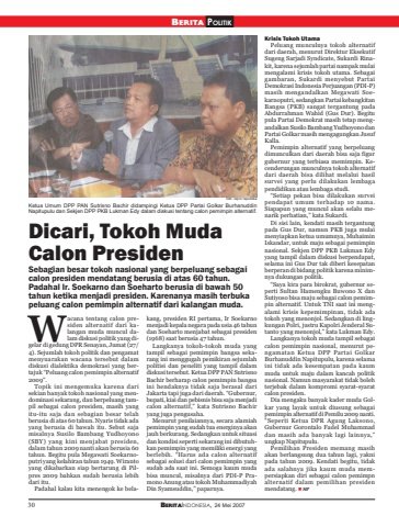 30 BERITAINDONESIA, 24 Mei 2007BERITA POLITIKDicari, Tokoh MudaCalon PresidenSebagian besar tokoh nasional yang berpeluang sebagaicalon presiden mendatang berusia di atas 60 tahun.Padahal Ir. Soekarno dan Soeharto berusia di bawah 50tahun ketika menjadi presiden. Karenanya masih terbukapeluang calon pemimpin alternatif dari kalangan muda.acana tentang calon presiden alternatif dari kalangan muda muncul dalam diskusi politik yang digelar di gedung DPR Senayan, Jumat (27/4). Sejumlah tokoh politik dan pengamatmenyuarakan wacana tersebut dalamdiskusi dialektika demokrasi yang bertajuk “Peluang calon pemimpin alternatif2009”.Topik ini mengemuka karena darisekian banyak tokoh nasional yang mendominasi sekarang, dan berpeluang tampil sebagai calon presiden, masih yangitu-itu saja dan sebagian besar telahberusia di atas 60 tahun. Nyaris tidak adayang berusia di bawah itu. Sebut sajamisalnya Susilo Bambang Yudhoyono(SBY) yang kini menjabat presiden,dalam tahun 2009 nanti akan berusia 60tahun. Begitu pula Megawati Soekarnoputri yang kelahiran tahun 1949. Wirantoyang dikabarkan siap bertarung di Pilpres 2009 bahkan sudah berusia lebihdari itu.Padahal kalau kita menengok ke belakang, presiden RI pertama, Ir Soekarnomenjadi kepala negara pada usia 46 tahundan Soeharto menjabat sebagai presiden(1968) saat berusia 47 tahun.Langkanya tokoh-tokoh muda yangtampil sebagai pemimpin bangsa sekarang ini menggugah pemikiran sejumlahpolitisi dan peneliti yang tampil dalamdiskusi tersebut. Ketua DPP PAN SutrisnoBachir berharap calon pemimpin bangsaini hendaknya tidak saja berasal dariJakarta tapi juga dari daerah. “Gubernur,bupati, kiai dan pebisnis bisa saja menjadicalon alternatif,” kata Sutrisno Bachiryang juga pengusaha.Menurut penilaiannya, secara alamiahpemimpin yang sudah tua energinya akanjauh berkurang. Sedangkan untuk situasidan kondisi seperti sekarang ini dibutuhkan pemimpin yang memiliki energi yangberlebih. “Harus ada calon alternatifsebagai solusi dari calon pemimpin yangsudah ada saat ini. Semoga kaum mudabisa muncul, misalnya dari PDI-P Pramono Anung atau tokoh MuhammadiyahDin Syamsuddin,” paparnya.Krisis Tokoh UtamaPeluang munculnya tokoh alternatifdari daerah, menurut Direktur EksekutifSugeng Sarjadi Syndicate, Sukardi Rinakit, karena sejumlah partai nampak mulaimengalami krisis tokoh utama. Sebagaigambaran, Sukardi menyebut PartaiDemokrasi Indonesia Perjuangan (PDI-P)masih mengandalkan Megawati Soekarnoputri, sedangkan Partai kebangkitanBangsa (PKB) sangat tergantung padaAbdurrahman Wahid (Gus Dur). Begitupula Partai Demokrat masih tetap mengandalkan Susilo Bambang Yudhoyono danPartai Golkar masih mengagungkan JusufKalla.Pemimpin alternatif yang berpeluangdimunculkan dari daerah bisa saja figurgubernur yang terbiasa memimpin. Kecenderungan munculnya tokoh alternatifdari daerah bisa dilihat melalui hasilsurvei yang perlu dilakukan lembagapendidikan atau lembaga studi.“Setiap pekan bisa dilakukan surveipendapat umum terhadap 10 nama.Siapapun yang muncul akan selalu menarik perhatian,” kata Sukardi.Di sisi lain, kendati masih tergantungpada Gus Dur, namun PKB juga mulaimenyiapkan ketua umumnya, MuhaiminIskandar, untuk maju sebagai pemimpinnasional. Sekjen DPP PKB Lukman Edyyang tampil dalam diskusi berpendapat,selama ini Gus Dur tak diberi kesepatanberperan di bidang politik karena minimnya dukungan politik.“Saya kira para birokrat, gubernur seperti Sultan Hamengku Buwono X danSutiyoso bisa maju sebagai calon pemimpin alternatif. Untuk TNI saat ini mengalami krisis kepemimpinan, tidak adatokoh yang menonjol. Sedangkan di lingkungan Polri, justru Kapolri Jenderal Sutanto yang menonjol,” kata Lukman Edy.Langkanya tokoh muda tampil sebagaicalon pemimpin nasional, menurut pengamatan Ketua DPP Partai GolkarBurhanuddin Napitupulu, karena selamaini tidak ada kesempatan pada kaummuda untuk maju dalam kancah politiknasional. Namun masyarakat tidak bolehterjebak dalam kompromi syarat-syaratcalon presiden.Dia mengaku banyak kader muda Golkar yang layak untuk diusung sebagaipemimpin alternatif di Pemilu 2009 nanti.“Seperti Ketua DPR Agung Laksono,Gubernur Gorontalo Fadel Muhammaddan masih ada banyak lagi lainnya,”ungkap Napitupulu.Pemilihan Presiden memang masihakan berlangsung dua tahun lagi, yaknipada tahun 2009. Kendati begitu, tidakada salahnya jika kaum muda mempersiapkan diri sebagai calon pemimpnalternatif dalam pemilihan presidenmendatang. SPWKetua Umum DPP PAN Sutrisno Bachir didampingi Ketua DPP Partai Golkar BurhanuddinNapitupulu dan Sekjen DPP PKB Lukman Edy dalam diskusi tentang calon pemimpin alternatif.foto: repro republika