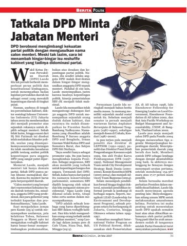 BERITAINDONESIA, 24 Mei 2007 31Tatkala DPD MintaJabatan MenteriDPD berobsesi mengimbangi kekuatanpartai politik dengan mengusulkan namacalon menteri. Meski tak lazim, cara inimenambah hingar-bingar isu reshufflekabinet yang tadinya didominasi partai.akil Ketua Dewan Perwakilan Daerah(DPD) LaodeIda tak pernah berhenti memperkuat peran politik dankonstitusional lembaganya,untuk menempatkan badanlegislasi perwakilan daerah inisebagai senat yang mewakilikepentingan daerah di tingkatpusat.Namun, anehnya di tengahisu perombakan kabinet, doktor sosiologi lulusan Universitas Indonesia (UI) Jakartatahun 2002 itu memberanikandiri menjadi promotor atassejumlah rekannya untuk dipilih sebagai menteri. Sebabtidak lazim, hingga suami dariHj Siti Fatimah ini disebuttelah melakukan blunder politik, usulan yang disampaikannya secara terang-teranganitu telah membuka kesadaranpublik tentang ambisi politikkepentingan para anggotaDPD yang sangat patut dipertanyakan.Menurut Laode, menjadimenteri tak hanya domainpartai. Sebab DPD punya peran khusus memajukan daerah. Karena itu menteri haruspula berperspektif daerah.“Calon menteri yang berasaldari representasi kekuatan basis daerah tertentu itu, misalnya, anggota DPD yang profesional, dan para gubernur yangterbukti kapasitas dan profesionalitasnya,” kata Laode.Saat mengadakan jumpapers Kamis (25/4) untuk menyampaikan usulannya, priakelahiran Tobea, SulawesiTenggara 12 Maret 1961 inimengatakan reshuffle kabinetharus benar-benar mempertimbangkan profesionalitas,W bukan atas desakan dan kepentingan partai politik. Namun, dia sendiri selaku anggota DPD malah ikut-ikutandalam hingar-bingar mengusulkan anggopta DPD masukmenteri. Padahal di sisi lain,Laode menyimpulkan, justrukarena kuatnya kepentinganpolitik, kinerja pemerintahanSBY-JK menjadi tidak maksimal.Laode Ida memastikan telahmengantongi dukungan dari30 anggota DPD untuk menempatkan sejumlah orangduduk dalam kabinet, dansuratnya itu sudah disampaikan ke Presiden SusiloBambang Yudhoyono. Namanama yang diusulkan adalahBambang P Suroso anggotaDPD asal Bengkulu, IrmanGusman Wakil Ketua DPD asalSumatera Barat, dan SekjenDPD Siti Nurbaya.“Saya sendiri hanya sebagaipromotor saja. Itu pun hanyamenghimbau kepada Presiden. Sebagai negarawan, SBYakan memilih yang terbaikuntuk kepentingan bangsa dannegara. Termasuk dari DPD.Sebab, kalau hanya dari parpolitu namanya konservatismeparlementer, sementara SBYdipilih langsung oleh rakyatdan kita menganut sistem presidensial,” tegas Laode yangdikenal selalu kritis, tetapitulus serta santun dalam menyampaikannya.“DPD adalah sebuah lembaga yang harus diperhitungkan SBY dalam reshuffle kabinet. Dan kita telah mengusulkan orang-orang terbaik untukdijadikan menteri,” ucap Laode lagi dalam jumpa pers diCafe Ulam, Nusa Dua, Bali,Minggu (29/4).Pernyataan Laode Ida seringkali menjadi bahan beritamedia massa. Ia memang memiliki sejumlah modal sosialuntuk itu. Sebelum menjadisenator ia pernah menjadiwartawan harian AngkatanBersenjata di Sulawesi Tenggara (1987-1990), sekaligusmenjadi dosen di Unhalu, Kendari (1987-2000).Ia pun terjun pula menjadipeneliti dan direktur diLEPPSEK (1991-1999), peneliti dan Direktur Pusat StudiPengembangan Kawasan sejak1999, tim ahli Fraksi KaryaPembangunan DPR (1997-1999), National ManagementTeam untuk City DevelopmentStrategy Bank Dunia (2001-2002), Komisi Konstitusi MPR(2003-2004), dan menjadi Advisory Team Bappenas (2004).Selain menempuh pendidikan formal hingga tingkat doktoral, sejumlah pendidikan informal pernah ia jambangi diberbagai negara. Seperti, mengikuti LEAD (Leadership forEnvironment and Development Program), sebuah program setara S2 berlangsung diJakarta, Costarica, hinggaOkinawa selama tahun 1995-1997.Kemudian mengikuti International Visitor Program onUS Political System, dilaksanakan oleh PemerintahanAS, di AS tahun 1998, laluEisenhower Fellowship forEmerging Leader on Local Government, Eisenhower Foundation di AS tahun 2002, danikut Asia Pacific Workshop onBudget Management and Accountability, UNDP, di Bangkok, Thailand tahun 2002.Laode pun maju menjadicalon DPD pada Pemilu 2004dengan menawarkan tiga agenda: Memperjuangkan kepentingan daerah; Menciptakan pemerintah daerah yangbersih dan baik; Membericontoh DPD sebagai lembagadengan derajat akuntabilitasyang baik. Ia akhirnya melenggang ke Senayan denganmenempati urutan pertama,setelah mendulang 154.367suara atau 17,17 persen suarapemilih. Selain berusaha merebutperhatian Presiden dalam memilih skuad kabinet, Laode Idamasih menyimpan agendapenting lain: Menyelenggarakan sidang umum MPR untukmelaksanakan amandemenkelima. Peristiwa ini mahapenting untuk menentukannasib DPD apakah semakinkuat atau akan dikucilkan selamanya oleh partai politik.Yang pasti tiket ke arah amandemen sudah di tangannyasetelah Partai Demokrat turutmenyatakan persetujuan. HTBERITA POLITIK