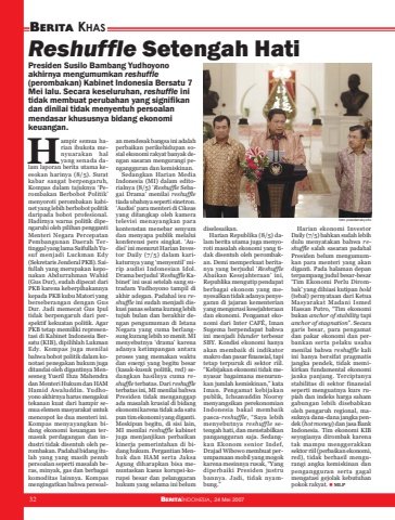 32 BERITAINDONESIA, 10 Agustus 2006BERITA KHAS32 BERITAINDONESIA, 24 Mei 2007Reshuffle Setengah HatiPresiden Susilo Bambang Yudhoyonoakhirnya mengumumkan reshuffle(perombakan) Kabinet Indonesia Bersatu 7Mei lalu. Secara keseluruhan, reshuffle initidak membuat perubahan yang signifikandan dinilai tidak menyentuh persoalanmendasar khususnya bidang ekonomikeuangan.ampir semua harian ibukota menyuarakan halyang senada dalam laporan berita utama keesokan harinya (8/5). Suratkabar sangat berpengaruh,Kompas dalam tajuknya ‘Perombakan Berbobot Politik’menyoroti perombakan kabinet yang lebih berbobot politikdaripada bobot profesional.Hadirnya warna politik dipengaruhi oleh pilihan penggantiMenteri Negara PercepatanPembangunan Daerah Tertinggal yang lama Saifullah Yusuf menjadi Luckman Edy(Sekretaris Jenderal PKB). Saifullah yang merupakan keponakan Abdurrahman Wahid(Gus Dur), sudah dipecat dariPKB karena keberpihakannyakepada PKB kubu Matori yangberseberangan dengan GusDur. Jadi memecat Gus Ipultidak berpengaruh dari perspektif kekuatan politik. AgarPKB tetap memiliki representasi di Kabinet Indonesia Bersatu (KIB), dipilihlah LukmanEdy. Kompas juga menilaibahwa bobot politik dalam konotasi penegakan hukum jugaditandai oleh digantinya Mensesneg Yusril Ihza Mahendradan Menteri Hukum dan HAMHamid Awaluddin. Yudhoyono akhirnya harus mengakuitekanan kuat dari hampir semua elemen masyarakat untukmencopot ke dua menteri ini.Kompas menyayangkan bidang ekonomi keuangan termasuk perdagangan dan industri tidak disentuh oleh perombakan. Padahal bidang itulah yang yang masih penuhpersoalan seperti masalah beras, minyak, gas dan berbagaikomoditas lainnya. Kompasmengingatkan bahwa persoalan mendesak bangsa ini adalahperbaikan perikehidupan sosial ekonomi rakyat banyak dengan sasaran mengurangi pengangguran dan kemiskinan.Sedangkan Harian MediaIndonesia (MI) dalam editorialnya (8/5) ‘Reshuffle Sebagai Drama’ menilai reshuffletiada ubahnya seperti sinetron.‘Audisi’ para menteri di Cikeasyang ditangkap oleh kameratelevisi menayangkan parakontenstan menebar senyumdan menyapa publik melaluikonferensi pers singkat. ‘Audisi’ ini menurut Harian Investor Daily (7/5) dalam karikaturnya yang ‘menyentil’ mirip audisi Indonesian Idol.Drama berjudul ‘Reshuffle Kabinet’ ini usai setelah sang sutradara Yudhoyono tampil diakhir adegan. Padahal isu reshuffle ini sudah menjadi diskusi panas selama kurang lebihtujuh bulan dan berakhir dengan pengumuman di IstanaNegara yang cuma berlangsung kurang lebih 10 menit. MImenyebutnya ‘drama’ karenaadanya ketimpangan antaraproses yang memakan waktudan energi yang begitu besar(kasak-kusuk politik, red) sedangkan hasilnya cuma reshuffle terbatas. Dari reshuffleterbatas ini, MI menilai bahwaPresiden tidak menganggapada masalah krusial di bidangekonomi karena tidak ada satupun tim ekonomi yang diganti.Meskipun begitu, di sisi lain,MI menilai reshuffle kabinetjuga menjanjikan perbaikankinerja pemerintahan di bidang hukum. Pergantian Menhuk dan HAM serta JaksaAgung diharapkan bisa menuntaskan kasus korupsi-korupsi besar dan pelanggaranhukum yang selama ini belumdiselesaikan.Harian Republika (8/5) dalam berita utama juga menyoroti masalah ekonomi yang tidak disentuh oleh perombakan. Demi memperkuat beritanya yang berjudul ‘ReshuffleAbaikan Kesejahteraan’ ini,Republika mengutip pendapatberbagai ekonom yang menyesalkan tidak adanya penyegaran di jajaran kementerianyang mengurusi kesejahteraandan ekonomi. Pengamat ekonomi dari Inter CAFÉ, ImanSugema berpendapat bahwaini menjadi blunder terbesarSBY. Kondisi ekonomi hanyaakan membaik di indikatormakro dan pasar finansial, tapitetap terpuruk di sektor riil.“Kebijakan ekonomi tidak menyasar bagaimana menurunkan jumlah kemiskinan,” kataIman. Pengamat kebijakanpublik, Ichsanuddin Noorsymenyangsikan perekonomianIndonesia bakal membaikpasca-reshuffle, “Saya lebihmenyebutnya reshuffle setengah hati, dan menstabilkanpangangguran saja. Sedangkan Ekonom senior Indef,Drajad Wibowo membuat perumpamaan mobil yang mogokkarena mesinnya rusak, “Yangdiperbaiki Presiden justrubannya. Jadi, tidak nyambung.”Harian ekonomi InvestorDaily (7/5) bahkan sudah lebihdulu menyatakan bahwa reshuffle salah sasaran padahalPresiden belum mengumumkan para menteri yang akandiganti. Pada halaman depanterpampang judul besar-besar‘Tim Ekonomi Perlu Dirombak’ yang dihiasi kutipan bold(tebal) pernyataan dari KetuaMasyarakat Madani IsmedHassan Putro, “Tim ekonomibukan anchor of stability tapianchor of stagnation”. Secaragaris besar, para pengamatdan pakar ekonomi dan perbankan serta pelaku usahamenilai bahwa reshuffle kaliini hanya bersifat pragmatisjangka pendek, tidak memikirkan fundamental ekonomijanka panjang. Terciptanyastabilitas di sektor finansialseperti menguatnya kurs rupiah dan indeks harga sahamgabungan lebih disebabkanoleh pengaruh regional, masuknya dana-dana jangka pendek (hot money) dan jasa BankIndonesia. Tim ekonomi KIBseyogianya dirombak karenatak mampu menggerakkansektor riil (perbaikan ekonomi,red), tidak berhasil mengurangi angka kemiskinan danpengangguran serta gagalmengatasi gejolak kebutuhanpokok rakyat. MLPHfoto: presidensby.info