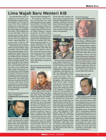BERITAINDONESIA, 10 Agustus 2006 33BERITA KHASBERITAINDONESIA, 24 Mei 2007 33Lima Wajah Baru Menteri KIBDari segi keterwakilan politik, perombakan ini tak membuat perubahan signifikan. Kalangan nonpartai bertambah dari 18 menjadi 19orang. Partai Golkar memperolehtambahan satu kursi kabinet, menjadi empat kursi. PPP mengalamipenyusutan wakil dari tiga menjadidua menteri. PBB mengalami penurunan keterwakilan, hanya menguasai satu kursi menteri. Sementara PKS, PKB, PAN, Partai Demokrat, dan PKPI tak mengalami perubahan tingkat keterwakilan. Penyusutan wakil di PBB dan PPPmembuat kedua partai ini kecewa.Empat menteri yang dicopot dariKabinet Indonesia Bersatu dalamperombakan kabinet kedua adalahMenteri Sekretaris Negara Yusril Ihza Mahendra, Menteri Hukum danHAM Hamid Awaludin, Menteri Negara BUMN Sugiharto, dan MenteriNegara Percepatan PembangunanDaerah Tertinggal Saifullah Yusuf,serta Jaksa Agung Abdul RahmanSaleh. Presiden juga mengumumkan empat menteri barunya, yaituMenteri Hukum dan HAM Andi Mattalata, Menteri Perhubungan Jusman Syafii Djamal, Menteri NegaraPercepatan Pembangunan DaerahTertinggal M Lukman Edy, dan Menteri Komunikasi dan Informatika Mohammad Nuh, serta Jaksa AgungHendarman Supandji. Menteri Perhubungan Hatta Rajasa dirotasimenjadi Menteri Sekretaris Negara,Menteri Komunikasi dan InformatikaSofyan Djalil dirotasi menjadi Menteri Negara BUMN.Menteri Percepatan PembangunanDaerah Tertinggal (PDT)Ir H Muhammad Lukman Edy, Msi(37 th)bangunan Daerah Tertinggal (PDT).Pria kelahiran Teluk Pinang,Riau, 26 November 1970, yangjuga pengusaha ini pernah mengecap pendidikan di Fakultas TeknikUniversitas Brawijaya, Malang, S2di Universitas Pajajaran, dan kinimenjalani program S3 di Universitas Malaya, Malaysia. Sebagaipengusaha, dia aktif di bidangkonstruksi di bawah bendera PTInti Group dan menjadi Ketua DPDGapensi, Riau, Ketua Bidang Sertifikasi dan Akreditasi Kadin Riau,Ketua Asosiasi Kontraktor Air Indonesia (AKAINDO) Riau, KetuaBidang Perencanaan dan Anggaran KONI Riau (2004-2009). Diajuga pemilik sejumlah media diRiau. Suami dari Hj Gustini Zuliaty,Sag, dengan tiga anak ini berjanjiakan menjalankan tugas sebaikbaiknya. Ia menyadari nuansapolitis jabatannya kecil, namunkalau tidak berhasil, ia tetap bisadimaki-maki.Menteri Komunikasi dan InformasiProf Dr Ir Mohammad Nuh DEA(48 th)Rumah Sakit Islam Surabaya, danKetua Yayasan Pendidikan Al IslahSurabaya. Sebagai Menkoinfo, Nuhberambisi memadukan informasidengan teknologi sehingga mampumenggerakkan pendidikan, ekonomi dan pemerintahan. Menurutnya informasi menjadi penentuutama di era globalisasi.Jaksa AgungHendarman Supandji, SH (60 th)Menteri PerhubunganIr Jusman Syafii Djamal (53 th)Tidak banyak yang mendugaLukman Edy yang saat ini menjadiSekjen DPP Partai KebangkitanBangsa (PKB) masuk dalam jajaranKabinet Indonesia Bersatu menggantikan posisi Saifullah Yusufsebagai Menteri Percepatan PemMantan Rektor Institut TeknologiSurabaya (2003-2006), ini menggantikan posisi Sofyan Djalil sebagaiMenteri Komunikasi dan Informasi.Nuh adalah alumni JurusanTeknik Elektro ITS tahun 1983,pendidikan S2 dan S3 dia tempuhdi jurusan Teknik Biomedik Universite Science et Technique du Languedoc, Monpellier, Prancis. Berkat ketekunannya, oleh ITS dia dikukuhkan menjadi guru besar bidang ilmu Digital Control Systemdengan spesialisasi Sistem Rekayasa Biomedika pada tahun 2004.Pria ini tidak banyak aktif dibidang politik, namun dia adalahKetua Ikatan Cendekiawan MuslimIndonesia (ICMI) Jawa Timur, danaktif di kegiatan sosial sepertiSekretaris Yayasan Dana Sosial AlFalah Surabaya, pengurus YayasanNamanya makin banyak dikenalorang setelah menjadi Ketua TimPemberantasan Tindak PidanaKorupsi. Sejak dibentuk Mei 2005hingga selesai masa tugasnya,Timtastipikor mengklaim telah menyelamatkan uang negara Rp 3,95triliun dari tangan pelaku korupsi.Kini, alumni Fakultas Hukum Universitas Diponegoro (1972) inimempunyai segudang PR yangditinggalkan oleh pendahulunyaAbdul Rahman Saleh. SebagaiJaksa Agung, Hendarman berjanjimenuntaskan sejumlah kasuskorupsi besar seperti kasus BLBI,VLCC Pertamina, PT Merpati Nusantara dan kasus pengadaan alatdeteksi serta pencairan dana Tommy Soeharto yang diduga melibatkan mantan Menkum dan HAM Hamid Awaluddin dan mantan Mensesneg Yusril Ihza Mahendra. Priakelahiran Klaten, 6 Januari 1947 ini,sejak awal berkarier di kejaksaan.Ia pernah bertugas di Kejari JakartaPusat (1979-1981), Pusat OperasiIntelijen Kejaksaan Agung (1982-1983), Atase Kejaksaan di KBRIBangkok (1990-1995). Kemudian,Asisten Perdata dan TUN di KejatiPalembang (1996-1997), Staf khusus Jaksa Agung (1998), KepalaBiro Keuangan Kejaksaan Agung(1998-2002), Jaksa tinggi di DIYdan Sekretaris Jaksa Agung MudaPengawasan sebelum dipilih menjadi JAM Pidsus 25 April 2005 lalu(2002-2004).Jusman yang pernah menjadi Direktur Utama PT Dirgantara Indonesia, dan anggota Timnas Evaluasi Keselamatan dan Keamanan Transportasi ini diangkat Presiden menggantikan posisi Hatta Radjasa sebagaiMenteri Perhubungan. Pria kelahiranLangsa, Aceh Timur, 28 Juli 1954 iniadalah alumni Teknik Mesin JurusanPenerbangan ITB tahun 1982 yangbanyak berkecimpung di bidang pembuatan pesawat terbang. Menteri yangkini masih menjabat sebagai ChairmanMatshusita Gobel Education Foundation ini menyatakan bahwa prioritasutamanya membenahi sektor perhubungan adalah roadmap to zero accident. Salah satunya adalah mengurangi tingkat anjlok kereta api.Menteri Hukum dan HAMAndi Mattalata (53 th)Politisi yang juga salah satu ketuadi DPP Partai Golkar dan kini menjadiKetua Fraksi Partai Golkar di DPRini menggantikan rekan satu almamaternya di Fakultas Hukum Universitas Hasanuddin, Hamid Awaluddinsebagai Menteri Hukum dan HAM.Pria kelahiran Bone, 30 September1954 ini, menyelesaikan pendidikanS2-nya, juga bidang hukum di Universitas Indonesia. Mantan dosen FHUnhas yang dikenal sangat dekatdengan banyak politisi dari berbagaipartai ini menyatakan akan mempriopritaskan diri dalam usahamengembalikan kepercayaan rakyatterhadap keseriusan pem
