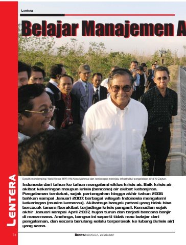 34 BERITAINDONESIA, 24 Mei 2007 L ENTERA34LenteraIndonesia dari tahun ke tahun mengalami siklus krisis air. Baik krisis airakibat kekeringan maupun krisis (bencana) air akibat kebanjiran.Pengalaman terdekat, sejak pertengahan hingga akhir tahun 2006bahkan sampai Januari 2007, berbagai wilayah Indonesia mengalamikekeringan (musim kemarau). Akibatnya banyak petani yang tidak bisabercocok tanam (berakibat terjadinya krisis pangan). Kemudian sejakakhir Januari sampai April 2007, hujan turun dan terjadi bencana banjirdi mana-mana. Anehnya, bangsa ini seperti tidak mau belajar daripengalaman, dan secara berulang selalu terperosok ke lubang (krisis air)yang sama.Syaykh mendampingi Wakil Ketua MPR HM Aksa Mahmud dan rombongan meninjau infrastruktur pengelolaan air di Al-Zaytun.Belajar Manajemen A Belajar Manajemen A