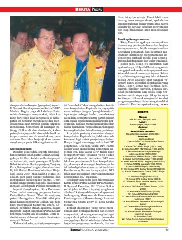 BERITAINDONESIA, 24 Mei 2007 45BERITA PROFILdan para hato-bangon (pengetua) sepertiH Syamsi Harahap mantan Ketua DPRDMedan. Begitu juga di Labuhan Batu,selain dukungan masyarakat, tidak kurang dari tujuh kiai karismatik di kabupaten ini berikrar mendukung dan mendoakannya agar terpilih dalam Pilgubsumendatang. Sementara di kalangan petinggi Golkar di daerah-daerah, kabupaten/kota juga solid dan selalu berikrartanpa reserve untuk mendukung pencalonan Umri dan berjanji akan memenangkannya pada Pilkada gubsu nanti.Aset KebanggaanDisadari atau tidak, seperti diungkapkan sejumlah tokoh partai Golkar, sesungguhnya Ali Umri kelahiran Rantauprapat40 tahun lalu, anak pasangan H SyaifulBahri kelahiran Rantaupanjang TanjungPura, Kabupaten Langkat dan almarhumHj Siti Maliah Hasibuan kelahiran Binjaiasal Saba Jior, Mandailing Natal iniadalah aset yang sangat potensial danmerupakan kebanggaan partai. Umridinilai sangat pantas dan pas, dicalonkanmenjadi Gubsu pada Pilkada mendatang.Seperti diungkapkan, Riza FachrumiTaher, salah seorang pengurus harianPartai Golkar Sumut: “Umri itu aset yangpatut dibanggakan. Memiliki nilai plustidak hanya bagi partai Golkar, tapi jugabagi masyarakat Sumatera Utara. Didasari, penilaian itulah agaknya, dalamRapimda (Rapat Pimpinan) Partai Golkarbeberapa waktu lalu di Medan, Umri didaulat secara aklamasi untuk dicalonkanmenjadi Gubsu.”“Kalau ada kader, apalagi pengurus partai “membelot” dan mengabaikan komitmen kesepakatan Rapimda itu, saya pikirsama artinya dengan “pengkhianatan”.Apa wajar sebagai kader, mendukungcalon lain, sementara ketua partai sendiridari segala aspek memenuhi kriteria persyaratan, bahkan memiliki nilai plus daribalon-balon lain,“ tegas Riza menanggapikemungkin balon lain diusung partainya.Riza yakin partainya konsisten dengankesepakatan Rapimda itu, tidak akan adakonvensi lagi untuk penjaringan balon.Hanya tinggal menunggu waktu hari “H”penetapan. Dia juga yakin DPP PartaiGolkar akan mendukung komitmen Rapimda itu. Dia yakin DPP tidak akanmengintervensi tatanan yang sudahdisepakati daerah. Andaikan DPP melakukan pemaksaan di luar kesepakatanitu, eksesnya akan sangat berdampak fatal terhadap keberadaan partai itu dalamPemilu 2009. Karena itu saya yakin, DPPtidak akan melakukan intervensi merubahkesepakatan itu,” tegasnya.Pendapat yang sama juga dikemukakanKetua Fraksi Partai Golkar DPRD Sumut,H Syahrul Pasaribu, SH. “Calon Golkarsudah jelas, Ali Umri. Apalagi yang harusdibahas,” katanya dalam percakapan saatberlangsung Musyawarah PerencanaanPembangunan (Musrembang) ProvinsiSumatera Utara 2007 di Bina GrahaMedan.Terkait dukungan yang terus membludak dari berbagai daerah dan elemenmasyarakat, tak urung memang berbagaiupaya dari pihak tertentu berusahamenjegalnya. Itulah sebabnya dalam berbagai kunjungannya ke daerah, dia terlihat tetap bersahaja. Umri lebih cenderung terus mengevaluasi, apakah dukungan itu benar-benar murni atau hanyasekadar lip service, sebelum menyatakandiri siap dicalonkan atau mencalonkandiri.Bersikap KenegarawananSikap Umri itu agaknya menunjukkandia seorang pemimpin besar dan berjiwakenegarawanan, lebih mengutamakankeutuhan persatuan dan kesatuan masyarakat ketimbang mengutamakan kepentingan pribadi meski pun sesungguhnya hal itu pantas dan wajar diraihnya.Boleh jadi, sikap itu menurun dariayahandanya, H.Syaiful Bahri yang selalumengajarkan kesadaran tanpa pemaksaankehendak untuk mencapai tujuan. Selainitu, sifat orang-orang yang lahir di bawahzodiag Aries apalagi tepat tanggal “9”seperti Umri, memiliki kepribadian yangkhas. Tegar, keras tapi berjiwa seni,enerjik, familiar, inovatif, percaya diri,tidak pendendam dan selalu siap berkorban untuk siapa saja. Sikap itu sejakkecil seperti dikemukan sejumlah kerabatyang mengenalnya, diakui sangat melekatdalam diri Umri sampai sekarang. AEPBIODATANama:HM Ali Umri, SH,SpN, MKnLahir:Rantauprapat, 9 April 1966Agama:IslamPendidikan terakhir:Magister Kenotariatan, USU-2004Jabatan:- Walikota Binjai- Ketua DPD Tk I Partai Gokar SumutKarir:1. Ketua DPD AMPI Binjai (1993-1999)2. Sekretaris MPI KNPI Binjai (1997-2001)3. Sekretaris Ikatan Sarjana MelayuIndonesia Binjai (1999-2004)4. Bendahara MABMI Binjai (1999-2004)5. Ketua GAPENSI Langkat (1996-2000)6. Wakil Ketua KADIN Langkat (1997-2002)7. Ketua ARDIN Langkat (1995-1999)8. Ketua HIPPI Binjai (1994-1999)9. Wkl.Ketua DPD Golkar Binjai (19982003)10. Ketua Fraksi Partai Golkar DPRD Binjai(1999)11. Walikota Binjai (2000-2005)12. Ketua DPD Golkar Binjai (2004)13. Walikota Binjai periode kedua (2005-2010)14. Ketua DPD Partai Golkar Sumut (2004-2009)15. Ketua IKA-MKN Sumut (2005)16. Ketua GAMI Sumut (2005)17. Ketua Forum Komunikasi KenotariatanIndonesia (2007)18. Ketua Dewan Penasehat Al IttihadiyahSumut19. Dewan Penasehat Angkatan MudaSiliwangi Sumut20. Ketua Dewan Penasehat TarbiyahIslamiyah Sumut21. Presiden GAMI22. Ketua Forum Komunikasi KenotariatanIndonesia