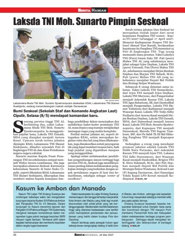 48 BERITAINDONESIA, 24 Mei 2007Laksda TNI Moh. Sunarto Pimpin SeskoalKasum ke Ambon dan ManadoKasum TNI Letjen TNI Endang Suwarya danrombongan beberapa waktu lalu mengadakankunjungan kerja ke Kodam XVI/Patimura Ambondan Pangkalan TNI AL VII Manado. Dalamkunjungan itu Kasum menerima laporan dariPangdam XVI/Patimura Mayjen TNI Sudarmaidymengenai kesiapan komandonya dalam mengemban tugas pokok menjaga keutuhan NKRImaupun tugas bantuan. Termasuk aktif dalamkegiatan kemanusiaan dan membantu kepolisiandalam rangka tugas keamanan.Dalam kesempatan itu Letjen Endang Suwaryamerasa kagum dan bangga terhadap masyarakatKota Ambon dan Maluku yang tidak lagi mudahterprovokasi oleh pihak-pihak yang tak bertanggungjawab. Mereka telah memiliki ketahanantinggi yang dilandasi kedewasaan cara berfikiruntuk menciptakan perdamaian dan persaudaraan yang hakiki dalam budaya Pela danGandong.Kasum berharap pada penegak hukum agarbekerja keras mengungkap dalang di balik bomdi Maluku dan Ambon, sehingga ada kepastianhukum bagi masyarakat sekaligus memberi efekjera pada pelaku lainnya.Endang Suwarya berpesan kepada masyarakat setempat untuk menjalin kerja samadan koordinasi dengan TNI maupun Polrimembantu Pemerintah Kota dan Kabupatendalam melaksanakan berbagai program pembangunan. Sehingga dapat mengatasi ketertinggalan dan keterpurukan di berbagaibidang. RON, SPBumi Seskoal (Sekolah Staf dan Komando Angkatan Laut)Cipulir, Selasa (8/5) mendapat komandan baru.eorang perwira tinggi TNI ALberbintang dua, yakni Laksamana Muda TNI Moh. SunartoSjoekronoputra. Ia menggantikan pejabat lama, Laksda TNI Gunadi,MDA yang diangkat menjadi AsrenaKasal. Upacara serah terima jabatandipimpin KSAL Laksamana TNI SlametSoebijanto, dihadiri sejumlah Pati dilingkungan TNI AL dan Atase Pertahanannegara-negara sahabat.Sunarto mantan Kepala Pusat Penerangan TNI ini sebelumnya sempat menjadi Widya Iswara Lemhannas. Dia jugamerupakan alumnus Seskoal. Karenanyakeberadaan Sunarto di bumi Sesko Cipulir, seperti dikatakan KSAL LaksamanaTNI Slamet Soebijanto, diharapkan bisamemberi makna kepada kemajuan lembaga pendidikan dalam menyiapkan danmelahirkan kader-kader pemimpin TNIAL masa depan yang mampu menghadapitantangan tugas yang makin kompleks.Perihal mutasi jabatan ini, seperti ditegaskan KSAL, selain merupakan kegiatan rutin dan hal yang biasa dilaksanakan, juga dimaksudkan untuk penyegaranide yang dapat memberi nuansa baru, baikbagi pejabat yang digantikan maupunyang menggantikan.Apalagi selain melaksanakan pendidikan pengembangan umum tertinggi bagiperwira TNI AL, Seskoal juga memiliki peranan penting dalam melaksanakan pengkajian strategis yang berkaitan dengan aspek pertahanan negara di laut dan kemaritiman, sekaligus sebagai ‘center ofexcellence”.Serah terima jabatan Dan Seskoal inimerupakan tindak lanjut dari suratkeputusan Panglima TNI nomor : Kep/21/IV/2007 tertanggal 17 April 2007.Menurut Kadispenum Puspen TNI Kolonel Ahmad Yani Basuki, berdasarkankeputusan itu Panglima TNI memutasi 15Pati di lingkungan TNI. Tiga orangmemasuki masa pensiun. Yakni LaksdyaTNI (Purn) Imam Zaky NP, Pati (purn)Mabes TNI AL yang sebelumnya menjabat sebagai Irjen Dephan, Laksda TNI(purn) Yuwendi, Pati (Purn) Mabes TNIAL, sebelumnya menjabat Dirjen RenhanDephan dan Mayjen TNI Suhadi, M.Sc,Pati (purn) Mabes TNI AD yang sebelumnya menjabat Deputi Bid Politikdan Strategi Setjen Wantanas.Sebanyak 8 orang dimutasi antar jabatan. Yakni Laksda TNI Sumardjono,dari Irjen TNI menjadi Irjen Dephan,Laksda TNI Muryono, dari Pangarmabarmenjadi Askomlek Kasum TNI, LaksdaTNI Agus Suhartono, SE, dari Dankodikalmenjadi Pangarmabar, Laksda TNI Slamet Yulistiono dari Kadispenal menjadiWaasops Kasal, Laksda TNI Tedjo EdhyPudjiarto dari Asrena Kasal menjadi Dirjen Renhan Dephan, Laksda TNI Gunadi,MDA, dari Danseskoal menjadi AsrenaKasal, Laksda TNI Moh. Sunarto Sjoekronoputro, dari Kapuspen TNI menjadiDanseskoal, Marsda TNI Sagom Tamboen, SIP, dari Pa Sahli Tk III Bid Ekkudag Panglima TNI menjadi KapuspenTNI.Sedangkan 4 orang yang mendapatpromosi jabatan adalah Laksda TNIDidik Heru Purnomo, dari AskomlekKasum TNI menjadi Irjen TNI, LaksmaTNI Edhi Nuswantoro, dari WaasopsKasal menjadi Dankodikal, Brigjen TNIB. Heru Sukmadi, M.Sc, dari Pati Dephan menjadi Deputi Bid Politik danStrategis Setjen Wantanas, Kolonel Laut(P) Sugeng Darmawan, dari DansatgasYekda Kapal LPD Korsel menjadi Kadispenal. RON, SPSLaksamana Muda TNI Moh. Sunarto Sjoekronoputra disaksikan KSAL Laksamana TNI SlametSoebijanto, sedang menandatangani naskah sertijab Danseskoal.foto: berindo wilsonBERITA HANKAM