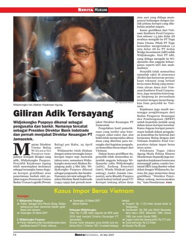 54 BERITAINDONESIA, 24 Mei 2007BERITA HUKUMGiliran Adik TersayangKasus Impor Beras VietnamTersangka:Widjokongko Puspoyo dikenal sebagaipengusaha dan bankir. Namanya tercatatsebagai Presiden Direktur Bank Indotradedan pernah menjabat Direktur Keuangan PTJamsostek.antan DirekturUtama BulogWidjanarkoPuspoyo tampaknya kompak dengan sangadik, Widjokongko Puspoyo.Penyidik Kejaksaan Agungtelah menetapkan keduanyasebagai tersangka kasus dugaan korupsi gratifikasi ataupenerimaan hadiah oleh pejabat negara Perseroan UmumBadan Urusan Logistik (PerumBulog) per Rabu, 25 April2007.Widjanarko telah ditahandengan status tersangka kasuskorupsi impor sapi Australiatahun 2001, sementara Widjokongko menyusul ditahan Kejakgung pada 3 Mei lalu. Widjokongko Puspoyo dikenalsebagai pengusaha dan bankir.Namanya tercatat sebagai Presiden Direktur Bank Indotrade(1993-1999) dan pernah menjabat Direktur Keuangan PTJamsostek.Pengolahan hasil pemeriksaan yang terdiri atas keterangan saksi-saksi dan alatbukti telah memperjelas alirandana yang diterima para tersangka dari kegiatan pengadaan komoditas beras impor dariVietnam.Dalam kasus gratifikasi itu,penyidik telah memeriksa sejumlah anggota keluarga Widjanarko yaitu Widjokongko(adik), Endang Ernawati(istri), Winda Nindyati (putrisulung), Andre Juanda (menantu), serta Rinaldy Puspoyo(anak kedua) terkait pasal UUKorupsi tentang aliran danaatau aset yang diduga mempunyai hubungan dengan tindak pidana korupsi yang dilakukan pejabat negara.Kasus gratifikasi dari Vietnam Southern Food Corporation sebesar 1,5 juta dolar ASawalnya mengalir ke PT TuguDana Utama. Pihak PT Tugukemudian mengirimkan 1,2juta dolar AS ke PT ArdenBridge Investment (ABI) milikWidjokongko. Dari PT ABI,uang diduga mengalir ke Widjanarko dan anggota keluarganya seperti istri dan anakanaknya.Penyidik telah memeriksasejumlah saksi di antaranyadireksi dan karyawan perusahaan rekanan yang terkaitkerja sama Bulog yang menerima aliran dana dari Vietnam Southern Food Corporation, juga meminta keterangan langsung ke perusahaantersebut dengan menerbangkan lima penyidik ke Vietnam.Kejaksaan juga masih menunggu penghitungan dariBadan Pengawas Keuangandan Pembangunan (BPKP)untuk kepastian jumlah uangdalam kasus korupsi tersebut.Kasus dugaan korupsi penerimaan hadiah dalam pengadaan komoditas itu berawal darikerjasama Bulog dengan dariVietnam Southern Food Corporation dalam impor beras2001-2002.Pelaksana Tugas JaksaAgung Muda Pidana KhususHendarman Supandji juga mengatakan kejaksaan berencanamemanggil paksa wanita berinisial ERN yang disebut-sebutdekat dengan Widjanarko, karena dia juga menerima danagratifikasi. “Direktur Penyidikan sedang merencanakanitu,” kata Hendarman. RH1. Widjanarko Puspoyofl Posisi: Sebagai Dirut Perum Bulog, Widjanseharusnya tidak menerima hadiah (gratifikasi) dari rekanan.fl Tersangka: 25 Maret 20072. Widjokongko Puspoyofl Peran: Menerima dan mendistribusikan danagratifikasi lewat PT Arden miliknya.fl Tersangka: 25 Maret 2007 Belum ditahanKekayaan Widjokongko:Total: Rp 11,088 miliar (laporan ke KPK pada2004 saat menjadi Direktur Keuangan PTJamsostek)Rincian harta kekayaan yang dimiliki pria kelahiran Solo, 7 Oktober 1951, ini adalah sebagaiberikut:fl Properti: Rp. 1,133 miliar (empat tanah diTangerang).fl Kendaraan: Rp 296 juta (Mobil MercedesBenz tahun 2000, Mitsubishi 1994, Honda1989, dan motor Honda 1996).fl Logam mulia dan barang antik: Rp 277 juta.fl Surat berharga: Rp 9,2 miliar.fl Meubel: Rp 88 juta.MWidjokongko kini ditahan Kejaksaan Agung. foto: repro jurnal nasional