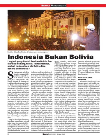 58 BERITAINDONESIA, 24 Mei 2007BERITA MANCANEGARAIndonesia Bukan BoliviaLangkah yang diambil Presiden Bolivia EvoMorales memang heroik. Pertanyaannya,apakah nasionalisasi ala Bolivia bisaberlaku di Indonesia?etahun yang lalu, EvoMorales menandai dimulainya sejarah baru di Bolivia. Dalampidatonya menyambut hariBuruh sedunia di ladang minyak San Alberto, negara bagian Tajira di selatan Bolivia,Evo Morales, yang baru menduduki kursi presiden selamalima bulan membuat keputusan yang tidak pernah beranidiambil oleh para presidenpendahulunya. Sebagai catatan, setidaknya dalam enam tahun terakhir sudah ada enampresiden di Bolivia yang datang dan pergi dalam waktuyang cepat. Dua presiden sebelumnya, Gonzalo Sanches deLozada dan Carlos Mesa diusirrakyatnya karena menempatkan diri sebagai pembela kepentingan korporasi asing, bukan kepentingan rakyat Bolivia.Saat itu, Evo Morales mengingatkan perusahaan minyakasing yang beroperasi di Bolivia untuk tunduk pada ketentuan proporsi pemilikan yangakan ditetapkan pemerintahBolivia. Selain itu, semua penjualan produk mereka juga diatur pemerintah Bolivia. “Jikamenolak, mereka kita persilakan keluar dari negeri ini.Saat ini, penjarahan sumberalam kita oleh perusahaanasing telah berakhir,” katanya.Morales berprinsip, “Tak adayang diberikan kapitalismekepada rakyat Bolivia, kecualikemiskinan dan penindasan.”Morales kemudian memberikan tenggat waktu enam bulan kepada perusahaan-perusahaan asing tersebut. Tetapi,sehari setelah pidatonya itu,militer dan petugas dari badanenergi Bolivia menduduki 56ladang gas dan minyak sertainstalasi penyulingan di seluruh negeri. Dekrit PresidenNomor 28701 tentang nasionalisasi industri migas diterbitkan. Isinya antara lain, cadangan minyak dan gas Boliviadinasionalisasi; 51 persen saham pemerintah yang pernahdiprivatisasi di lima perusahaan migas pada tahun 1990diambil kembali; seluruh perusahaan migas asing harus menyetujui kontrak baru yang ditentukan Yaciementos Petroliferos Fiscales Bolivianos(YPFB), perusahaan negaramilik Bolivia dalam tempo 180hari; gabungan pajak dan royalti yang diserahkan perusahaan gas asing yang memproduksi lebih dari 100 jutakaki kubik dinaikkan menjadi82 persen dari sebelumnyayang hanya 50 persen danmula-mula hanya 30 persen;Pemerintah Bolivia melakukanaudit investasi dan keuntungan semua perusahaan migasasing di Bolivia untuk menentukan pajak, jumlah royaltidan ketentuan operasi di masadepan; dan tak kalah penting,migas hanya boleh dieksporsetelah kebutuhan domestikBolivia dipenuhi. Jika tidaksetuju isi dekrit, perusahaanasing itu dipersilakan meninggalkan Bolivia. Dekrit Presidenitu rupanya sanggup membuatsemua korporasi besar yangberoperasi di Bolivia tundukdan meneken kesepakatanakhir Oktober 2006.Setahun setelah dikeluarkannya dekrit presiden itu,Evo Morales mengumumkanbahwa negara sudah mengontrol semua bisnis asing, khususnya migas. Dengan pengumuman Morales itu, perusahaan minyak negara Bolivia,YPFB (mirip Pertamina) mengontrol semua kekayaan alamdan gas. Sebanyak 12 perusahaan minyak asing juga langsung menandatangani kontrakbaru antara lain Repsol YPF SA(Spanyol-Argentina), Petrobras (Brasil), Total-Fina-Elf(Perancis Belgia), dan BritishGas (Inggris).Tidak Cocok UntukIndonesiaSelama ini di Indonesia (sebagian orang, red) sudah terbentuk kepercayaan bahwakontrak karya migas dan nonmigas dengan perusahaanasing tidak bisa diubah. Kepercayaan ini bisa jadi didasarkanpada rasa tidak percaya diriakan kemampuan sendiri. Jikamenuntut negosiasi ulang,apalagi nasionalisasi industrimigas dan pertambangan, Indonesia bisa dikucilkan masyarakat internasional dan investasi asing ogah masuk Indonesia. Selain itu, Indonesia dapat dibawa ke arbitrase internasional dan rugi miliaran dollar AS karena berani mengotak-atik, bahkan menuntutnegosiasi ulang berbagai kontrak karya dan bagi hasil yangtelah ditandatangani.Namun apa yang dipercayaioleh Indonesia ini, tidak berlaku bagi Bolivia. Evo Moralesmalah menyatakan dengan tegas menutup pintu bagi penyeSPresiden Bolivia Evo Morales di hadapan para pendukungnya.