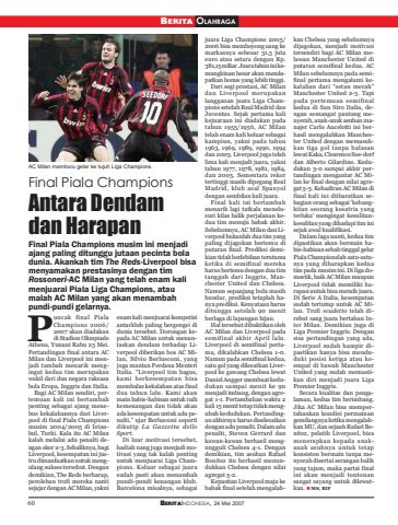 60 BERITAINDONESIA, 24 Mei 2007BERITA OLAHRAGAFinal Piala ChampionsAntara Dendamdan HarapanFinal Piala Champions musim ini menjadiajang paling ditunggu jutaan pecinta boladunia. Akankah tim The Reds-Liverpool bisamenyamakan prestasinya dengan timRossoneri-AC Milan yang telah enam kalimenjuarai Piala Liga Champions, ataumalah AC Milan yang akan menambahpundi-pundi gelarnya.uncak final PialaChampions 2006/2007 akan diadakandi Stadion OlimpiadeAthena, Yunani Rabu 23 Mei.Pertandingan final antara ACMilan dan Liverpool ini menjadi tambah menarik mengingat kedua tim merupakanwakil dari dua negara raksasabola Eropa, Inggris dan Italia.Bagi AC Milan sendiri, pertemuan kali ini bertambahpenting sebagai ajang menebus kekalahannya dari Liverpool di final Piala Championsmusim 2004/2005 di Istanbul, Turki. Kala itu AC Milankalah melalui adu penalti dengan skor 2-3. Sebaliknya, bagiLiverpool, kesempatan ini justru dimanfaatkan untuk mengulang sukses tersebut. Dengandemikian, The Reds berharap,perolehan trofi mereka nantisejajar dengan AC Milan, yaknienam kali menjuarai kompetisiantarklub paling bergengsi didunia tersebut. Dorongan kepada AC Milan untuk menuntaskan dendam terhadap Liverpool diberikan bos AC Milan, Silvio Berlusconi, yangjuga mantan Perdana MenteriItalia. “Liverpool tim bagus,kami berkesempatan bisamembalas kekalahan atas finaldua tahun lalu. Kami akanmain habis-habisan untuk raihkemenangan dan tidak akanada kesempatan untuk adu penalti,” ujar Berlusconi sepertidikutip La Gazzetta delloSport.Di luar motivasi tersebut,hadiah uang juga menjadi motivasi yang tak kalah pentinguntuk menjuarai Liga Champions. Keluar sebagai juarasudah pasti akan menambahpundi-pundi keuangan klub.Barcelona misalnya, sebagaijuara Liga Champions 2005/2006 bisa memboyong uang kemarkasnya sebesar 31,5 jutaeuro atau setara dengan Rp.381,15 miliar. Juara tahun ini kemungkinan besar akan mendapatkan bonus yang lebih tinggi.Dari segi prestasi, AC Milandan Liverpool merupakanlangganan juara Liga Champions setelah Real Madrid danJuventus. Sejak pertama kalikejuaraan ini diadakan padatahun 1955/1956, AC Milantelah enam kali keluar sebagaikampiun, yakni pada tahun1963, 1969, 1989, 1990, 1994dan 2003. Liverpool juga telahlima kali menjadi juara, yaknitahun 1977, 1978, 1981, 1984,dan 2005. Sementara rekortertinggi masih dipegang RealMadrid, klub asal Spanyoldengan sembilan kali juara.Final kali ini bertambahmenarik lagi tatkala menelusuri kilas balik perjalanan kedua tim menuju babak akhir.Sebelumnya, AC Milan dan Liverpool bukanlah dua tim yangpaling dijagokan bertemu diputaran final. Prediksi demikian tidak berlebihan terutamaketika di semifinal merekaharus bertemu dengan dua timtangguh dari Inggris, Manchester United dan Chelsea.Namun sepanjang bola masihbundar, prediksi tetaplah hanya prediksi. Kenyataan harusditunggu setelah 90 menitberlaga di lapangan hijau.Hal tersebut dibuktikan olehAC Milan dan Liverpool padasemifinal akhir April lalu.Liverpool di semifinal pertama, dikalahkan Chelsea 1-0.Namun pada semifinal kedua,satu gol yang dilesatkan Liverpool ke gawang Chelsea lewatDaniel Angger membuat kedudukan sampai menit ke 90menjadi imbang, dengan agregat 1-1. Pertambahan waktu 2kali 15 menit tetap tidak mengubah kedudukan. Pertandingan akhirnya harus diselesaikandengan adu penalti. Dalam adupenalti, Steven Gerrard dankawan-kawan berhasil mengungguli Chelsea 4-1. Dengandemikian, tim asuhan RafaelBenitez itu berhasil menundukkan Chelsea dengan nilaiagregat 5-2.Kepastian Liverpool maju kebabak final setelah mengalahkan Chelsea yang sebelumnyadijagokan, menjadi motivasitersendiri bagi AC Milan melawan Manchester United diputaran semifinal kedua. ACMilan sebelumnya pada semifinal pertama mengalami kekalahan dari “setan merah”Manchester United 2-3. Tapipada pertemuan semifinalkedua di San Siro Italia, dengan semangat pantang menyerah, anak-anak asuhan manajer Carlo Ancelotti ini berhasil mengalahkan Manchester United dengan memasukkan tiga gol tanpa balasanlewat Kaka, Clearence See-dorfdan Alberto Gilardino. Kedudukan 3-0 sampai akhir pertandingan mengantar AC Milan ke final dengan nilai agregat 5-3. Kehadiran AC Milan difinal kali ini diibaratkan sebagian orang sebagai ‘kebangkitan seorang kesatria yangterluka’ mengingat kesulitankesulitan yang dihadapi tim inisejak awal kualifikasi.Dalam laga nanti, kedua timdipastikan akan bermain habis-habisan sebab tinggal gelarPiala Championslah satu-satunya yang diharapkan keduatim pada musim ini. Di liga domestik, baik AC Milan maupunLiverpool tidak memiliki harapan untuk bisa meraih juara.Di Serie A Italia, kesempatansudah tertutup untuk AC Milan. Trofi scudetto telah direbut sang juara bertahan Inter Milan. Demikian juga diLiga Premier Inggris. Dengansisa pertandingan yang ada,Liverpool sudah hampir dipastikan hanya bisa menduduki posisi ketiga atau keempat di bawah ManchesterUnited yang sudah memastikan diri menjadi juara LigaPremier Inggris.Secara kualitas dan pengalaman, kedua tim berimbang.Jika AC Milan bisa mempertahankan kondisi permainangemilangnya ketika mengalahkan MU, dan sejauh Rafael Benitez, pelatih Liverpool, bisamenerapkan kepada anakanak asuhnya untuk tetapkonsisten bermain tanpa menyerah disertai serangan balikyang tajam, maka partai finalini akan menjadi tontonansangat sayang untuk dilewatkan. MS, RIFPAC Milan memburu gelar ke tujuh Liga Champions.