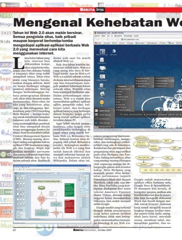 62 BERITAINDONESIA, 24 Mei 2007BERITA IPTEKMengenal Kehebatan We62 BERITAINDONESIA, 24 Mei 2007Tahun ini Web 2.0 akan makin bersinar.Semua pengelola situs, baik pribadimaupun korporat berlomba-lombamengadopsi aplikasi-aplikasi berbasis Web2.0 yang merevolusi cara kitamenggunakan internet.ima belas tahun yanglalu, internet bisadiibaratkan lautansitus yang berisi teks,angka dan foto dimana hanyasi empunya situs yang bolehmengubah isinya. Situs-situsstatis yang biasanya beralamatkan dengan akhiran .htmlini hanya berfungsi sebagaipemberi informasi. Seiringdengan berkembangnya bahasa pemrograman khususweb, situs-situs dinamis mulaibermunculan. Situs-situs iniada yang berakhiran .php,.asp, .js, dan sebagainya. Berkembang pula CSS (CascadingStyle Sheets) – berupa kode/tag untuk mendesain tampilanhalaman web lebih dinamis -yang memungkinkan pembuatsitus bisa mengubah desaintanpa mengganggu konten (isisitus). Saat itu maraklah istilahContent Management System(CMS). Masing-masing developer saling mengklaim bahwaaplikasi CMS buatannya canggih dan lengkap. Siapa sajaasalkan memiliki usernamedan password untuk login bisamemuat tulisan dan foto kedalam sebuah situs. Realita didunia web saat itu masihdilabeli Web 1.0.Nah, dua tahun terakhir ini,mencuat istilah baru, Web 2.0yang sering kita baca di berbagai media. Apa itu Web 2.0?Web 2.0 adalah sebuah evolusidi dunia internet dimana siapasaja bisa berpartisipasi menjadi pemberi informasi dalamsebuah situs. Pemilik situshanya menjadi fasilitator saja.Dalam perkembangan selanjutnya, Web 2.0 sudah bisamenyediakan aplikasi-aplikasioffice, pengolah video, kalkulasi tabel, dan berbagaiaplikasi lainnya yang berfungsidalam browser tanpa perlumeng-install aplikasi-aplikasitersebut dalam PC.Agar lebih mudah memahaminya, coba tengok situsensiklopedia terlengkap dijagad maya yang masih berbasis Web 1.0, Britannica Online. Seluruh konten situs dipegang oleh pihak Britannicasendiri. Sedangkan ensiklopedia ala Web 2.0 yang kinisudah banyak dikenal danmenjadi referensi banyak siswa dan mahasiswa adalahWikipedia. Dalam situs ini,semua pengunjung bisa memberikan sumbangan, mengoreksi, dan melengkapi artikelartikel yang ada di dalamnya.Kolaborasi dan partisipasi daripengunjung situs juga terlihatpada situs MySpace dan YouTube. Saking inovatifnya, situsyang masing-masing dibangunoleh sepasang remaja ini dihargai gila-gilaan oleh investorkakap. Situs MySpace yangmenjadi pionir situs komunitas pertemanan (sepertiFriendster) dibeli oleh RupertMurdoch, salah satu raja media. Situs YouTube, yang konsepnya diadaptasi dari acaratelevisi America’s FunniestHome Videos, dimana setiapanggota bebas memamerkanvideonya, kini sudah menjadimilik Google.Google sendiri yang terkenaldengan sistem pencariannyayang hebat namun terlihatsederhana, tidak mau ketinggalan memanfaatkan kemajuan teknologi di era Web 2.0.Google sudah menawarkanaplikasi office berbasis web,Google Docs & Spreadsheets.Di manapun kita berada, dikomputer apapun, asalkan adakoneksi internet dan browser,kita bisa mengedit dokumenWord dan Excell dengan mudah. Lewat browser, halamankerja untuk mengetik muncullengkap dengan toolbar standar seperti bold, italic, mengubah jenis huruf, merubahwarna, membuat tabel, memasukkan gambar, dan seL