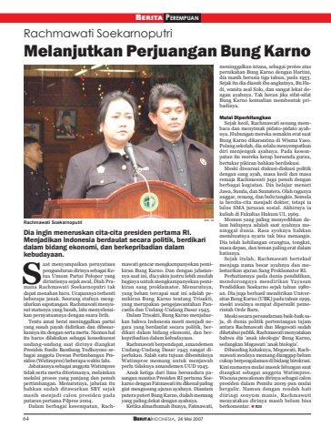 64 BERITAINDONESIA, 24 Mei 2007BERITA PEREMPUANRachmawati SoekarnoputriMelanjutkan Perjuangan Bung KarnoDia ingin meneruskan cita-cita presiden pertama RI.Menjadikan Indonesia berdaulat secara politik, berdikaridalam bidang ekonomi, dan berkepribadian dalamkebudayaan.aat menyampaikan pernyataanpengunduran dirinya sebagai Ketua Umum Partai Pelopor yangdirintisnya sejak awal, Diah Pramana Rachmawati Soekarnoputri takdapat menahan haru. Ucapannya terhentibeberapa jenak. Seorang stafnya mengulurkan saputangan. Rachmawati menyusut matanya yang basah, lalu menyelesaikan pernyataannya dengan suara lirih.Tentu amat berat meninggalkan partaiyang susah payah didirikan dan dibesarkannya itu dengan serta merta. Namun halitu harus dilakukan sebagai konsekuensiundang-undang saat dirinya diangkatPresiden Susilo Bambang Yudhoyono sebagai anggota Dewan Pertimbangan Presiden (Watimpres) beberapa waktu lalu.Jabatannya sebagai anggota Watimprestidak serta merta diterimanya, melainkanmelalui proses yang panjang dan penuhpertimbangan. Menurutnya, jabatan itubahkan sudah ditawarkan SBY sejakmasih menjadi calon presiden padaputaran pertama Pilpres 2004.Dalam berbagai kesempatan, Rachmawati gencar mengkampanyekan pemikiran Bung Karno. Dan dengan jabatannya saat ini, dia yakin justru lebih mudahbaginya untuk mengkampanyekan pemikiran sang proklamator. Menurutnya,yang belum tercapai saat ini adalah pemikiran Bung Karno tentang Trisakti,yang merupakan pengejawantahan Pancasila dan Undang-Undang Dasar 1945.Dalam Trisakti, Bung Karno menjabarkan bahwa Indonesia mesti menjadi negara yang berdaulat secara politik, berdikari dalam bidang ekonomi, dan berkepribadian dalam kebudayaan.Rachmawati berpendapat, amandemenUndang-Undang Dasar 1945 sangat diperlukan. Salah satu tujuan dibentuknyaWatimpres memang untuk menjawabperlu tidaknya amandemen UUD 1945.Anak ketiga dari lima bersaudara pasangan mantan Presiden RI pertama Soekarno dengan Fatmawati itu dikenal palinggiat mengusung ajaran ayahnya. Diantaraputera puteri Bung Karno, dialah memangyang paling dekat dengan ayahnya.Ketika almarhumah ibunya, Fatmawati,meninggalkan istana, sebagai protes ataspernikahan Bung Karno dengan Hartini,dia masih berusia tiga tahun, pada 1953.Sejak itu dia diasuh ibu angkatnya, Bu Hadi, wanita asal Solo, dan sangat lekat dengan ayahnya. Tak heran jika sifat-sifatBung Karno kemudian membentuk pribadinya.Mulai DiperhitungkanSejak kecil, Rachmawati senang membaca dan menyimak pidato-pidato ayahnya. Hubungan mereka semakin erat saatBung Karno dikarantina di Wisma Yaso.Pulang sekolah, dia selalu menyempatkandiri menjenguk ayahnya. Pada kesempatan itu mereka kerap bersenda gurau,bertukar pikiran bahkan berdiskusi.Meski diwarnai diskusi-diskusi politikdengan sang ayah, masa kecil dan masaremaja Rachmawati juga penuh denganberbagai kegiatan. Dia belajar menariJawa, Sunda, dan Sumatera. Olah raganyaanggar, renang, dan bulu tangkis. Semulaia bercita-cita menjadi dokter, tetapi ialulus SMA jurusan sosial. Akhirnya iakuliah di Fakultas Hukum UI, 1969.Momen yang paling menyedihkan dalam hidupnya adalah saat ayahnya meninggal dunia. Rasa syoknya bahkanmembuatnya nyaris tak bisa menangis.Dia telah kehilangan orangtua, tongkat,masa depan, dan teman paling erat dalambatinnya.Sejak itulah, Rachmawati bertekadmenjaga nama besar ayahnya dan melestarikan ajaran Sang Proklamator RI.Perhatiannya pada dunia pendidikan,mendorongnya mendirikan YayasanPendidikan Soekarno sejak tahun 1980-an. Dia juga berhasil mendirikan Universitas Bung Karno (UBK) pada tahun 1999,meski awalnya sempat dipersulit pemerintah Orde Baru.Meski secara persaudaraan baik-baik saja, di dunia politik pertentangan tajamantara Rachmawati dan Megawati sudahdiketahui publik. Rachmawati menyatakanbahwa dia ’anak ideologis’ Bung Karno,sedangkan Megawati ’anak biologis’.Dibanding kakaknya, Megawati, Rachmawati awalnya memang dianggap belumcukup berpengalaman di bidang birokrasi.Kini namanya mulai masuk hitungan saatdiangkat sebagai anggota Watimpres.Wacana pencalonan dirinya sebagai calonpresiden dalam Pemilu 2009 pun mulaibergulir. Namun dengan rendah hatidiiringi senyum manis, Rachmawatimenyatakan dirinya masih belum bisaberkomentar. RHSfoto: ist Rachmawati Soekarnoputri