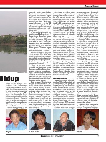 BERITAINDONESIA, 07 Juni 2007 19BERITA UTAMAHidupcerita kalau banjir awalFebruari 2007 lalu sebagaibanjir yang membuat masyarakat benar-benar menderita.Di wilayah mereka yang jugadikenal dengan Kampung Melayu Kecil, terjangan banjirsudah merupakan bagian darikeseharian mereka. Tiba-tibasaja, air sudah menggenangirumah mereka, karena SungaiCiliwung meluap akibat banjirkiriman dari hulu.“Kalau menggenang 50 cmsampai 1 meter saja, bukanbanjir namanya. Genangan setinggi itu bisa muncul kapansaja. Jadi sudah kejadian sehari-hari dan masyarakatmenjadi terbiasa,” kata Endang Suherman (35), staf RT03 sembari menjelaskan bahwa kawasan pemukimannyaterlandai di kawasan Kampung Pulo.Ia menambahkan banjir kemarin (awal Februari 2007)benar-benar dirasakan wargasebagai banjir sungguhan.Endang Suherman yang lahirdan besar di RT 03, mengakubaru pertama kali merasakansiksaan banjir yang sedemikian parah, “Seumur-umursaya belum pernah merasakanbanjir separah itu,” katanya.Ketika disinggung gagasanTirta Sangga Jaya, baik Endang Suherman maupun Heri,mengakuinya sebagai gagasanyang layak diperjuangkan untuk mencegah banjir sepertiyang terjadi Febuari.“Agar tau aja mas, rumahwarga di sini baru benar-benarkering setelah tiga bulan. Lumpurnya saja satu meter tingginya,” kata Endang Suhermansembari menjelaskan bahwapenderitaan pasca banjir yangmereka alami luput dari pemberitaan media massa.Bagi warga Jakarta yangtinggal di bantaran Kali Ciliwung, bebas banjir benar-benar sebuah barang mewah.Penderitaan mereka selamapuluhan tahun diterjang banjir bandang dan lumpur, sudahdikenal luas hingga ke mancanegara. Bahkan dengan penderitaan berkepanjangan itupula, warga bantaran Kali Ciliwung mendapat kunjungandari pesohor paling top, baikdari dalam negeri maupunmancanegara.Beberapa presiden, dutabesar negara-negara sahabat,petinggi PBB maupun pimpinan Bank Dunia, sudah mengunjungi daerah ini. Beberapa presiden RI pun sudahbolak-balik mengunjungi mereka. Demikian juga denganbeberapa tokoh dunia, bahkantidak tanggung-tanggung, ibunegara Amerika Serikat HillaryClinton (saat itu) pun sudahmengunjungi daerah ini padatahun 1990-an.Akan tetapi, setelah semuaitu berlalu, nasib warga bantaran Kali Ciliwung tetap tidakberubah. Hingga kini, harapanmereka menempati bantarankali tanpa diusik banjir, ternyata masih ada. Harapan inipun telah mereka tunggu selama puluhan tahun. Bahkan,bagi sebagian warga, penantian itu sudah menjadi impiansepanjang masa.Kiranya tidaklah berlebihanjika gagasan Tirta Sangga Jaya,seperti menguatkan kembaliharapan mereka untuk mendapatkan pemukiman bebasbanjir. Dengan gagasan TirtaSangga Jaya, cita-cita lamamereka, mungkin saja masihbisa saja diwujudkan.Menjawab Impian“Mungkin nggak ini dilaksanakan? Masih lama kali iniya? Sepertinya, ini programjangka panjang,” tukas merekaketika melihat denah gagasanTirta Sangga Jaya. Optimismedari sejumlah Ketua RT diwilayah bantaran Kali Ciliwung pun langsung terlontar,setelah memahami konseppenanggulangan banjir alaTirta Sangga Jaya. Bagi mereka, bisa saja TSJ menjadijawaban dari impian merekaselama ini.Namun demikian, sebagaigagasan yang baru dimunculkan, sudah barang tentu jikagagasan Tirta Sangga Jayabelum dipahami masyarakatsecara utuh. Terlebih jika mereka juga belum pernah membaca penjelasan tentang gagasan Syaykh AS Panji Gumilang, pucuk pimpinan Lembaga Pendidikan Al-Zaytun,sebagaimana yang menjadilaporan utama Berita Indonesia (edisi 36). Sehingga wajarsaja bila terjadi pemahamanyang kurang tepat.Misalnya, ketika Tirta Sangga Jaya disebut sebagai proyekpembuatan sungai baru, diantara mereka ada yang langsung berpikir ke arah penggusuran besar-besaran di Jakarta. “Daerah mana aja yangmau digusur nih,” seru Wawan(48), Ketua RT 15 RW 12, Kelurahan Bukit Duri, Tebet, Jakarta Selatan.Namun setelah dijelaskanbahwa Tirta Sangga Jaya tidakberada di Jakarta, melainkandi wilayah Bodetabek, Wawanyang memimpin lebih dari 100Kepala Keluarga (KK), barumengungkapkan responnya.“Gagasan ini sangat baik, tapisepertinya untuk jangka panjang ya?” katanya saat ditemuidi rumahnya, Kamis (26/5).Wartawan Berita Indonesiamenjelaskan, jika dilihat darisisi kebutuhan Jabodetabek,gagasan ini justru sangat mendesak. Sebab, tanpa infrastruktur penanggulangan banjir yang memadai, Jabodetabek akan terus berlarut-larutdalam ancaman banjir. Bukantidak mungkin banjir bandangseperti yang terjadi pada awalFebruari 2007 lalu terus berulang setiap tahun.“Harapan kita, gagasan inidapat segera terwujud,” imbuhnya. Ia juga berharap agarMulyadi R. Budi Budril Muhammad Wawanfoto-foto: berindo wilson