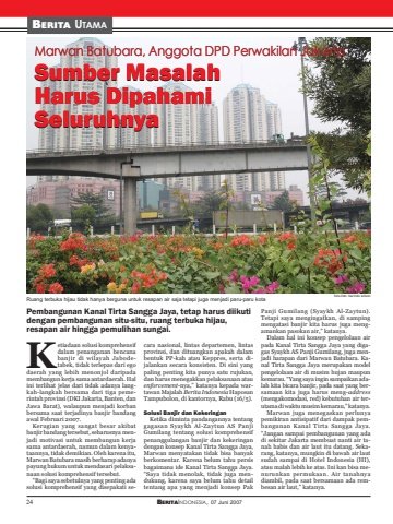 24 BERITAINDONESIA, 07 Juni 2007BERITA UTAMAetiadaan solusi komprehensifdalam penanganan bencanabanjir di wilayah Jabodetabek, tidak terlepas dari egodaerah yang lebih menonjol daripadamembangun kerja sama antardaerah. Halini terlihat jelas dari tidak adanya langkah-langkah bersama dari tiga pemerintah provinsi (DKI Jakarta, Banten, danJawa Barat), walaupun menjadi korbanbersama saat terjadinya banjir bandangawal Februari 2007.Kerugian yang sangat besar akibatbanjir bandang tersebut, seharusnya menjadi motivasi untuk membangun kerjasama antardaerah, namun dalam kenyataannya, tidak demikian. Oleh karena itu,Marwan Batubara masih berharap adanyapayung hukum untuk mendasari pelaksanaan solusi komprehensif tersebut.“Bagi saya sebetulnya yang penting adasolusi komprehensif yang disepakati secara nasional, lintas departemen, lintasprovinsi, dan dituangkan apakah dalambentuk PP-kah atau Keppres, serta dijalankan secara konsisten. Di sini yangpaling penting kita punya satu rujukan,dan harus menegakkan pelaksanaan atauenforcement-nya,” katanya kepada wartawan Majalah Berita Indonesia HaposanTampubolon, di kantornya, Rabu (16/5).Solusi Banjir dan KekeringanKetika diminta pandangannya tentanggagasan Syaykh Al-Zaytun AS PanjiGumilang tentang solusi komprehensifpenanggulangan banjir dan kekeringandengan konsep Kanal Tirta Sangga Jaya,Marwan menyatakan tidak bisa banyakberkomentar. Karena belum tahu persisbagaimana ide Kanal Tirta Sangga Jaya.“Saya tidak menolak, tidak juga mendukung, karena saya belum tahu detailtentang apa yang menjadi konsep PakPanji Gumilang (Syaykh Al-Zaytun).Tetapi saya mengingatkan, di sampingmengatasi banjir kita harus juga mengamankan pasokan air,” katanya.Dalam hal ini konsep pengelolaan airpada Kanal Tirta Sangga Jaya yang digagas Syaykh AS Panji Gumilang, juga menjadi harapan dari Marwan Batubara. Kanal Tirta Sangga Jaya merupakan modelpengelolaan air di musim hujan maupunkemarau. “Yang saya ingin sampaikan adalah kita bicara banjir, pada saat yang bersamaan kita juga harus meng-address(mengakomodasi, red) kebutuhan air terutama di waktu musim kemarau,” katanya.Marwan juga menegaskan perlunyapemikiran antisipatif dari dampak pembangunan Kanal Tirta Sangga Jaya.“Jangan sampai pembangunan yang adadi sekitar Jakarta membuat nanti air tanah habis dan air laut itu datang. Sekarang, katanya, mungkin di bawah air lautsudah sampai di Hotel Indonesia (HI),atau malah lebih ke atas. Ini kan bisa menurunkan permukaan. Air tanahnyadiambil, pada saat bersamaan ada rembesan air laut,” katanya.Pembangunan Kanal Tirta Sangga Jaya, tetap harus diikutidengan pembangunan situ-situ, ruang terbuka hijau,resapan air hingga pemulihan sungai.Kfoto-foto: berindo wilsonMarwan Batubara, Anggota DPD Perwakilan JakartaSumber MasalahHarus DipahamiSeluruhnyaRuang terbuka hijau tidak hanya berguna untuk resapan air saja tetapi juga menjadi paru-paru kota