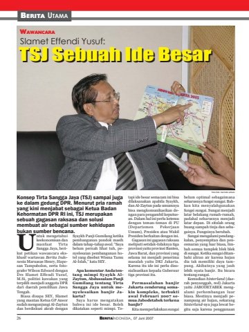 26 BERITAINDONESIA, 07 Juni 2007BERITA UTAMAKonsep Tirta Sangga Jaya (TSJ) sampai jugake dalam gedung DPR. Menurut pria ramahyang kini menjabat sebagai Ketua BadanKehormatan DPR RI ini, TSJ merupakansebuah gagasan raksasa dan solusimembuat air sebagai sumber kehidupanbukan sumber bencana.Syaykh Panji Gumilang ketikapembangunan pondok masihdalam tahap-tahap awal. “Sayabelum pernah lihat tuh, penyelesaian pembangunan hotel yang disebut Wisma TamuAl-Islah,” kata SEY.Apa komentar Anda tentang mimpi Syaykh AlZaytun, Abdussalam PanjiGumilang tentang TirtaSangga Jaya untuk menyelesaikan banjir Jakarta?Saya harus mengatakanbahwa ini ide besar. Bolehdikatakan seperti mimpi. Tetapi ide besar semacam ini bisadilaksanakan apabila Syaykh,dan Al-Zaytun pada umumnyabisa mengkomunikasikan dengan para pengambil keputusan. Dalam hal ini perlu ketemudengan teman-teman di PU(Departemen PekerjaanUmum), Presiden atau WakilPresiden berkaitan dengan ini.Gagasan ini gagasan raksasameliputi setidak-tidaknya tigaprovinsi yaitu provinsi Banten,Jawa Barat, dan provinsi yangselama ini menjadi penerimamasalah yaitu DKI Jakarta.Karena itu ide ini perlu disosialisasikan kepada Gubernurtiga provinsi itu.Permasalahan banjirJakarta cenderung semakin kompleks, terbuktiawal Februari 2007 semua Jabodetabek terkenabanjir?Kita memperlakukan sungaibelum optimal sebagaimanaseharusnya fungsi sungai. Bahkan kita menyalahgunakanfungsi sungai. Sungai menjadilatar belakang rumah-rumah,padahal seharusnya menjadilatar depan. Di situlah orangbuang sampah tinja dan sebagainya. Fungsinya berubah.Sungai mengalami pendangkalan, penyempitan dan pencemaran yang luar biasa, limbah semua tumplek blek blekdi sungai. Ketika sungai ditambahi aliran air karena hujandia tak memiliki daya tampung. Akibatnya yang jauhlebih nyata banjir. Itu bicaratentang sungai.Kemudian hinterland (daerah penyanggah, red) Jakartayaitu JABODETABEK mengalami perkembangan luarbiasa. Mestinya menjadi penampung air hujan, sekaranghinterland-nya juga lewat begitu saja karena penggunaanSlamet Effendi Yusuf:TSJ Sebuah Ide Besarntuk mengetahuikeekonomisan danmanfaat TirtaSangga Jaya, berikut petikan wawancara eksklusif wartawan Berita Indonesia Maruasas Henry, Haposan Tampubolon, serta fotografer Wilson Edward denganDrs Slamet Effendi Yusuf,M.Si, politisi kawakan yangterpilih menjadi anggota DPRdari daerah pemilihan JawaTengah.Biasa disapa SEY, Slametyang mantan Ketua GP Ansorsudah mengunjungi Al-Zaytundan berdiskusi akrab denganWAWANCARAUfoto-foto: berindo wilsonTSJ Sebuah Ide Besar