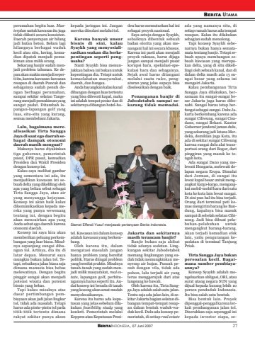 BERITAINDONESIA, 07 Juni 2007 27BERITA UTAMAperumahan begitu luas. Masterplan untuk kawasan itu jugatidak diikuti secara konsisten.Daerah penyerapan air hilangjadi hutan beton. Belum lagihilangnya berbagai wadukkecil atau situ, kering, kemudian dipatok menjadi pemukiman atau milik orang.Sekarang banjir sudah menjadi problem tahunan. Ke depan akan makin menjadi seperti itu, karena kawasan-kawasanresapan di daerah Puncak dansebagainya sudah penuh dengan berbagai perumahan,sampai sekitar selatan Tangerang menjadi pemukiman yangsangat padat. Ditambah lapangan-lapangan golf yangluas, situ-situ yang kurang,semua membebani Jakarta.Lalu, bagaimana merealisasikan Tirta SanggaJaya di saat ego daerah sebagai dampak otonomidaerah masih menguat?Makanya harus diyakinkantiga gubernur, pemerintahpusat, DPR pusat, kemudianPresiden dan Wakil Presidendengan konsep ini.Kalau saya melihat gambaryang sementara ini ada, itumenjadikan kawasan ini sebuah delta yang dikelilingi olehapa yang beliau sebut sebagaiTirta Sangga Jaya, atau airyang menyangga kejayaan.Konsep ini akan baik kalaudikomunikasikan kepada mereka yang punya wewenangtentang ini, dengan begituakan mencairkan apa yangAnda sebut ego daerah karenaotonomi daerah.Konsep ini saya kira akanmemberikan peluang perkembangan yang luar biasa. Misalnya sepanjang sungai dibangun tol. Artinya, dia itu dilatar depan. Menurut sayamungkin bukan jalan tol. Tetapi, sebaiknya jalan biasa sajadimana manusia bisa bebasmelewatinya. Dengan begitupinggir sungai akan menjadipotensi wisata dan potensibisnis yang bebas.Tapi kalau misalnya atasdasar pertimbangan pembiayaan akan jadi jalan lingkartol, tidak ada masalah. Tetapiharus ada pintu-pintu tol padatitik-titik tertentu dimanarakyat sekitar punya akseskepada jaringan ini. Janganmereka diisolasi melalui tol.Karena banyak unsurbisnis di sini, kalauSyaykh yang menyosialisasikan seakan dia berkepentingan seperti pengusaha?Nanti Syaykh bisa menunjukkan bahwa ini bukan untukkepentingan dia. Tetapi untukkemaslahatan masyarakat,daerah, dan bangsa.Anda bayangkan kalau kanaldibangun dengan luas tertentuyang bisa dilewati kapal, makaini adalah tempat pesiar dan disekitarnya dibangun hotel-hoden harus memutuskan hal inisebagai proyek nasional.Saya setuju dengan Syaykh,sebaiknya dibentuk sebuahbadan otorita yang akan menangani hal ini secara khusus.Karena ini pasti akan menjadiproyek raksasa, harus dijagajangan sampai menjadi pusatkorupsi baru, spekulasi-spekulasi baru dan sebagainya.Sejak awal harus ditanganimelalui suatu rules, pengaturan yang jelas supaya bisadiselesaikan dengan baik.Penanganan banjir diJabodetabek sampai sekarang tidak memadai.ada yang namanya situ, disetiap rumah harus ada tempatresapan. Kalau itu dilakukansebagian sudah menolong.Tapi konsep Syaykh sebenarnya bukan hanya sematamata tentang banjir. Tetapi sebuah upaya membangun sebuah kawasan yang merupakan delta, yang di situ dikelilingi oleh sebuah kanal, dan didalam delta masih ada 13 sungai besar yang selama inimengairi Jakarta.Kalau pembangunan TirtaSangga Jaya dilakukan, bersamaan itu sungai-sungai besar Jakarta juga harus dibenahi. Sungai harus tetap berfungsi sebagai sungai. Dulu Jakarta berkembang karena adasungai Ciliwung, sungai Cisadane, sungai Bekasi. KantorGubernur jenderal jaman dulu,yang sekarang jadi Istana Merdeka, demikian juga Kota, ituada di sekitar sungai Ciliwungkarena sungai dulu alat transportasi orang dari Bogor, daripinggiran yang masuk ke tengah kota.Ada sungai Dano yang melewati Hongaria, melewati delapan negara Eropa. Dimulaidari Jerman, di sungai itulewat kapal besar untuk mengangkut kargo-kargo, mengangkut mobil-mobil baru dari satukota ke kota lain lewat sungai.Di sini pun hal itu bisa terjadi.Orang dari terminal peti kemas mengirim barang ke Bandung, kapalnya bisa masuksampai di sebelah selatan Cibinong. Jadi bisa dibuat pelabuhan-pelabuhan untukmengangkut barang-barang.Akan terjadi kemudian efeklain, yaitu pengurangan kepadatan di terminal TanjungPriok.Tirta Sangga Jaya bukanpersoalan kecil. Bagaimana sumber pembiayaannya?Konsep Syaykh adalah mengeluarkan obligasi, ORI, atausurat utang negara SUN yangdijual kepada kurang lebih 10persen penduduk Indonesia.Itu bisa salah satu bentuk.Bisa bentuk lain. Proyekdipenggal-penggal karena terkait pembangunan jalan tol.Diserahkan saja sepenggal inikepada investor siapa, setel. Kawasan ini dalam konsepadalah kawasan yang berkembang.Oleh karena itu, dalammengatasi masalah janganhanya problem yang bersifatpolitik. Harus diingat problemyang bersifat praktis. Misalnyatanah-tanah yang sudah menjadi milik masyarakat, real estate, lapangan golf, perhitungannya harus seperti itu. Andai konsep ini berada di tanahyang kosong akan amat mudahmenyelesaikannya.Karena itu harus ada keputusan yang jelas sebelum dilakukan feasibility study yangkonkrit. Pemerintah melaluiKeppres atau Keputusan PresiJakarta dan sekitarnyamasih terancam banjir?Banjir bukan saja akibattidak adanya sodetan. Lingkungan sekitar Jabodetabekmemang lingkungan yang sudah tidak memungkinkan menyerap air hujan. Puncak penuh dengan vila, tidak adapohon, lalu terjadi air yangterus menggerujuk dari ataslangsung ke bawah.Oleh karena itu, Tirta Sangga Jaya adalah salah satu jalan.Tentu saja ada jalan lain, di sekitar Jakarta bagian selatan dibangun tempat-tempat resapan dalam bentuk waduk-waduk kecil. Dulu ada konsep pemerintah, di setiap real estateSlamet Effendi Yusuf menjawab pertanyaan Berita Indonesia.