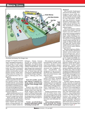 28 BERITAINDONESIA, 07 Juni 2007penggal ini kepada investorsiapa, sepenggal ini kepada investor siapa. Ini pasti akanmenjadi jalan yang sangatramai, siapapun mau itu. Yangkedua ini, kalau prinsipnyasudah disetujui pemerintah,adalah menawarkan proyekkepada investor untuk membangun jalan tol, tempat-tempat pemberhentian dan sebagainya.Menurut saya yang rasionaladalah yang kedua ini, diserahkan kepada investor denganterlebih dahulu pemerintahmemberikan garansi terhadapkemudahan pembebasan tanah, garansi penggunaan kalausuatu hari terjadi pemanfaatantanah sehingga investor punyakemauan untuk itu.Kalau pembiayaannya lewatAPBN saya kira berat karenaini proyek sangat besar sekali.Kalau proyek jadi direalisasikan harus disertai gerakanpembudayaan membangunkultur tingkah laku yang baikdalam memperlakukan air.Karena air adalah sumber kehidupan. Dalam konsepSyaykh air adalah sumberkehidupan. Air bukan hanyadigunakan menjadi air bersihmelalui PDAM-PDAM, tetapijuga sebagai alat transportasi.Walau nanti ada tol di sekitarnya, air harus tetap jadi alattransportasi digabungfungsikan sekalian dengan sungai Cisadane, Ciliwung, dan Citarum.Dari sisi yuridis, perlukah dibuat Undang-Undang untuk memayungiproyek Tirta Sangga Jayaini?Keppres saja sudah cukupkarena kita tidak untuk membangun suatu zona yang eksklusif. Keppres pasti berdasarkan undang-undang juga.Kalau ada sesuatu yang praktis, kenapa harus cari yang berkelok-kelok. Keppres juga cukup kuat.Untuk membuktikankuatnya dukungan politikterhadap konsep ini?Hal semacam ini pasti dikonsultasikan dengan DPR,misalnya dengan komisiyang berhubungan denganinfrastruktur, Komisi V. Tapimenurut saya, langkah pertama meyakinkan tigapenguasa di tiga provinsi,eksekutif dan legislatifnya,lalu pemerintah pusat, jugaDPR dan DPD.Harus dihitung secara lebihteknis soal biaya, dampaklingkungan hidup dan sebagainya. Mumpung kitamembangun di era yang lebihterbuka, tidak ada jeleknyadidiskusikan sehingga faktorfaktor lingkungan bisa terpelihara oleh kanal semacamini.Apalagi proyek besar semacam ini, beliau harus roadshow ke berbagai pihak untukmeyakinkan bahwa proyek inifeasible dan mungkin dilakukan kalau ada kehendak bersama.Lahan Jakarta tidak terkena proyek ini tetapimemperoleh keuntungandarinya?Ada masalah lingkunganyang harus kita hitung. Pembangunan kanal tidak mematikan sungai-sungai yangada di Jakarta, karena sungaiitu juga diperlukan. Belumlagi yang berkaitan dengandampak lingkungan kekeringan dan perubahan ekosistem karena ada kanal. Tidak sesederhana membuatsodetan begitu.Jadi persoalannya bukansemata-mata banjir. Konsepinipun saya kira bukan semata-mata tentang mengatasibanjir. Tapi membuat air sebagai sumber kehidupan bukan sumber bencana. Konsepini tetap harus menghidupkansungai-sungai yang ada. Ke-13sungai di Jakarta tidak bolehada yang mati. Karena kalausampai mati air laut yang masuk ke bawah tanah Jakarta,terjadi intrusi.Saya kira yang harus dilakukan oleh Syaykh selanjutnyaadalah, karena beliau mempunyai jaringan luas, ada insinyurnya, panggil mereka itu,coba bikin sesuatu yang sampai ke tingkat feasibility study, sampai soal pembiayaandan sebagainya. Terus, bagaimana model-model pembebasan tanah dan pembangunannya. Ketika nantiSyaykh mengatakan pengerjaannya dilakukan oleh rakyatdi sekitar situ, maka ini akanmengatasi berbagai persoalanpengangguran di kawasan itu.Tangerang penganggurannyacukup tinggi. Andaikata proyek ini jadi, dan mereka dilibatkan, hasilnya pasti luarbiasa sekali.Franklin Delano Rosevelt,ketika Amerika mengalamimalaise (krisis ekonomi, red)krisis yang luar biasa, terjadikelaparan dan penganggurandi mana-mana menawarkankonsep yang namanya newdeal. Dia membangun infrastruktur, yang mengerjakanrakyat yang tidak punya pekerjaan, atau bekas-bekastentara yang nganggur. Jalannya terbangun rakyatnyadapat pekerjaan, dan kewajiban bank-bank membiayai.Pengerjaan Tirta Sangga Jayajuga harus begitu. „BERITA UTAMAVisualisasi penampang Tirta Sangga Jaya.