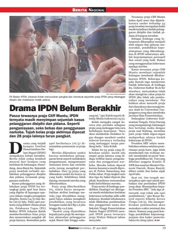 BERITAINDONESIA, 07 Juni 2007 29Drama IPDN Belum BerakhirPasca tewasnya praja Cliff Muntu, IPDNternyata masih menyimpan sejumlah kasuspelanggaran disiplin dan pidana. Sepertipenganiayaan, seks bebas dan penggunaannarkoba. Tujuh belas praja akhirnya dipecatdan 28 praja lainnya turun pangkat.rama yang terjadikampus InstitutPemerintahan Dalam Negeri (IPDN)nampaknya belum berakhir.Berita tidak sedap kembalimuncul dari kampus yangberlokasi di Jatinangor, Sumedang, Jawa Barat itu. Sejumlahpraja kembali terbukti melakukan pelanggaran disiplindan pidana, termasuk penggunaan narkoba.Kasus pelanggaran yang dilakukan praja IPDN itu terungkap pada apel luar biasayang digelar di lapangan upacara dalam rangka penegakandisiplin, Senin (14/5) dan Rabu (16/5) lalu. Pada apel pertama yang diikuti ribuan prajaitu, Pelaksana Tugas (Plt)Rektor IPDN Johanes Kalohmemberhentikan lima prajadan menurunkan pangkat 28praja lainnya. Kemudian padaapel berikutnya (16/5) diumumkan pemecatan 12 prajalagi.Mereka dikenakan sanksikarena melakukan pelanggaran berat seperti melakukanpenganiayaan, mengonsumsiminuman keras dan narkobaserta jarang mengikuti perkuliahan. Dari 33 praja yangdikenakan sanksi itu hanya 14yang hadir. Selebihnya tidakdatang, termasuk mereka yangdiberhentikan.Praja yang diberhentikanitu, selain harus mengembalikan atribut lembaga mereka juga diwajibkan mengganti biaya selama mengikutipendidikan yang besarnyaberagam mulai dari Rp 1,6 jutahingga Rp 12,6 juta.“Sanksi yang dijatuhkankepada para praja itu merupakan akumulasi pelanggaransejak Maret lalu hingga sekarang ini,” ujar Kaloh seperti dikutip Media Indonesia (15/5).Kolah mengaku sangat kecewa atas perilaku sebagianpraja yang melanggar tata carakehidupan keprajaan. “Sayaakan melakukan tindakan tegas dengan memberi sanksiseberat-beratnya terhadapyang melanggar tanpa pandang bulu,” kata Kolah.Selain ke-33 praja yang dikenakan sanksi, masih adaempat praja lainnya yang diduga terlibat kasus penganiayaan dan penggunaan narkoba. Mereka belum dipecatkarena kasusnya masih diproses di Polres Sumedang danPolda Jabar. Praja tingkat satudan tiga itu bakal dipecat jikapihak kepolisian menemukanbukti keterlibatan mereka.Praja senior di lembaga pendidikan Depdagri ini ditengarai masih melakukan tindakankekerasan terhadap adik-adikkelasnya. Kendati sebelumnyatelah dilakukan pembenahandan penggantian nama dariSekolah Tinggi PemerintahanDalam Negeri (STPDN) menjadi IPDN pasca tewasnyapraja Wahyu Hidayat tahun2003 lalu.Tewasnya praja Cliff Muntubulan April 2007 dan dijatuhkannya sanksi terhadap 45praja tersebut merupakan buktimasih terjadinya tindak pelanggaran disiplin dan tindak pidana di kampus tersebut.Sebagai lembaga yang lulusannya diharapkan menjadiabdi negara dan pelayan masyarakat, pendidikan kepemimpinan yang dikembangkan di IPDN seharusnya adalah kepemimpinan persuasifdan sosial yang baik. Bukanyang menggunakan kekerasanapalagi otoriter.Kasus tewasnya praja CliffMuntu membuat sejumlahkalangan mendesak dibubarkannya IPDN. Beberapa kepala daerah juga memprotestindak kekerasan di lembagaitu. Gubernur Kalbar M.Ja’farmisalnya, menyatakan tidakakan mengirim calon praja keIPDN jika tidak ada pembenahan yang mendasar. Diabahkan akan menarik prajadari daerahnya dan mengirimnya studi ke Universitas Tanjungpura yang akan membukajurusan Ilmu Pemerintahan.Sedangkan Gubernur Kalimantan Tengah, Teras Narangyang mengunjungi Jatinangordan bertatap muka denganpraja asal Kalteng, memintapara praja tidak segan-seganmelaporkan adanya tindakkekerasan di IPDN.Presiden SBY selain membekukan selama setahun penerimaan praja baru, juga telahmembentuk tim evaluasi untuk ‘membedah isi perut’ lembaga pendidikan itu. Tim yangdiketuai anggota Komisi IIDPR dan mantan Menteri Otonomi Daerah, Ryaas Rasyid,diberi waktu dua bulan sejakApril lalu.Saat ini, tim tengah menyiapkan opsi-opsi untuk perbaikan dan perubahan IPDNyang akan disampaikan kepada Presiden SBY. “Ada tiga alternatif, tapi tidak ada opsipembubaran,” ujar Ryaas Rasyid seperti dikutip KoranTempo (16/5). Dia memperkirakan pembenahan akanmemakan waktu minimal duatahun. Namun yang pasti lembaga pendidikan kepamongprajaan dan kader pemerintahan itu tetap jalan. SPDPlt Rektor IPDN Johanes Kolah menurunkan pangkat dan memecat sejumlah praja IPDN yang melanggardisiplin dan melakukan tindak pidana.foto: repro media indonesiaBERITA NASIONAL
