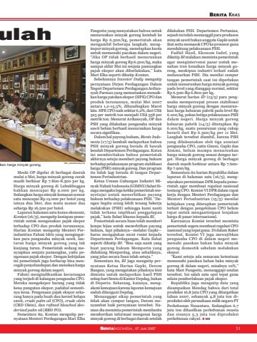 BERITAINDONESIA, 10 Agustus 2006 31BERITA KHASBERITAINDONESIA, 07 Juni 2007 31ulahMeski OP digelar di berbagai daerahmulai 2 Mei, harga minyak goreng curahmasih berkisar Rp 7.800-8.500 per kg.Harga minyak goreng di Lubuklinggaubahkan mencapai Rp 9.000 per kg.Sedangkan harga minyak kemasan nomorsatu mencapai Rp 19.000 per botol yangisinya dua liter, dan mutu nomor duaseharga Rp 16.500 per botol.Laporan halaman satu koran ekonomi,Kontan (16/5), mengutip kesiapan pemerintah untuk mengenakan pajak eksporterhadap CPO dan produk turunannya.Harian Kontan mengutip Menteri Perindustrian Fahmi Idris yang mengingatkan para pengusaha minyak sawit, lantaran harga minyak goreng yang takkunjung turun. Pemerintah sedang menyiapkan senjata pamungkas, yaitu pengenaan pajak ekspor. Dengan kebijakanini pemerintah juga berharap bisa mencegah penyelundupan dan menekan hargaminyak goreng dalam negeri.Fahmi mengindikasikan kecuranganyang terjadi di kalangan pengusaha CPO.Mereka mengekspor barang yang tidakkena pungutan ekspor, padahal semestinya kena. Pengenaan pajak ekspor sekarang hanya pada buah dan kernel kelapasawit, crude palm oil (CPO), crude olein(CRD Olein), dan refined bleached deoderized palm oil (RBD PO).Sementara itu, Kontan mengutip pernyataan Menteri Perdagangan Mari ElkaPangestu yang menyatakan bahwa untukmenurunkan minyak goreng kembali keharga Rp 6.500/kg, pemerintah akanmengambil beberapa langkah; mengimpor minyak goreng, menetapkan kuotauntuk memenuhi pasokan dalam negeri.“Jika OP tidak berhasil menurunkanharga minyak goreng Rp 6.500/kg, makasampai akhir Mei ini senjata pamungkaspajak ekspor akan diberlakukan,” kataMari Elka seperti dikutip Kontan.Sebelumnya Investor Daily mengutippernyataan Dirjen Perdagangan DalamNegeri Departemen Perdagangan Ardiansyah Parman yang memutuskan menaikkan harga patokan ekspor (HPE) CPO danproduk turunannya, mulai Mei 2007antara 1,2-15,3%, dibandingkan Maretlalu. HPE CPO naik sekitar 6,2%, dari US$525 per metrik ton menjadi US$ 558 permetrik ton. Menurut Ardiansyah, OP danPSH yang dilakukan pengusaha minyaksawit belum berhasil menurunkan hargasecara signifikan.Dalam hal payung hukum, Bisnis Indonesia (17/5) kembali melaporkan bahwaPSH minyak goreng berada di bawahkendali Departemen Perdagangan. Koranini memberitakan bahwa pemerintahakhirnya setuju memberi payung hukumterhadap pelaksanaan program stabilisasiharga (PSH) minyak goreng. Dan programitu tidak lagi berada di tangan Departemen Perindustrian.Ketua Umum Gabungan Industri Minyak Nabati Indonesia (GIMNI) Sahat Sinaga mengaku lega ketika pemerintah menyetujui untuk menerbitkan payunghukum terhadap pelaksanaan PSH. “Dengan begitu orang lebih tenang bekerjamelakukan (PSH) sehingga kami nantitidak terkena implikasi penggelapanpajak,” kata Sahat khusus kepada BI.Pemerintah secara lisan telah memberilampu hijau untuk menerbitkan payunghukum, tapi pihaknya—melalui Gapki—harus mengajukan surat resmi kepadaDepartemen Perdagangan. Kata Sahatseperti dikutip BI: “Bisa saja nanti yangbuat payung hukum Memperin yangdidukung Menperdag, atau sebaliknya,yang jelas secara lisan telah setuju.”Sementara itu, BI juga mengutip pernyataan Ketua Harian Gapki, DeromBangun, yang mengatakan pihaknya kinidiminta untuk melaporkan hasil PSHsetiap hari Senin di Kantor Depdag, bukandi Deperin. Sekarang, katanya, mengalami kemajuan karena laporan kemajuansudah ditangani Depdag.Menanggapi sikap pemerintah yangtidak akan campur tangan, Derom menyambut baik pernyataan tersebut. Namun dia meminta pemerintah membantumemberikan informasi mengenai hargaminyak goreng di berbagai daerah setelahdilakukan PSH. Departemen Pertanian,sejauh ini telah memanggil para produsenminyak sawit bukan anggota Gapki untukikut serta memasok CPO ke prosesor gunamendukung pelaksanaan PSH.Fadhil Hasil, Ekonom Indef, yangdikutip BI malahan meminta pemerintahagar mengintervensi pasar untuk menahan tren kenaikan harga minyak goreng, meskipun industri terkait sudahmelancarkan PSH. Dia menilai campurtangan pemerintah saat ini diperlukanuntuk menurunkan harga minyak gorengpada level yang dianggap normal, sekitarRp 6.500-Rp 6.800 per kg.Menurut harian ID (15/5) para pengusaha mempercepat proses stabilisasiharga minyak goreng dengan menurunkan harga keluaran pabrik pada level Rp6.100/kg, pekan ketiga pelaksanaan PSHdalam negeri. Harga minyak gorengkeluaran pabrik (14/5) ditetapkan Rp6.100/kg, suatu penurunan yang cukupberarti dari Rp 6.500/kg per 11 Mei.Langkah tersebut diambil, karena PSHyang dilaksanakan oleh tiga asosiasipengusaha CPO, yaitu Gimni, Gapki danAimmi, belum mampu menurunkanharga minyak goreng sesuai dengan target. Harga minyak goreng di berbagaidaerah masih berkisar antara Rp 7.600-Rp 7.900/kg.Sementara itu harian Republika dalamlaporan di halaman satu (16/5), mengutarakan permintaan DPR kepada pemerintah agar membuat regulasi nasionaltentang CPO. Komisi VI DPR dalam rapatkerja dengan Menteri Perdagangan danMenteri Perindustrian (15/5) menilaikebijakan yang diterapkan pemerintahterkait dengan pengelolaan CPO belumtepat untuk mengantisipasi lonjakanharga di pasar internasional.Karenanya Komisi tersebut memintapemerintah segera membuat regulasi CPOnasional yang tepat guna. Di dalam Rakertersebut, Komisi VI juga mewajibkanpengusaha CPO di dalam negeri memenuhi pasokan bahan baku minyakgoreng domestik sebelum melakukanekspor.“Kami setuju ada semacam ketentuanmemenuhi pasokan bahan baku minyakgoreng di dalam negeri, misalnya 10%,”kata Mari Pangestu, menanggapi usulantersebut. Ini salah satu opsi tepat gunaselain pemberlakuan pajak ekspor.Republika juga mengutip data yangdisampaikan Mendag bahwa dari totalproduksi 16,8 juta CPO yang ditargetkantahun 2007, sebanyak 4,8 juta ton diproduksi oleh perusahaan milik negara PTPerkebunan Nusantara. Sedangkan 6,7juta ton dihasilkan perkebunan swastadan sisanya 5,3 juta ton diproduksiperkebunan rakyat. SHlkan harga minyak goreng. foto: presidensby.info
