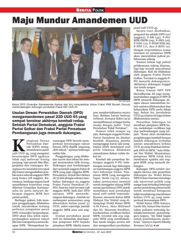 32 BERITAINDONESIA, 07 Juni 2007BERITA POLITIKMaju Mundur Amandemen UUDUsulan Dewan Perwakilan Daerah (DPD)mengamandemen pasal 22D UUD 45 yangsempat bersinar akhirnya kembali redup.Setelah Partai Demokrat, anggota FraksiPartai Golkar dan Fraksi Partai PersatuanPembangunan juga menarik dukungan.einginan DewanPerwakilan Daerah (DPD) mengamandemen pasal22D UUD 45, yang mengaturkewenangan DPD agaknyatidak saja melewati lorongpanjang, tapi penuh lika-liku,ganjalan dan rintangan. Keinginan itu mustahil terwujudjika hanya mengandalkan jumlah suara seluruh anggota DPDyang hanya 128 anggota. Karenanya, lembaga negara hasilamandemen konstitusi yangdiketuai Ginandjar Kartasasmita itu perlu mencari dukungan anggota MPR daripartai politik.Berbagai ajakan, lobi maupun penggalangan dilakukanuntuk meyakinkan tentangperlunya penguatan peranDPD. Ginandjar berpendapat,DPD akan bisa lebih memperjuangkan aspirasi rakyatjika kewenangannya setara dengan DPR. “Memperkuat kewenangan DPD berarti memperkuat kewenangan rakyatkarena DPD dipilih langsungoleh rakyat,” ujarnya beberapawaktu lalu.Penggalangan yang dilakukan nyaris dua tahun itu sempat menemukan titik terang.Dukungan pun berdatangandari sejumlah anggota fraksi diDPR yang juga anggota MPR.Puncaknya, terjadi hari Selasa(8/5) lalu dengan adanya tambahan dukungan 23 anggotaFraksi Partai Demokrat (FPD). Saat itu total tercatat 238anggota MPR, baik dari DPDmaupun DPR menandatangani dukungan. Jumlah inimelampaui persyaratan yangditentukan dalam pasal 37UUD, yakni sepertiga jumlahanggota MPR atau 226 anggota.Usulan perubahan pasal22D itu kemudian disampaikan pimpinan DPD kepadapimpinan MPR. Media massapun memberitakannya secaraluas. Bahkan harian bertirasterbesar, Kompas Rabu (9/3)menjadikannya sebagai beritautama dengan judul: “UsulPerubahan Tidak Tertahan”.Namun tidak sampai 24jam, dukungan anggota FraksiPartai Demokrat itu dicabutkembali. Alasannya, merekamenganggap harus ada pengkajian lebih mendalam soalperlu tidaknya dilakukanamandemen dalam waktu dekat ini.Kendati ada penarikan dukungan anggota F-PD, belakangan masuk lagi dukungan20 tandatangan anggota MPRdari beberapa fraksi. Pimpinan MPR yang menggelarrapat, Senin (14/5), menyatakan persyaratan minimaluntuk menggelar sidang MPRsesuai permintaan DPD untukmembahas usul perubahanpasal 22D sudah terpenuhi.Karena, menurut Ketua MPRHidayat Nur Wahid yang didampingi Wakil Ketua MPRA.M.Fatwa, Aksa Mahmuddan Ny. Moeryati Soedibyo,berdasarkan verifikasi SetjenMPR, tercatat ada 234 anggota MPR yang membubuhkan tanda tangan secara sahdan mengusulkan perubahanpasal 22D UUD 45.Secara rinci disebutkan,pengusul itu adalah DPD (127anggota), F-KB (34), F-PG/BPR/PKPB (29), F-PKS (16),F-PAN (11), F-PDIP/PDS (8),F-PPP (7), dan F-BPD (2).Dengan terpenuhinya syaratminimal ini pimpinan MPRakan menentukan jadwal pelaksanaan sidang.Namun belum lagi jadwalpelaksanaan sidang disusun,lagi-lagi terjadi pencabutandukungan. Kali ini dilakukanoleh anggota Fraksi PartaiGolkar. Tercatat 12 anggota FPG menarik dukungannya.Akibatnya dukungan tinggal222 tanda tangan.Ketua Umum DPP PPPSuryadharma Ali juga menginstruksikan anggota F-PPP diMPR menarik dukungan dengan alasan amandemen belum saatnya dilaksanakan dankeberadaan DPD perlu dikajilagi. Selain itu, perubahanUUD 45 selama ini juga belumdilaksanakan semua.Penarikan dukungan inimembuat pimpinan MPR harus melakukan verifikasi lagiatas perkembangan yang terjadi. “Kami akan melakukanpenghitungan kembali berapajumlah dukungan terhadapusulan amandemen kelimaUUD 45 yang diajukan kelompok DPD di MPR,” kata Hidayat Nur Wahid. Menurutnya,pimpinan MPR tidak bisamembatasi apabila ada anggota MPR yang menarik dukungan.Kalangan DPD sendiri mengaku kecewa atas penarikandukungan itu. Wakil KetuaDPD Irman Gusman mendugaada intervensi politik yangsangat kuat terhadap beberapapartai pendukung pemerintahuntuk membuat ketegasantidak mendukung amandemenkelima UUD 45 yang memperkuat kewenangan DPD.Wakil Ketua DPD lainnya,Laode Ida, hanya bisa menyatakan prihatin terhadap ketidakkonsistenan penyelenggara negara. “Ini tidak bagusuntuk pembelajaran demokrasi,” ujarnya seperti dikutipKompas (16/5). SPKKetua DPD Ginandjar Kartasasmita (kedua dari kiri) menyaksikan Ketua Fraksi PBR Bursah Zarnubimenandatangani dukungan perubahan Pasal 22D UUD 45.foto: repro gatra