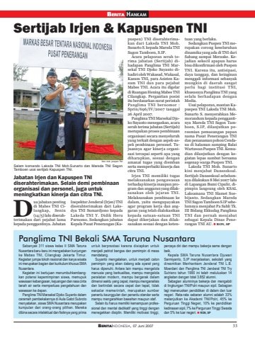 BERITAINDONESIA, 07 Juni 2007 33Sertijab Irjen & Kapuspen TNIPanglima TNI Bekali SMA Taruna NusantaraSebanyak 311 siswa kelas II SMA TarunaNusantara baru-baru ini mengadakan kunjunganke Mabes TNI, Cilangkap Jakarta Timur.Kegiatan jumpa tokoh nasional dan karya wisataini merupakan bagian dari kurikulum khusus SMANusantara.Kegiatan ini bertujuan menumbuhkembangkan potensi kepemimpinan siswa, memupukwawasan kebangsaan, kejuangan dan rasa cintatanah air serta memperluas pengetahuan danwawasan ke depan.Panglima TNI Marsekal Djoko Suyanto dalamceramah pembekalannya di Aula Gatot Subrotomenyatakan, siswa SMA Nusantara merupakankumpulan dari orang-orang pilihan. Merekadibina secara intelektual dan fisiknya yang primauntuk berprestasi karena disiapkan untukmenjadi patriot bangsa dan pemimpin di masamendatang.Suyanto mengatakan, untuk menjadi calonpemimpin yang akan datang ada syarat yangharus dipenuhi. Antara lain mampu mengelolamanusia yang berkualitas, mampu mengelolaperalatan modern, mampu bergerak dalamdimensi waktu yang cepat, mampu menganalisisdan bertindak secara cepat dan tepat, tidaksekadar memerintah, merupakan sumberpenentu keunggulan dan penentu standar sertamampu mengarahkan bawahan maupun staf.Selain itu harus memiliki kemampuan professional dan mental dedikatif yang tinggi denganmenegakkan disiplin. Memiliki motivasi tinggi,percaya diri dan mampu bekerja sama denganbaik.Kepala SMA Taruna Nusantara DjuwariSarmiyanto, S,IP menjelaskan, sekolah yangdiresmikan Menhankam Jenderal TNI L.B.Moerdani dan Panglima TNI Jenderal TNI TrySutrisno tahun 1990 ini telah meluluskan 14angkatan dengan total 3.852 alumni.Sebagian alumninya bekerja dan mengabdidi lingkungan TNI/Polri maupun sipil. Sebagianlagi meneruskan pendidikan di dalam dan luarnegeri. Rata-rata sebaran alumni adalah 33%melanjutkan ke Akademi TNI/Polri, 45% kePerguruan Tinggi Negeri, 10% ke pendidikankedinasan sipil, 7% ke Perguruan Tinggi Swastadan 5% ke luar negeri. RON, SPJabatan Irjen dan Kapuspen TNIdiserahterimakan. Selain demi pembinaanorganisasi dan personel, juga untukmeningkatkan kinerja dan citra TNI.ua jabatan pentingdi Mabes TNI Cilangkap, Senin(14/5) lalu diserahterimakan dari pejabat lamakepada penggantinya. JabatanInspektur Jenderal (Irjen) TNIdiserahterimakan dari Laksdya TNI Sumardjono kepadaLaksda TNI Y. Didik HeruPurnomo. Sedangkan jabatanKepala Pusat Penerangan (Kapuspen) TNI diserahterimakan dari Laksda TNI Moh.Sunarto S. kepada Marsda TNISagon Tamboen, S.IP.Acara pelaporan serah terima jabatan (Sertijab) dihadapan Panglima TNI Marsekal TNI Djoko Suyanto dihadiri oleh Wakasad, Wakasal,Kasum TNI, para Asisten Kasum TNI dan para pejabatMabes TNI. Acara itu digelardi Ruangan Hening Mabes TNICilangkap. Pergantian posisiitu berdasarkan surat perintahPanglima TNI bernomor :Sprin/696/IV/2007 tanggal26 April 2007.Panglima TNI Marsekal Djoko Suyanto menegaskan, acaraserah terima jabatan (Sertijab)merupakan proses pembinaanorganisasi secara menyeluruhyang terkait dengan aspek-aspek pembinaan personel. Tujuannya agar kinerja organisasi tercapai seperti apa yangdiharapkan, sesuai denganamanat tugas yang diembanserta memperbaiki kinerja dancitra TNI.Irjen TNI memiliki tugasmelaksanakan pengawasanterhadap kinerja maupun program dan anggaran yang dilaksanakan oleh jajaran TNI.Melaksanakan pembinaan kedalam, yaitu mengupayakanagar program kerja dan anggaran yang telah dialokasikankepada satuan-satuan TNIdapat dikerjakan dan dilaksanakan sesuai dengan ketentuan yang berlaku.Sedangkan Puspen TNI merupakan corong keseluruhandinamika yang ada di TNI dariSabang sampai Merauke. Kejadian sekecil apapun harusbisa dikonfirmasi oleh PuspenTNI. Karena itu, antisipasi,daya tanggap, dan keinginanmenggali informasi sebanyakmungkin di daerah sangatperlu bagi institusi TNI,khususnya Panglima TNI yangselalu berhadapan denganMedia.Usai pelaporan, mantan Kapuspen TNI Laksda TNI Moh.Sunarto S. menyerahkan Memorandum kepada penggantinya Marsda TNI Sagon Tamboen, S.IP, dilanjutkan peresmian pemasangan papannama Pusat Penerangan TNIdan penanaman pohon Cendana di halaman samping BalaiWartawan Puspen TNI. Kemudian dilanjutkan dengan kegiatan lepas sambut bersamasegenap warga Puspen TNI.Laksda TNI Moh. Sunartokini menjabat Danseskoal.Sertijab Danseskoal sebelumnya dilakukan 8 Mei 2007 laludi Lapangan Bumi Cipulir, dipimpin langsung oleh KSALLaksamana TNI Slamet Soebijanto. Sedangkan MarsdaTNI Sagon Tamboen S.IP sebelumnya menjabat Pa Sahli Tk.III Bidang Ekkudag PanglimaTNI dan pernah menjabatsebagai Kepala Dinas PeneDrangan TNI AU. RON, SPSalam komando Laksda TNI Moh.Sunarto dan Marsda TNI SagonTamboen usai sertijab Kapuspen TNI.foto: dok. puspen TNIBERITA HANKAM
