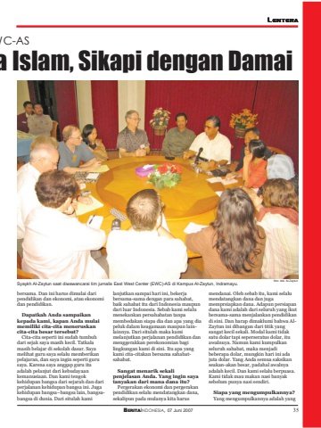 BERITAINDONESIA, 07 Juni 2007 35LENTERAbersama. Dan ini harus dimulai daripendidikan dan ekonomi, atau ekonomidan pendidikan.Dapatkah Anda sampaikankepada kami, kapan Anda mulaimemiliki cita-cita meneruskancita-cita besar tersebut?Cita-cita seperti ini sudah tumbuhdari sejak saya masih kecil. Tatkalamasih belajar di sekolah dasar. Sayamelihat guru saya selalu memberikanpelajaran, dan saya ingin seperti gurusaya. Karena saya anggap guru ituadalah pelanjut dari kebudayaankemanusiaan. Dan kami tengokkehidupan bangsa dari sejarah dan dariperjalanan kehidupan bangsa ini. Jugakehidupan bangsa–bangsa lain, bangsabangsa di dunia. Dari situlah kamilanjutkan sampai hari ini, bekerjabersama-sama dengan para sahabat,baik sahabat itu dari Indonesia maupundari luar Indonesia. Sebab kami selalumenekankan persahabatan tanpamembedakan siapa dia dan apa yang diapeluk dalam keagamaan maupun lainlainnya. Dari situlah maka kamimelanjutkan perjalanan pendidikan danmenggerakkan perekonomian bagilingkungan kami di sini. Itu apa yangkami cita-citakan bersama sahabatsahabat.Sangat menarik sekalipenjelasan Anda. Yang ingin sayatanyakan dari mana dana itu?Pergerakan ekonomi dan pergerakanpendidikan selalu mendatangkan dana,sekalipun pada mulanya kita harusmendanai. Oleh sebab itu, kami selalumendatangkan dana dan jugamemprsiapkan dana. Adapun persiapandana kami adalah dari seluruh yang ikutbersama-sama menjalankan pendidikandi sini. Dan harap dimaklumi bahwa AlZaytun ini dibangun dari titik yangsangat kecil sekali. Modal kami tidaksatu dolar tapi seperseratus dolar, ituawalnuya. Namun kami kumpulkanseluruh sahabat, maka menjadibeberapa dolar, mungkin hari ini adajuta dolar. Yang Anda semua saksikanseakan-akan besar, padahal awalnyaadalah kecil. Dan kami selalu berpuasa.Kami tidak mau makan nasi banyaksebelum punya nasi sendiri.Siapa yang mengumpulkannya?Yang mengumpulkannya adalah yangWC-ASa Islam, Sikapi dengan DamaiSyaykh Al-Zaytun saat diwawancarai tim jurnalis East West Center (EWC)-AS di Kampus Al-Zaytun, Indramayu. foto: dok. Al-Zaytun