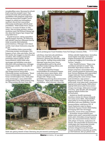 BERITAINDONESIA, 07 Juni 2007 41LENTERAmenghasilkan emas. Banoang itu sebuahbuah yang bisa menjadi emas. Tapibelum tersentuh oleh pembangunanpendidikan oleh pimpinan negaranya.Sekarang masyarakat bangkit, besoktanggal 20 adalah hari kebangkitannasional, diawali dari masyarakatCibanoang membangun sebuah pusatpendidikan. Tidak terlalu besar, hanyaseluas 6 x 16 meter di lahan 10 ribumeter. Dan ini tahap pertama, mudahmudahan nanti Pak Richard datang lagi,dan akan kita bangun lagi, bangun lagiyang lebih besar.”Syaykh berpesan, tolong sampaikankepada bangsa Amerika, di Cibanoangada sekolah yang baru dibangun karenatidak tersentuh oleh kebijakanpemerintahnya. Dibangun oleh rakyatsendiri, buat rakyat Indonesia yang adadi sini.“Kita buktikan bahwa masyarakatCibanoang mampu membangun. Kitabangun 31 hari, alias satu bulan. Hari inikita mulai, dan tanggal 23 Juni kita akanresmikan. Kita undang pemimpinpemimpin supaya paham, di sinimasyarakatnya sudah tidak sabarmenunggu apa kebijakan yang akandiberikan oleh pemimpinnya, sehinggamembangun sendiri,” urai Syaykh AlZaytun.Syaykh menyampaikan rasa iba, harudan bangga karena masyarakatCibanoang mampu membangun. “Kamihanya mendatangkan tukang, kamihanya mendatangkan batu, tidak pakaiuang membangun, sama sekali tidakmenggunakan uang, tidak penting uangitu. Yang penting ada batu, batu adapabriknya, batu bata ada pabriknya,semen ada pabriknya, kayu adahutannya, genteng ada pabriknya, tidaklaku uang itu. Apalagi masyarakat tidakdipungut uang sesen pun, hanyamengumpulkan padi 20 Kg untukmemberi makan tukang selama satubulan,” jelas SyaykhSyaykh memaparkan bangsaberpendidikan itu maknanya bangsayang akan punya masa depan, akanmampu menginjak masa depannyadengan baik. Bangsa yangpendidikannya kurang akan suram masadepannya. “Maka anak-anakku rebutpendidikan, rebut toleransi. Akan kitadirikan sekolah tingkat dasar, kemudiannanti tingkat menengah, kemudiantingkat menengah atas, kemudianperguruan tingginya ke Universitas AlZaytun,” katanya.Lalu, Syaykh bertanya: “Siapa yangmembiayai sekolah ini nanti?” Dankemudian dijawabnya sendiri: “Kitabangsa yang kuat, masyarakat yangkuat, yayasan pesantren Indonesia yangkuat, karena didukung oleh masyarakat.Jangan kahwatir biaya pendidikan,paling-paling kita cuma urunan. Tidakusah membayar, tapi urunan.”Bagaimana caranya? “Karena di sinipunya padi, urun pakai padi, yang punyajagung urun pakai jagung, tidak punyajagung tidak punya padi, hanya punyatenaga urun tenaga, tidak punya tenagaurun doa,” jelas Syaykh, lalu mengajaksegenap hadirin berdoa danberbasmalah.Setelah ini Syaykh memimpinmembaca Asmau AL-Husna sebanyak100 nama-nama Allah, Alhamdulilah,tepat pukul 14.00 kurang dua menitpeletakan batu asas dilakukan. Syaykhmempersilakan wakil ketua YPI, HImam Suprianto maju ke depan,sekertaris Yayasan Ustadz Abdul Halimmemegang tabir dan menunggukomando, sesuai sirine yang berbunyi.Kemudian mempersilakan parapelajar putra-putri, masyarakat pemudaputra-putri, kemudian orang tua putraputri, dan masyarakat lainnya, disusuloleh pelajar Al-Zaytun, mahasiswa AlZaytun, dan masyarakat Al-Zaytun sertarombongan dari masyarakat jurnalisAmerika Serikat memasang batupertama sebagai kenang-kenangantempat pendidikan yang akan go public,go international, dan go global. AZDenah pembangunan Pusat Pendidikan Putra-Putri Bangsa Indonesia (P4BI).Salah satu gedung sekolah di Desa Cibanoang yang tak tersentuh pembangunan.foto: dok. Al-Zaytunfoto: dok. Al-Zaytun