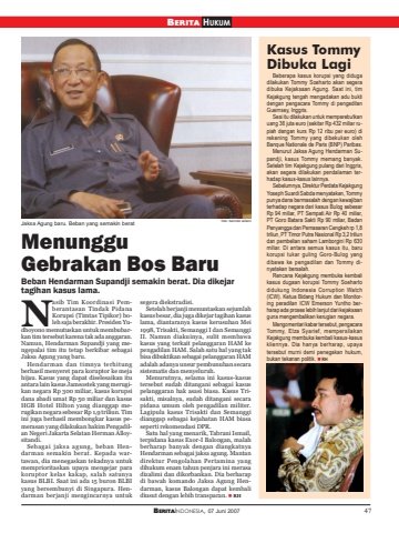 BERITAINDONESIA, 07 Juni 2007 47MenungguGebrakan Bos BaruBeban Hendarman Supandji semakin berat. Dia dikejartagihan kasus lama.Kasus TommyDibuka LagiBeberapa kasus korupsi yang didugadilakukan Tommy Soeharto akan segeradibuka Kejaksaan Agung. Saat ini, timKejakgung tengah mengadakan adu buktidengan pengacara Tommy di pengadilanGuernsey, Inggris.Sesi itu dilakukan untuk memperebutkanuang 36 juta euro (sekitar Rp 432 miliar rupiah dengan kurs Rp 12 ribu per euro) direkening Tommy yang dibekukan olehBanque Nationale de Paris (BNP) Paribas.Menurut Jaksa Agung Hendarman Supandji, kasus Tommy memang banyak.Setelah tim Kejakgung pulang dari Inggris,akan segera dilakukan pendalaman terhadap kasus-kasus lainnya.Sebelumnya, Direktur Perdata KejakgungYoseph Suardi Sabda menyatakan, Tommypunya dana bermasalah dengan kewajibanterhadap negara dari kasus Bulog sebesarRp 94 miliar, PT Sempati Air Rp 40 miliar,PT Goro Batara Sakti Rp 90 miliar, BadanPenyangga dan Pemasaran Cengkeh rp 1,8triliun, PT Timor Putra Nasional Rp 3,2 triliundan pembelian saham Lamborgini Rp 630miliar. Di antara semua kasus itu, barukorupsi tukar guling Goro-Bulog yangdibawa ke pengadilan dan Tommy dinyatakan bersalah.Rencana Kejakgung membuka kembalikasus dugaan korupsi Tommy Soehartodidukung Indonesia Corruption Watch(ICW). Ketua Bidang Hukum dan Monitoring peradilan ICW Emerson Yuntho berharap ada proses lebih lanjut dari kejaksaanguna mengembalikan kerugian negara.Mengomentari kabar tersebut, pengacaraTommy, Elza Syarief, mempersilakanKejakgung membuka kembali kasus-kasuskliennya. Dia hanya berharap, upayatersebut murni demi penegakan hukum,bukan tekanan politik. RHasib Tim Koordinasi Pemberantasan Tindak PidanaKorupsi (Timtas Tipikor) boleh saja berakhir. Presiden Yudhoyono memutuskan untuk membubarkan tim tersebut karena tak ada anggaran.Namun, Hendarman Supandji yang mengepalai tim itu tetap berkibar sebagaiJaksa Agung yang baru.Hendarman dan timnya terhitungberhasil menyeret para koruptor ke mejahijau. Kasus yang dapat diselesaikan ituantara lain kasus Jamsostek yang merugikan negara Rp 300 miliar, kasus korupsidana abadi umat Rp 50 miliar dan kasusHGB Hotel Hilton yang dianggap merugikan negara sebesar Rp 1,9 triliun. Timini juga berhasil membongkar kasus pemerasan yang dilakukan hakim Pengadilan Negeri Jakarta Selatan Herman Alloysitandi.Sebagai jaksa agung, beban Hendarman semakin berat. Kepada wartawan, dia menegaskan tekadnya untukmemprioritaskan upaya mengejar parakoruptor kelas kakap, salah satunyakasus BLBI. Saat ini ada 15 buron BLBIyang bersembunyi di Singapura. Hendarman berjanji mengincarnya untuksegera diekstradisi.Setelah berjanji menuntaskan sejumlahkasus besar, dia juga dikejar tagihan kasuslama, diantaranya kasus kerusuhan Mei1998, Trisakti, Semanggi I dan SemanggiII. Namun diakuinya, sulit membawakasus yang terkait pelanggaran HAM kepengadilan HAM. Salah satu hal yang takbisa dibuktikan sebagai pelanggaran HAMadalah adanya unsur pembunuhan secarasistematis dan menyeluruh.Menurutnya, selama ini kasus-kasustersebut sudah ditangani sebagai kasuspelanggaran hak asasi biasa. Kasus Trisakti, misalnya, sudah ditangani secarapidana umum oleh pengadilan militer.Lagipula kasus Trisakti dan Semanggidianggap sebagai kejahatan HAM biasaseperti rekomendasi DPR.Satu hal yang menarik, Tabrani Ismail,terpidana kasus Exor-I Balongan, malahberharap banyak dengan diangkatnyaHendarman sebagai jaksa agung. Mantandirektur Pengolahan Pertamina yangdihukum enam tahun penjara ini merasadizalimi dan dikorbankan. Dia berharapdi bawah komando Jaksa Agung Hendarman, kasus Balongan dapat kembalidiusut dengan lebih transparan. RHNJaksa Agung baru. Beban yang semakin berat foto: berindo wilsonBERITA HUKUM