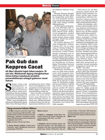 BERITAINDONESIA, 07 Juni 2007 49BERITA HUKUMPak Gub danKeppres CacatAli Mazi dituntut tujuh tahun penjara. Disisi lain, Mahkamah Agung mengeluarkanfatwa bahwa keputusan presidenpenonaktifannya sebagai gubernur cacathukum.ebagai orang yangberpengalaman sebagai pengacara, AliMazi terus mencaripeluang hukum untuk membebaskannya dari jerat hukumdalam kasus perpanjangan hakguna bangunan Hotel Hiltonyang kini bernama Hotel Sultan.Kabar yang melegakannyadatang dari Mahkamah Agung(MA). Ketua MA Bagir Mananmengeluarkan fatwa dalamkasus penonaktifannya sebagai gubernur oleh DepartemenDalam Negeri. Isi fatwa itu:penonaktifannya tidak sah.Fatwa tersebut merupakanjawaban atas surat permohonan yang dikirimnya keKetua MA Bagir Manan, 16Maret 2007. Ali Mazi memintapendapat hukum dari MA mengenai penonaktifannya sebagai Gubernur Sulawesi Tenggara.Menurut Bonaran Saragih,kuasa hukum Ali Mazi, fatwaitu memperjelas posisi kliennya saat mengurus perpanjangan HGB Hotel Hilton pada1999, yakni sebagai advokatbukan gubernur.Ali Mazi dalam pembelaannya yang dibacakan pada sidang di Pengadilan Negeri(PN) Jakarta Pusat, Selasa,(15/5) mengatakan, perkarayang dihadapinya tersebutpenuh dengan nuansa politiksehingga terjadi bias politikdan bias yuridis.Dia menilai dakwaan JPUyang menggunakan UndangUndang (UU) No 31 tahun1999 jo Undang-Undang No20 tahun 2001 tentang Pemberantasan Tindak PidanaKorupsi melanggar asas legalitas, karena undang-undang itu berlaku sejak 16 Agustus 1999. Adapun permohonanperpanjangan HGB Hotel Hilton diajukannya ke KantorBadan Pertanahan Nasional(BPN) Kotamadya JakartaPusat pada 15 Juni 1999.Menurutnya, ketentuan pidana itu tidak boleh berlakusurut, baik mengenai ketetapan dapat dipidana maupunsanksinya. Lebih lanjut terdakwa mengatakan, perpanjanganHGB No 26 dan No 27 atasnama PT Indobuildco adalahsah menurut hukum. Terlebihlagi, katanya, karena adanyaputusan perdata PN JakartaSelatan yang menyatakanHGB itu sah menurut hukum,sementara Surat Keputusan(SK) Kepala BPN No 169 tahun1989 tentang Penerbitan HakPengelolaan Lahan (HPL) No1 atas nama Sekretariat Negaradinyatakan cacat hukum dantidak mengikat.Oleh karena itu, Ali Mazimeminta majelis hakim PNJakarta Pusat pimpinan Andriani Nurdin agar janganmenjatuhkan hukuman berdasarkan tekanan pendapatumum yang dibentuk karenatidak senang terhadap dirinya.Dalam persidangan sebelumnya, jaksa penuntut umumyang dipimpin Ali Mukartonomenuntut terdakwa PontjoSutowo dan Ali Mazi denganpidana tujuh tahun penjara.Menurut jaksa, kedua terdakwa melanggar UndangUndang Pemberantasan Tindak Pidana Korupsi karenamelakukan perpanjangan hakguna bangunan Hilton tanpaseizin pengelola Gelora BungKarno sebagai pemegang hakpengelolaan lahan kawasanSenayan. Padahal, kata jaksa,status tanah tempat berdirinyaHilton—kini The Sultan—sudah beralih menjadi tanahyang dikelola negara. “Seharusnya terdakwa harus terlebih dulu memperoleh penunjukan berupa perjanjianpenggunaan tanah dari pengelola,” ujar jaksa.Selain tuntutan tujuh tahunpenjara, jaksa juga menjatuhkan denda kepada masing-masing terdakwa sebesar Rp 500juta atau hukuman penggantiselama enam bulan kurungan.Jaksa juga menuntut pencabutan hak guna bangunanatas nama PT Indobuildco.Kedua pengacara terdakwa,yakni O.C. Kaligis, pengacaraAli Mazi, dan Frans Winata, pengacara Pontjo, mengatakankecewa. Frans mempertanyakan kenapa perbuatan kliennyadalam permohonan perpanjangan dikategorikan sebagaikasus korupsi. Menurutnya,lebih tepat lingkup administrasinegara atau perdata. RON, RHYang terseret lahan Hilton:1. Ali Mazi, pengacara yang diberi tugas PontjoSutowo memperpanjang HGB Hotel Hilton, 1999,berbekal salinan surat rekomendasi dari Setneg.Belakangan, kejaksaan menyatakan perpanjangan HGB tidak sah karena lahan berstatus hakpengelolaan tanah (HPL).Status: terdakwa. Dituntut tujuh tahun.2. Ronny Kusuma Judistiro, Kepala KantorPertanahan Jaksel. Mengabulkan permohonanperpanjangan HGB Hilton.Status: terdakwa.3. Robert L. Lumempaw, Kepala Badan Pertanahan Nasional DKI Jakarta. Menyetujui danmemperpanjang HGB Hilton, Juni 2002.Status: terdakwa.4. Alirahman, Menteri Sekretaris Negara. Mengeluarkan salinan surat rekomendasi perpanjangan HGB Hilton yang dibuat Mensesnegsebelumnya, Muladi. Dikeluarkan atas permintaan Ali Mazi, 10 November 1999. Alirahmanmeminta keterangan Muladi mengenai surat itu,yang dijawab belum selesai proses administrasi.Status: saksi.5. Muladi, Menteri Sekretaris Negara. Membuatsurat rekomendasi izin perpanjangan HGB HotelHilton yang ditandatangani 14 Oktober 1999. tapisurat itu langsung diblokir karena tidak disertaikajian hukum dan perhitungan kompensasi.Status: saksi.SKasus HGB Hilton terus bergulir foto: berindo wilson