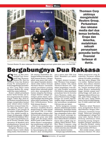 50 BERITAINDONESIA, 07 Juni 2007BERITA MEDIABergabungnya Dua RaksasaThomson CorpakhirnyamengakuisisiReuters Group.Perkawinandua raksasamedia dari duabenua berbeda,Eropa danAmerika,melahirkansebuahperusahaanpenyedia beritafinansialterbesar didunia.elasa, 15 Mei 2007,menjadi hari bersejarah bagi ThomsonReuters Plc. Hari ituThomson Corp dan ReutersGroup Plc menyepakati sebuah penggabungan perusahaan baru yang diberi namaThomson-Reuters Plc, mengambil dua nama induknya.Reuters adalah perusahaankantor berita berusia 156 tahun yang berpusat di London,Inggris. Tahun 1851, Paul Julius Reuters memulai bisnis inidengan mengirimkan kuotasipasar saham antara Londondan Paris via kawat Calais-Dover. Sekarang, Reuters mempekerjakan 2.400 jurnalis di131 negara. Sedangkan Thomson Corp adalah pemilik jaringan perdagangan obligasiTradeWeb dan database Westlaw Legal yang berkantor pusat di Toronto, Kanada. Pusatoperasinya di Stamford, 80%pendapatannya berasal dariwilayah Amerika Utara itu.Keinginan Thomson mengakuisisi Reuters boleh dikatacukup mulus. Hal tersebut salah satunya disebabkan dukungan bahkan dorongan dariWali Amanat Reuters, sebagaipihak yang punya hak memveto upaya transaksi akuisisi.“Kami yakin bahwa formasiThomson-Reuters menandaisebuah perubahan pentingdalam bisnis informasi globalserta akan menegaskan kekuatan, integritas dan kelangsungan Reuters sebagai pemimpin global dalam informasi keuangan dan berita padatahun-tahun mendatang,” kataPehr Gyllenhammar, KetuaWali Amanat Reuters.Dalam kesepakatan itu,Thomson membeli Reutersdengan harga 8,7 miliar poundatau setara US$ 17,2 miliar.Diperhitungkan, dengan nilaiitu berarti per sahamnya samadengan 691 pence atau lebihtinggi 40% dari harga sahamReuters pada 14 Mei, sehari sebelum Reuters mengungkapkan pembicaraan merger tersebut. Dengan bergabungnyadua perusahaan tersebut, maka tiap pemegang satu sahamReuters akan mendapatkan352,5 pence atau US$ 6,99tunai, ditambah 0,16 sahamThomson.Dengan akuisisi tersebut,kini Thomson Corp mengendalikan sekitar 70% sahamThomson-Reuters Plc. Tapidalam pengelolaan, Tom Glocer yang terakhir menjabatCEO Reuters, akan memimpinperusahaan baru itu bersamaDavis Thomson, selaku pimpinan Thomson Corp. Penggabungan itu sendiri diperhitungkan dapat membantu kedua perusahaan menghematUS$ 500 juta per tahun.Berita mengenai rencanaakuisisi, sudah banyak tersebarsebelumnya. Kemudian keduapemimpin korporasi itu sempatjuga mengatakan bahwa akuisisi itu masih menungu kepastian dari para pemegang saham. Saham Reuters sendiri dikuasai oleh 15 pihak yang tergabung dalam Reuters Founders Share Company yangmempunyai wewenang penuhuntuk menerima atau menolaktawaran akuisisi tersebut.Sempat juga terbetik berita,bahwa penawaran yang disodorkan Thomson adalahsebesar 8,8 miliar poundsterling atau setara dengan US$17,5 miliar. Bahkan karenaberita akan adanya akuisisidengan penawaran setinggiitu, sempat membuat hargasaham Reuters melambungtinggi. Setelah sempat menjulang hingga 25% pada perdagangan saham di bursa London, pada Selasa minggu kedua Mei 2007, harga sahamkantor berita itu diperdagangkan 7% lebih mahal dari nilaiwajarnya.Besarnya minat ThomsonCorp mengakuisisi Reutersdiperlihatkan dengan keberaniannya mematok hargatinggi. Beberapa kalanganmenganggapnya sebagai halyang wajar, karena Reutersmemang sebelumnya telahberancang-ancang mengembangkan jaringan operasinyadi Amerika Serikat, selainmemperluas layanannya diEropa melalui AFX News.Kini setelah merger, sahamThomson-Reuters Plc akanSThomson-Reuters Plc akan melampaui Bloomberg sebagai pemimpin global dalam pasar informasi B2B.foto: nytimes-com