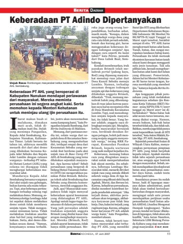 BERITAINDONESIA, 07 Juni 2007 53BERITA DAERAHKeberadaan PT Adindo DipertanyakanKeberadaan PT AHL yang beroperasi diKabupaten Nunukan mendapat perlawanandari masyarakat. Mereka memintaperusahaan ini segera angkat kaki. Sertamemohon kepada Menteri Kehutananuntuk meninjau ulang ijin perusahaan itu.barat makan buah simalakama, dimakanmati ayah, tidak dimakan mati ibu. Itulahyang menimpa Pangasilan,Kepala Adat Sembakung, Kabupaten Nunukan, Kalimantan Timur. Lelaki berusia 60tahun ini, akhirnya memilihmenarik diri dari aksi demoyang dilakukan bersama Kepala Adat Sebuku dan KepalaAdat Lumbis dengan ratusanwarganya - terhadap PT Adindo Hutani Lestari (AHL) yangselama ini dianggap tidakmenghargai keberadaan masyarakat adat.Mundurnya Kepala AdatSembakung bersama warganyadari aksi unjuk rasa gabungan,bukan karena ada suatu tekanan. Tapi, atas beberapa pertimbangan terhadap untung rugimelakukan demo. Memang, sebelumnya ketiga Lembaga Adatini sepakat dalam melakukandemo untuk tidak membawasenjata tajam. Tidak mengonsumsi minuman keras. Tidakmelakukan tindakan anarkisatau hal-hal yang melanggarhukum. Serta, aksi demo dilakukan secara damai. “Namun,kenyataanya semua terbalik.Ini, justru akan mencemarkannama kampung kami,” kata Pengasilan kepada Bambang, dariBerita Indonesia di Malinau.Memang, dari pantauan media ini, selain warga dari sepuluh desa di Kecamatan Sembakung yang mengundurkandiri, terdapat empat desa dariKecamatan Sebuku yang menolak ikut berdemo pada aksiunjuk rasa di Base Camp PTAHL di Sembakung yang terusdilakukan sejumlah masyarakat. Apa karena takut? Sebabperusahaan yang bergerak dibidang Hutan Tanaman Industri (HTI) ini mengerahkan pasukan Polisi Brimob. Beberapa tokoh adat Sembakung danSebuku yang diminta komentarnya, menolak anggapan itu.Jadi, apa? Masyarakat nampaknya tidak ingin menyoalkeberadaan aparat keamananyang didatangkan PT AHL.Apalagi untuk tugas-tugas keamanan di dalam perusahaan.Yang jadi persoalan adalahtindakan sejumlah anggotaBrimob yang dinilai kasar danarogan menghadapi masyarakat. Mereka (Brimob, Red)adalah aparat keamanan, tidakhanya milik perusahaan. Mereka juga orang-orang berpendidikan, berbadan sehat,masih muda. “Kenapa, dalammenghadapi warga desa yangrata-rata tidak pernah sekolah,lemah dan kurang gizi, harusmenggunakan kekerasan dengan todongan senjata? Apadengan cara seperti itu kamitakut?” kata Petrus, pemudadari Desa Lubok Buat, Sembakung.Kendati membenarkan, trukpasukan Brimob telah menabrak portal (palang kayu,Red) yang dipasang masyarakat menutup ruas jalan dariDesa Kunyit Sebuku menujuLumbis. Namun, terhadapancaman dengan todongansenjata api dan kekerasan yangdilakukan anggota Brimob,dibantah. “Truk, memang menabrak balok yang dibentangkan di ruas jalan karena pasukan saya harus secepatnya tibadi Desa Mambulu KecamatanLumbis. Tapi, soal menodongkan senjata kepada masyarakat, itu tidak benar. Yang benar adalah; anggota saya dilengkapi senjata api. Mungkin,ketika masyarakat berunjukrasa, berdesak-desakan dengan petugas, boleh jadi moncong senjata anggota menyentuh warga,” terang RRR Parapat, Komandan PasukanBrimob, kepada wartawanyang naik meliput kejadian itu.Kekerasan, memang bukancara yang diinginkan masyarakat untuk mempertahankanhak ulayat mereka. Itu sebabnya, beberapa Lembaga Masyarakat Adat, menarik diri dariunjuk rasa yang semula diikutiseluruh warga desa di tiga kecamatan yang dihuni oleh DayakAgabak, Murut, dan Berusu ini.Karena, kehadiran perusahaan,dinilai memberi kontribusi kepada penduduk setempat. “Jikaterjadi demo, aktivitas perusahaan akan terganggu, akibatnya karyawan pun tidak bisakerja. Dan, kalau ini terjadi, yangrugi kami juga. Karena, sebagianbesar karyawan PT AJL adalahwarga kami,” kata Pengasilan,memberi alasan.Namun, tidak berarti tuntutan masyarakat adat terhadap PT AHL yang memilikiSurat Ijin HTI yang dikeluarkanDepartemen Kehutanan Republik Indonesia: SK Menhut No88/KPTS-II/1996 Tanggal 12Maret 1996 tersebut, berakhirsampai di situ. “PT AHL harusmenghormati hutan adat kami.Tanah, hutan, dan sungai merupakan landasan hidup kami.Perusahaan itu telah merusakekosistem kawasan hutan tanahulayat kami dengan menggantisatu jenis tanaman. Tak adapilihan lain, kecuali mengeluarkan hutan adat kami dari lahanyang dikuasai. Pemerintah,dalam hal ini Menteri Kehutanan RI harus turun tangan, karena merekalah yang memberiijin,” katanya kepada Berita Indonesia.Apa tanggapan pihak perusahaan yang telah melakukankegiatannya sebelum ijin Rencana Kerja Tahunan (RKT) Nomor: 2029/KPTS/DK-V/2007tanggal 29 Maret 2007 ini diberlakukan? “Batas-batas hakadat secara turun temurun, memang diakui warga. Namun,secara hukum, hak-hak batastersebut tidak ada, dan tidak sah.Bahkan, mereka juga tidak punyasurat kepemilikan tanah di HTItersebut,” kata Anton Silalahi, Estate Mgr. PT AHL Sembakung.Sejumlah pemerhati hutan diWilayah Utara Kaltim, menyayangkan pernyataan pimpinanPT AHL yang tidak berpihakkepada rakyat. Apakah merekatidak tahu sejarah perusahaanini, atau sengaja agar bentrokdengan masyarakat. Sebab, untuk mendapatkan ijin eksplorasihutan atau pemanfaatan sumber daya hutan, sudah tentumereka pasti tahu.Seandainya proses itu sudahbenar, baik di lapangan maupun dalam administrasi, pastitidak akan timbul kericuhankericuhan dengan masyarakat,mengingat salah satu prosesmendapatkan perijinan usahapemanfaatan hasil hutan adalah AMDAL (Analisa MengenaiDampak Lingkungan). “Kalauproses Amdal ini benar dilakukan di lapangan, tidak akan adakonflik,” kata Asran Nasution,Sekretaris LSM Bintang Persada Kaltara yang siap mendampingi masyarakat. SLP, BAMUnjuk Rasa: Rombongan masyarakat ketika berdemo ke kantor PTAHL Sembakung.I