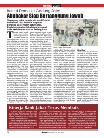 54 BERITAINDONESIA, 07 Juni 2007BERITA DAERAHBuntut Demo ke Gedung Sate:Abubakar Siap Bertanggung JawabSiapa yang bakal menduduki kursi PejabatSementara (Pjs) Bupati KabupatenBandung Barat masih belum jelas.Abubakar membantah dirinya berada dibalik aksi demonstrasi ke Gedung Sate.enggat waktu sudahmakin mepet, tapirencana pelantikancaretaker Bupati Kabupaten Bandung Barat (KKB)yang sekaligus peresmian kabupaten baru ini, Juni nanti,masih belum jelas. Nama Drs.H. Abubakar, M.Si. yang direkomendasikan Bupati Bandung H. Obar Sobarna, S,Ipsesuai klausul, UU 12/2007,memang masih berkibar. Namun di sisi lain, munculnya sejumlah nama yang kabarnyaditunjuk Gubernur Jabar danberasal dari luar, juga santerberkembang. Karena itu, ratusan aparatur desa yang menamakan diri Tiga Pilar Desadan Pegawai Negeri Sipil(PNS) serta PGRI berunjukrasa ke Gedung Sate, di JalanDiponegoro, Bandung.Gelombang pertama, Senin (7/5) terdiri dari rombongan parakepala desa, BPD dan LKMD seKabupaten Bandung Barat. Kemudian Selasa (8/5) terdiri dariorganisasi Korpri dan PGRI.Mereka meminta Gubernur Jawa Barat merekomendasikanSekda Kab. Bandung, Abubakar,sebagai salah satu calon PjsBupati KBB. Mereka juga meminta beraudiensi dengan Gubernur Danny Setiawan atauWagub Nu’man Abdul Hakim. Menurut Koordinator Aksiyang juga menjabat sebagaiKetua Asosiasi LKMD se-Kabupaten Bandung Barat, Abubakar merupakan figur yangsangat memahami administrasi, budaya dan programprogram Bandung Barat.Sementara itu, Gubernur Jawa Barat Danny Setiawan telahmengajukan tiga nama untukPjs Bupati KBB kepada Mendagri. Mereka adalah AsistenPemerintahan Provinsi JawaBarat, Tjatja Kuswara, KepalaBiro Dekonsentrasi SyamsudinAbas dan Sekda Kab. Bandung,Drs. H. Abubakar, M.Si.Wagub Nu’man Abdul Hakim, yang menerima aspirasipara pengunjuk rasa itu takkuasa menahan kegusarannya.“Tulis saja, saya sangat kesaldengan upaya politisasi ini.Segera hentikan! Kalau aparatur pelayanan masyarakatsudah melakukan hal sepertiitu, berarti tidak punya disiplin,dan tidak punya etika!” kataNu’man dengan nada tinggi.Wagub juga menekankan PNStidak boleh memasuki ruang politik praktis. “Jika mau melakukanmanuver politik, lakukan saatpemilihan kepala daerah mendatang”, katanya. Sebagai KetuaKorpri Kab. Bandung, Abubakarseharusnya tidak membiarkanaksi tersebut terjadi.Gubernur Danny Setiawanjuga menghimbau agar jajaranKorpri tidak memasuki duniapolitik praktis. “Saat ini, pejabatbupati di KBB itu memimpinteknis, bukan jabatan politis.Setelah digelar pemilihan kepala daerah, baru menjadi kancah politik,” ujarnya.Ketua Umum DPD PKS KBB,Didik Agus, sangat menyesalkan sikap pegawai negeriyang terlibat politik praktis danmeninggalkan tugas pelayanan.Ia meminta kepada BupatiBandung memberikan sanksikepada aparatnya yang terlibataksi karena telah meninggalkantugas pelayanan publik.Namun pengamat politik lokal, Herman Y. Ibrahim menyarankan agar tindakan aparatdesa serta anggota Korpri danPGRI ini tidak perlu ditanggapisecara emosional. Semua pihakhendaknya lebih melihat padasubstansi tuntutan mereka, yangmeminta agar persiapan teknisadministrasi KBB dilakukanoleh figur yang memang memiliki pengetahuan dan mengenal karakteristik daerahotonom baru itu.Minta MaafSementara itu, SekretarisDaerah Kab. Bandung, Abubakar, baik secara pribadi maupun selaku pengurus Korpri,meminta maaf atas aksi massaitu yang tidak mencirikan etikaaparatur yang baik. “Saya bertanggung jawab,” katanya disela-sela Musyawarah ProvinsiLuar Biasa Korpri Jabar diBandung baru-baru ini.Atas kejadian itu, BupatiBandung Obar Sobarna belummenentukan sanksi yang mungkin diberikan. Pihaknya masihakan menelaah duduk persoalannya. “Kita juga belum tahu apakah mereka demo atauhanya menyampaikan aspirasi.Tidak bisa sembarangan mengambil keputusan,” kata Obar. Mengenai adanya desakansejumlah fraksi di DPRD Kab.Bandung agar mencopot Abubakar dari jabatan Sekda, Obarmenilai Abubakar tidak terlibat dalam pengerahan massauntuk unjuk rasa ke GedungSate. AW, SBR, SPTDemo PNS di Gedung SateKinerja Bank Jabar Terus MembaikDi tengah persaingan perbankan yangsemakin tajam, Bank Jabar yang dikomandoiAgus Ruswendi, terus berbenah. Agus jugabertekad mengantarkan bank ini menjadi yangterbesar di Bandung tahun 2010.Selain itu, ia juga ingin Bank Jabar selalu siap menghadapi dinamika dunia perbankan dengan terusmelakukan penyesuaian aturan. Antara lain di bidangekspor impor, yaitu dengan menerapkan uniform customs and practise for documentary credit (UCP).Penerapan UCP 600 menggantikan UCP 500di Bank Jabar pada tanggal 1 Juli nantimerupakan upaya Bank Jabar dalam mendukung berkembangnya para pengusaha yangmelakukan bisnis perdagangan luar negeri.Pada acara Sosialisasi UCP 600 yang dilangsungkan di Hotel Hyatt Bandung, dua pekan lalu,Agus mengungkapkan bahwa bank milik PemdaJabar hingga akhir April 2007 telah berhasil memperoleh laba operasional sebelum pajak sebesarRp. 192,76 miliar. Selain itu, volume usaha BankJabar mencapai Rp. 23,44 triliun, meningkat dariposisi akhir tahun lalu, sekitar Rp 21,29 triliun. Sedangkan penghimpunan dana masyarakat hinggaApril ini tercatat Rp. 18,41 triliun dibanding akhirtahun 2006 yang hanya sekitar Rp. 15,54 triliun.“Perkembangan kredit kami juga cukup menggembirakan. Sampai April ini telah mencapai Rp12,30 triliun dari posisi akhir tahun yang mencapaiRp. 11,76 triliun,” kata Agus. AW. SBR. SP