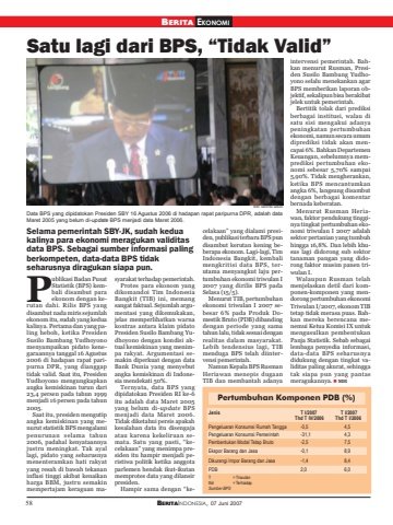 58 BERITAINDONESIA, 07 Juni 2007Satu lagi dari BPS, “Tidak Valid”Pertumbuhan Komponen PDB (%)Dikurangi Impor Barang dan Jasa -1,4 8,4PDB 2,0 6,0T = Triwulanthd = TerhadapSumber BPSJenis T I/2007 T I/2007Thd T IV/2006 Thd T I/2006Pengeluaran Konsumsi Rumah Tangga -0,5 4,5Pengeluaran Konsumsi Pemerintah -31,1 4,3Pembentukan Modal Tetap Bruto -2,5 7,5Ekspor Barang dan Jasa -0,1 8,9ublikasi Badan PusatStatistik (BPS) kembali disambut paraekonom dengan kerutan dahi. Rilis BPS yangdisambut nada miris sejumlahekonom itu, sudah yang keduakalinya. Pertama dan yang paling heboh, ketika PresidenSusilo Bambang Yudhoyonomenyampaikan pidato kenegaraannya tanggal 16 Agustus2006 di hadapan rapat paripurna DPR, yang dianggaptidak valid. Saat itu, PresidenYudhoyono mengungkapkanangka kemiskinan turun dari23,4 persen pada tahun 1999menjadi 16 persen pada tahun2005.Saat itu, presiden mengutipangka kemiskinan yang menurut statistik BPS mengalamipenurunan selama tahun2006, padahal kenyataannyajustru meningkat. Tak ayallagi, pidato yang seharusnyamenenteramkan hati rakyatyang resah di bawah tekananinflasi tinggi akibat kenaikanharga BBM, justru semakinmempertajam keraguan masyarakat terhadap pemerintah.Protes para ekonom yangdikomandoi Tim IndonesiaBangkit (TIB) ini, memangsangat faktual. Sejumlah argumentasi yang dikemukakan,jelas memperlihatkan warnakontras antara klaim pidatoPresiden Susilo Bambang Yudhoyono dengan kondisi aktual kemiskinan yang menimpa rakyat. Argumentasi semakin diperkuat dengan dataBank Dunia yang menyebutangka kemiskinan di Indonesia mendekati 50%.Ternyata, data BPS yangdipidatokan Presiden RI ke-6itu adalah data Maret 2005yang belum di-update BPSmenjadi data Maret 2006.Tidak diketahui persis apakahkesalahan data itu disengajaatau karena kekeliruan semata. Satu yang pasti, “kecelakaan” yang menimpa presiden itu hampir menjadi peristiwa politik ketika anggotaparlemen hendak ikut-ikutanmemprotes data yang dilansirpresiden.Hampir sama dengan “keintervensi pemerintah. Bahkan menurut Rusman, Presiden Susilo Bambang Yudhoyono selalu menekankan agarBPS memberikan laporan objektif, sekalipun bisa berakibatjelek untuk pemerintah.Bertitik tolak dari prediksiberbagai institusi, walau disatu sisi mengakui adanyapeningkatan pertumbuhanekonomi, namun secara umumdiprediksi tidak akan mencapai 6%. Bahkan DepartemenKeuangan, sebelumnya memprediksi pertumbuhan ekonomi sebesar 5,70% sampai5,90%. Tidak mengherankan,ketika BPS mencantumkanangka 6%, langsung disambutdengan berbagai komentarbernada keberatan.Menurut Rusman Heriawan, faktor pendukung tingginya tingkat pertumbuhan ekonomi triwulan I 2007 adalahsektor pertanian yang tumbuhhingga 16,8%. Dan lebih khusus lagi didorong sub sektortanaman pangan yang didorong faktor musim panen triwulan I.Walaupun Rusman telahmenjelaskan detil dari komponen-komponen yang mendorong pertumbuhan ekonomiTriwulan I/2007, ekonom TIBtetap tidak merasa puas. Bahkan mereka berencana menemui Ketua Komisi IX untukmengusulkan pembentukanPanja Statistik. Sebab sebagailembaga penyedia informasi,data-data BPS seharusnyadidukung dengan tingkat validitas paling akurat, sehinggatak siapa pun yang pantasmeragukannya. MHPSelama pemerintah SBY-JK, sudah keduakalinya para ekonomi meragukan validitasdata BPS. Sebagai sumber informasi palingberkompeten, data-data BPS tidakseharusnya diragukan siapa pun.celakaan” yang dialami presiden, publikasi terbaru BPS pundisambut kerutan kening beberapa ekonom. Lagi-lagi, TimIndonesia Bangkit, kembalimengkritisi data BPS, terutama menyangkut laju pertumbuhan ekonomi triwulan I2007 yang dirilis BPS padaSelasa (15/5).Menurut TIB, pertumbuhanekonomi triwulan I 2007 sebesar 6% pada Produk Domestik Bruto (PDB) dibandingdengan periode yang samatahun lalu, tidak sesuai denganrealitas dalam masyarakat.Lebih tendensius lagi, TIBmenduga BPS telah diintervensi pemerintah.Namun Kepala BPS RusmanHeriawan menepis dugaanTIB dan membantah adanyaData BPS yang dipidatokan Presiden SBY 16 Agustus 2006 di hadapan rapat paripurna DPR, adalah dataMaret 2005 yang belum di-update BPS menjadi data Maret 2006.foto: berindo wilsonBERITA EKONOMI