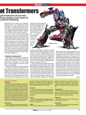 BERITAINDONESIA, 07 Juni 2007 63BERITA HIBURANot TransformersStarscream (F-22 Raptor jet), Blackout(MH-53 Pave Low helicopter), Brawl(Modified M1 Abrams battle tank), Barricade (Saleen-modified Ford Mustang Police cruiser), Frenzy (CD player), Bonecrusher (Buffalo H Mine-Protected Vehicle),dan Scorponok (Mechanical Scorpion).Secara garis besar, kisah dalam filmversi layar lebar tidak jauh berbedadengan kisah dalam versi kartunnya yangmenceritakan tentang duel antara robotyang baik Autobots melawan robot yangjahat Decepticons. Pertempuran merekasampai ke Bumi dan menyebabkan masadepan manusia terancam. Sedangkandalam film versi layar lebar ini diceritakantentang Sam Witwicky yang diperankanoleh Shia LaBeouf menemukan sebuahpeta ke Allspark, sebuah sumber kehidupan yang menjadi perebutan antara Autobots dan Decepticons.Transformers Generation 1Setidaknya, Transformers versi kartunsudah mempunyai beberapa sekuel dimulai dari Generation 1 (G1), kemudianberlanjut ke ‘Generation 2’ (G2), ‘BeastWars’, ‘Beast Machines’, ‘Robots In Disguise’, dan ‘Armada’.Kisah Transformers yang dulu diputardi Indonesia adalah Transformers G1.Agar tidak terlalu sulit memahami ceritadalam versi layar lebarnya nanti, tidak adasalahnya kita membuka kembali ceritalama di G1. Alkisah, sebuah planet bernama Cybertron sedang dalam ancaman.Pertempuran berkepanjangan antaraAutobots dan Decepticonstelah merusak planet tempat mereka tinggal. Planet itu keluar dari orbitdan terjebak dalam ladang asteroid. Optimus Prime, pemimpin Autobots,membuat rencana untukmenyelamatkanplanetmereka.Optimusbersama sekelompok Autobots menaikikapal ‘The Ark’ dengan tujuan mencaridunia baru demi mengumpulkan semuaenergi yang bisa mereka temukan agarbisa menyelamatkan planet Cybertrondari kehancuran. Sayangnya, Megatron,pemimpin Decepticons mengetahui rencana itu dan berusaha menghancurkanpesawat Autobots ‘The Ark’.Pesawat Decepticons kemudian menggabungkan diri dengan The Ark secarapaksa. Masih dalam pertempuran, Optimus Prime memutuskan menghancurkan‘The Ark’ di planet Bumi untuk mengalahkan Decepticons. Kedua pesawat itu memasuki atmosfir bumi lalu terpisah. Pesawat Decepticons jatuh ke laut dan TheArk jatuh ke pegunungan. Selama 4 jutatahun kemudian, pertempuran terhenti.Tahun 1984, gunung tempat jatuhnya ‘TheArk’ meletus dan menghidupkan kembalikomputer di ‘The Ark’, Teletran-1. Karenamengalami kerusakan, komputer inimalah ‘menghidupkan’ kembali Autobotsdan Decepticons. Komputer membentukmereka (beradaptasi) sesuai dengan objekyang ada di bumi (mobil, motor, bendabenda lainnya) namun bisa berubahkembali menjadi bentuk asli mereka yangberbentuk robot. Autobot dan Decepticons kembali berperang sambil terusberharap siapapun di antara mereka bisakembali ke Cybertron. Bumi menjaditempat pertempuran dan petualanganbaru dimana robot-robot baru dari keduabelah pihak juga bermunculan. MLPggih Transformers di layar lebarak bagi sebagian orang. Impian ituhi awal Juli mendatang.D E C E P T I C O N SMEGATRONIa adalah pemimpin kejam dengan kemampuan dahsyat. Tidak seperti tokoh penjahat dalam cerita fiksi lainnya, Megatron tidak gila. Ia memang agresif dan hauskekuasaan, namun ia masih berpikir rasional atas setiaptindakannya. Menurut spesifikasi kemampuannya, Megatron tidak mempunyai kelemahan. Namun, ia mempunyai kebiasaan buruk sering mundur dari pertempuran sekiranya ia mulai kalah, padahal secara keseluruhan, ia masih memenangkan pertempuran. Faktor lainyang bisa membuatnya kalah adalah hubungannyayang tidak harmonis dengan pasukannya, salah satunyaStarscream. Aslinya Megatron bertransformasi menjadisenjata atau tank, tapi di film menjadi jet pembom.STARSCREAMRobot sombong yang selalu mempertanyakan kepemimpinan Megatron. Meski ia lebih cerdas daripadaDecepticons lainnya, kasar dan kejam, ia juga seorangpengecut. Ia tidak berani mengkudeta Megatron bilatidak didukung oleh Decepticons lainnya. Dia bertransformasi menjadi pesawat Stealth F-22 Raptor.BLACKOUTIa dicatat sebagai robot yang sering kabur jikanyawanya mulai terancam. Blackout bertransformasimenjadi heli Pave Low MH-53 yang panjangnya 88 kaki.Ini heli terbesar militer dan dapat mengangkutDecepticons.FRENZYDecepticons kecil yang berperan sebagai mata-mata.Frenzy memiliki kemampuan melemahkan kekuatanserangan yang berbasis suara.BRAWLBrawl awalnya adalah salah satu dari lima robotpenjahat di Decepticons yang mencoba mencelakaiMegatron di Cybertron. Singkat cerita, Brawl akhirnyatunduk di bawah perintah Megatron. Brawl memilikiemosi yang meledak-ledak. Dia bisa berubah menjaditank.BONECRUSHERTadinya dia adalah anggota Constructicons. Sejatinya ia adalah seorang petarung dan berspesialisasidalam tugas-tugas yang menghancurkan. Bonecrusherberubah menjadi mobil anti ranjau Buffalo.BARRICADEBentuknya mobil polisi. Berperan sebagai agenDecepticons yang menyamar.SCORPONOKTangan kanan Megatron yang setia. Dia bisa berubahmenjadi kalajengking raksasa.Optimus Prime