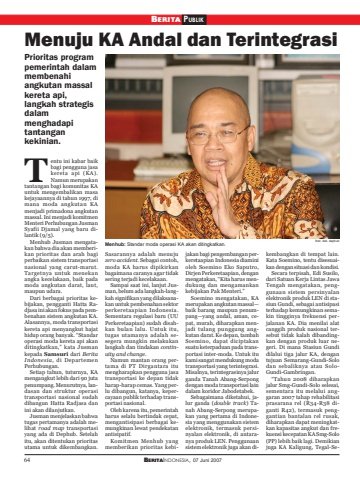 64 BERITAINDONESIA, 07 Juni 2007BERITA PUBLIKMenuju KA Andal dan TerintegrasiPrioritas programpemerintah dalammembenahiangkutan massalkereta api,langkah strategisdalammenghadapitantangankekinian.entu ini kabar baikbagi pengguna jasakereta api (KA).Namun merupakantantangan bagi komunitas KAuntuk mengembalikan masakejayaannya di tahun 1997, dimana moda angkutan KAmenjadi primadona angkutanmassal. Ini menjadi komitmenMenteri Perhubungan JusmanSyafii Djamal yang baru dilantik (9/5).Menhub Jusman mengatakan bahwa dia akan memberikan prioritas dan arah bagiperbaikan sistem transportasinasional yang carut-marut.Targetnya untuk menekanangka kecelakaan, baik padamoda angkutan darat, laut,maupun udara.Dari berbagai prioritas kebijakan, pengganti Hatta Radjasa ini akan fokus pada pembenahan sistem angkutan KA.Alasannya, moda transportasikereta api menyangkut hajathidup orang banyak. “Standaroperasi moda kereta api akanditingkatkan,” kata Jusmankepada Samsuri dari BeritaIndonesia, di DepartemenPerhubungan.Setiap tahun, tuturnya, KAmengangkut lebih dari 90 jutapenumpang. Menurutnya, landasan dan struktur operasitransportasi nasional sudahdibangun Hatta Radjasa danini akan dilanjutkan.Jusman menjelaskan bahwatugas pertamanya adalah melihat road map transportasiyang ada di Dephub. Setelahitu, akan ditentukan prioritasutama untuk dikembangkan.Sasarannya adalah menujuzero accident. Sebagai contoh,moda KA harus dipikirkanbagaimana caranya agar tidaksering terjadi kecelakaan.Sampai saat ini, lanjut Jusman, belum ada langkah-langkah signifikan yang dilaksanakan untuk pembenahan sektorperkeretaapian Indonesia.Sementara regulasi baru (UUPerkeretaapian) sudah disahkan bulan lalu. Untuk itu,tugas utamanya adalah sesegera mungkin melakukanlangkah dan tindakan continuity and change.Namun mantan orang pertama di PT Dirgantara itumengharapkan pengguna jasatransportasi ke depan tidakharap-harap cemas. Yang perlu dibangun, katanya, kepercayaan publik terhadap transportasi nasional.Oleh karena itu, pemerintahharus selalu bertindak cepat,mengantisipasi berbagai kemungkinan lewat pendekatanantisipatif.Komitmen Menhub yangmemberikan prioritas kebijakan bagi pengembangan perkeretaapian Indonesia diaminioleh Soemino Eko Saputro,Dirjen Perkeretaapian, denganmengatakan, “Kita harus mendukung dan mengamankankebijakan Pak Menteri.”Soemino mengatakan, KAmerupakan angkutan massal—baik barang maupun penumpang—yang andal, aman, cepat, murah, diharapkan menjadi tulang punggung angkutan darat. Ke depan, tambahSoemino, dapat diciptakansuatu keterpaduan pada transportasi inter-moda. Untuk itukami sangat mendukung modatransportasi yang terintegrasi.Misalnya, terintegrasinya jalurganda Tanah Abang-Serpongdengan moda transportasi laindalam koridor Jabodetabek.Sebagaimana diketahui, jalur ganda (double track) Tanah Abang-Serpong merupakan yang pertama di Indonesia yang menggunakan sistemelektronik, termasuk persinyalan elektronik, di antaranya produk LEN. Penggunaansistem elektronik juga akan dikembangkan di tempat lain.Kata Soemino, tentu disesuaikan dengan situasi dan kondisi.Secara terpisah, Edi Susilo,dari Satuan Kerja Lintas JawaTengah mengatakan, penggunaan sistem persinyalanelektronik produk LEN di stasiun Gundi, sebagai antisipasiterhadap kemungkinan semakin tingginya frekuensi perjalanan KA. Dia menilai alatcanggih produk nasional tersebut tidak kalah dibandingkan dengan produk luar negeri. Di mana Stasiun Gundidilalui tiga jalur KA, dengantujuan Semarang-Gundi-Solodan sebaliknya atau SoloGundi-Gambringan.“Tahun 2008 diharapkanjalur Smg-Gundi-Solo selesai,sementara itu melalui anggaran 2007 tahap rehabilitasiprasarana rel (R34-R38 diganti R42), termasuk penggantian bantalan rel rusak,diharapkan dapat meningkatkan kapasitas angkut dan frekuensi kecepatan KA Smg-Solo(PP) lebih baik lagi. Demikianjuga KA Kaligung, Tegal-SeTMenhub: Standar moda operasi KA akan ditingkatkan. foto: dok. dephub