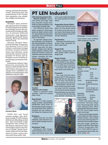 BERITAINDONESIA, 07 Juni 2007 65BERITA PUBLIKPT LEN IndustriLEN Interlocking System (SIL)Memiliki kelebihan: kemampuan operasi yang tinggi, hargayang kompetitif, sangat aman,sistemnya dapat ditingkatkan, bisacocok dengan peralatan lokal.LEN Interlocking System atausistem pengaturan (sambungan)kereta api adalah sebuah produkPLC yang didasarkan pada sistempengaturan yang dikembangkanoleh PT LEN Industri.SIL digunakan sebagai pemroses sambungan untuk mengendalikan operasi peralatan di ruang terbuka, seperti lampu sinyal, sirkuitjalur dan ruang mesin. SIL dikembangkan sebagai solusi alternatifsistem pengaturan lalulintas untukkereta api Indonesia. Operasi SILditekankan pada pentingnya keselamatan, keandalan dan ketersediaan, juga pemeliharaan.rumit. Luwes di dalam penempatandan fungsi operasional di stasiunstasiun.Pengendalian Secara Elektris:Didukung oleh semua jenis peralatan luar ruang dengan operasiNX (enterance-exit atau pintu keluar-masuk). Sama dengan standarPemroses Pengaturan sinyal (VPI,SSI atau Westtrace).Penyelamatan:Dirancang untuk standar penyelamatan tinggi, dilengkapi peralatan sistem sinyal.Sangat Andal:Dengan menggunakan peralatan standar industri, sistem inisangat andal.Sangat Tersedia:Sistem pengaturan LEN telahterbukti bekerja 24 jam selama 7hari seminggu selama beberapa tahun di sebuah stasiun tanpa henti.Unit sinyal LED untuk penerapan lampu sinyal kereta apiPengenalan:Unit sinyal LEN-LED dikembangkan oleh PT LEN Industri sebagai alternatif baru bagi permintaan unit lampu sinyal kereta apiuntuk penerapan sinyal kereta api.Dikembangkan dengan kombinasi standar sinyal dan industri,unit sinyal LEN-LED dirancanguntuk memenuhi standar kereta apibagi keselamatan dan keandalan.Unit sinyal LEN-LED bisa dipasang semudah memasang unitsinyal filament tanpa modifikasisistem pengaturan yang ada.marang, berlanjut KA Pandanwangi, Semarang-Solo danmenyambung ke KA Pramek,Solo-Jogjakarta, dan sebaliknya sebagai satu kesatuan.KeandalanMerespon upaya pemerintah untuk memacu keandalan,PT LEN Industri terus melakukan berbagai inovasi dan memodernisasi berbagai produknya, di antaranya elektronikpersinyalan yang digunakanoleh jalur ganda Tanah AbangSerpong, Slawi dan menyusulstasiun Gundi.Menurut Abraham Mose,General Manager Transportation Business Unit PT LENIndustri, modernisasi berbagaiperalatan menjadi perhatianutama. Kata Abraham, sistempersinyalan manual yang digunakan PT Kereta Api diharapkan secara bertahap diganti dengan persinyalan elektronik.Kemampuan industri lokal,khususnya persinyalan KAkatanya sudah dimiliki oleh PTLEN Industri. Kemampuan inisebagai hasil modifikasi danrekayasa rancang bangun yangdilakukan industri lokal.Tampilan:Sederhana dan kompak:Desain ini memenuhi utamaperalatan, efektif dan kompakdalam ukuran.Biaya Rendah:Sistem ini di dalam pengembangan, perakitan, operasional danpemeliharaan, bianya murah. SILdikembangkan dengan menggunakan bahan-bahan lokal, karena itukomponen dan suku cadang mudah didapat dan harganya murah.Serbaguna:Desain teknik dan non-teknikdidasarkan pada kebutuhan operasional dalam berbagai kondisi diIndonesia.Kemampuan Tinggi:Kemampuan untuk mengendalikan berbagai kondisi, mulai daristasiun kecil sampai stasiun yangSpesifikasi elektris:Voltase : 85-132 vacKekuatan nominal :Merah : 10 WKuning : 10 WHijau : 10 WSuhu : -40oC – 85oCLampu : sensor internal saluran gandaLampu pijar : saluran internal tunggalKelenturan : cocok dengan semua sistem interlock(sambungan)Keandalan :Modul LED : 30 tahunModul Elektria : 20 tahunIndeks proteksi : IP54Andal untuk sinyal lampu dipermukaan. Berfungsi sangatlama. Hemat tenaga listrik. Hematbiaya sepanjang masa. Warnasesuai dengan kebutuhan standar:BS-1376. cocok dengan semuasistem sambungan.Modernisasi berbagai peralatansecara elektronik sudah masanyamenjadi perhatian, karena sistemmanual yang masih digunakan PTKereta Api secara bertahap digantiyang lebih canggih, semisal persinyalan double track Tanah Abang–Serpong menggunakan elektronik. Sinyal elektronik juga segera dipasang di stasiun Slawi, danGundi, Jateng. RIPemasangan: Persinyalan elektronik.Abraham MoseDitilik dari segi hargamaupun kualitas, kata Abraham, produk PT LEN Industrilebih murah dibanding produkluar. Dari sisi kualitas sangatkompetitif, suku cadang mudah didapat, tidak harus inden(menunggu) seperti yang selama ini terjadi. Sistem persinyalan elektronik ini bisa digunakan di lintas utama/raya,atau pada lintas padat. RI