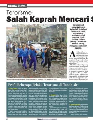 20 BERITAINDONESIA, 19 Juli 2007BERITA UTAMATerorismeSalah Kaprah Mencari SMakna jihadsesungguhnyabukanlah tindakanterorisme yangmenyerangpenduduk sipilpadahal tidakterlibat dalamperang. Terorismesendiri seringmengatasnamakanagama.rti kata jihad sering disalahpahami oleh yang tidakmengenal prinsipprinsip Din Islam sebagai ‘perang suci’ (holy war); istilahuntuk perang adalah qittal,bukan jihad.Jihad dalam bentuk perangdilaksanakan jika terjadi fitnahyang membahayakan eksistensi ummat (antara lain berupa serangan-serangan dariluar). Jihad tidak bisa dilaksanakan kepada orang-orangyang tunduk kepada aturanAllah atau mengadakan perjanjian damai maupun keProfil Beberapa Pelaku Terorisme di Tanah Air:fl Abu Dujana (nama asli: AinulBahri; alias Mahmudi Yusron, Mahfud, Yusron, Pak Guru, Mas Ud,Thorim, Sobirin dan Dedi; lahir diCianjur, Jawa Barat pada 20 Agustus1969), adalah seorang tersangkateroris asal Indonesia. Oleh Polri iadisebut sebagai ahli merakit bomdan terlibat dalam Bom Bali 2002,Bom JW Marriott 2003, dan BomKuningan. Selain itu, Polri jugameyakini Dujana telah membantumengatur pelarian Noordin M. Topdan Azahari Husin.Terlahir dengan nama Ainul Bahripada tahun 1969 dan besar diCianjur. Pada tahun 1980 ia bergantinama menjadi Abu Dujana dan pergibelajar di Pakistan. Pada tahun 1989ia kemudian mengikuti pelatihanmiliter di Afganistan bersama dengan para mujahidin yang sedangmemerangi Soviet. Di sana Dujanamemperoleh keterampilan menggunakan senjata, merakit bom, taktikperang, dan pernah bertemu Osamabin Laden. Dua tahun kemudian iamenjadi guru di pesantren LukmanulHakim, Johor, Malaysia. Di sanapulalah ia mulai menjalin hubungandengan Noordin M. Top dan Mukhlas. Oktober 2002 Dujana diangkatmenjadi Sekretaris MarkaziyahJemaah Islamiyah. Pada awal 2007Dujana menjadi buronan teratasdalam daftar buronan yang palingdicari Polri.fl Zarkasih (alias: Nuaim, Mbah,Abu Irsyad, Zahroni, Roni, Zainudin;lahir di Pekalongan pada 28 Desember 1962) adalah amir (pemimpin) darurat Jemaah Islamiyah (JI)sejak tahun 2004, menggantikanAbu Rusdan yang ditangkap kepolisian.Zarkasih mengaku pernah mengikuti akademi militer di Sadah, Pakistan, pada tahun 1987 dan mengajardi kamp Hudaibiyah Moro, Filipina.Ia ditangkap di Yogyakarta pada 9Juni 2007, beberapa jam setelahtokoh penting JI lainnya, Abu Dujanadibekuk di desa Kebarongan, JawaTengah. Penangkapannya sendiritidak diumumkan hingga 15 Juni2007, di mana video pengakuannya bersama dengan Abu Dujana diputar di hadapan mediamassa.fl Imam Samudera yang bernamaasli Abdul Aziz (lahir di Desa LopangCede, Serang, Banten tanggal 14Januari 1970) adalah seorang terorisyang terlibat dalam peristiwa bomBali tahun 2002.Tahun 1990 Aziz pergi ke MalayASejumlah relawan mengevakuasi korban Bom Bali I di Sari Night Club, Kuta tahun 2002. foto: abc.net.au
