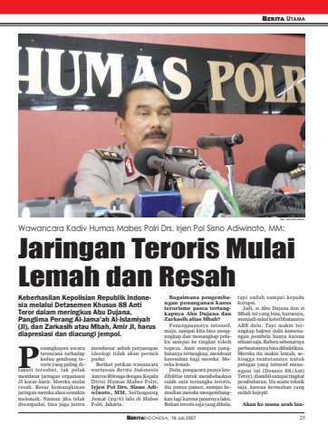 BERITAINDONESIA, 19 Juli 2007 23Wawancara Kadiv Humas Mabes Polri Drs. Irjen Pol Sisno Adiwinoto, MM:Jaringan Teroris MulaiLemah dan ResahKeberhasilan Kepolisian Republik Indonesia melalui Detasemen Khusus 88 AntiTeror dalam meringkus Abu Dujana,Panglima Perang Al-Jama’ah Al-Islamiyah(JI), dan Zarkasih atau Mbah, Amir JI, harusdiapresiasi dan diacungi jempol.enangkapan secaraterencana terhadapkedua gembong teroris yang paling ditakuti tersebut, tak pelakmembuat jaringan organisasiJI kocar-kacir. Mereka mulairesah. Besar kemungkinanjaringan mereka akan semakinmelemah. Namun jika tidakdiwaspadai, bisa juga justrumembesar sebab perjuanganideologi tidak akan pernahpudar.Berikut petikan wawancarawartawan Berita IndonesiaAmron Ritonga dengan KepalaDivisi Humas Mabes Polri,Irjen Pol Drs. Sisno Adiwinoto, MM, berlangsungJumat (29/6) lalu di MabesPolri, Jakarta.Bagaimana pengembangan penanganan kasusterorisme pasca tertangkapnya Abu Dujana danZarkasih alias Mbah?Penanganannya intensif,maju, sampai kita bisa mengungkap dan menangkap pelaku sampai ke tingkat tokohtopnya. Amir maupun panglimanya tertangkap, membuatkeresahan bagi mereka. Mereka lemah.Dulu, pengacara punya kredibilitas untuk membebaskansalah satu tersangka teroris,dia punya pamor, sampai kemudian mereka mengembangkan lagi karena pasarnya laku.Bukan teroris saja yang dibela,tapi sudah sampai kepadakorupsi.Jadi, si Abu Dujana dan siMbah ini yang bisa, harusnya,menjadi saksi keterlibatannyaABB dulu. Tapi makin terungkap bahwa dulu kemenangan pembela hanya karenasituasi saja. Bahwa sebenarnyaperbuatannya bisa dibuktikan.Mereka itu makin lemah, sehingga tuntutannya untukpetugas yang intensif menangani ini (Densus 88/AntiTeror), diambil sampai tingkatpembubaran. Itu suatu tekniksaja, karena keresahan yangsudah kejepit.Akan ke mana arah lanPfoto: berindo wilsonBERITA UTAMA