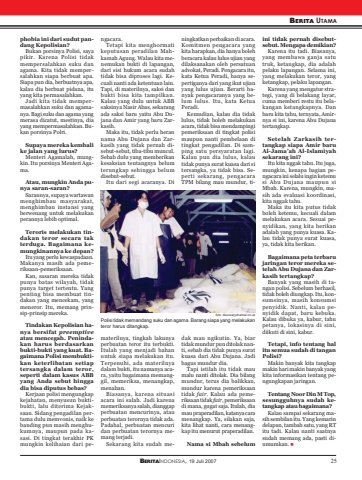 BERITAINDONESIA, 19 Juli 2007 25BERITA UTAMAphobia ini dari sudut pandang Kepolisian?Bukan porsinya Polisi, sayapikir. Karena Polisi tidakmempersalahkan suku danagama. Kita tidak mempersalahkan siapa berbuat apa.Siapa pun dia, berbuatnya apa,kalau dia berbuat pidana, ituyang kita permasalahkan.Jadi kita tidak mempermasalahkan suku dan agamanya. Bagi suku dan agama yangmerasa dicatut, mestinya, diayang mempermasalahkan. Bukan porsinya Polri.Supaya mereka kembalike jalan yang lurus?Menteri Agamalah, mungkin. Itu porsinya Menteri Agama.Atau, mungkin Anda punya saran-saran?Sarannya, supaya wartawanmenghimbau masyarakat,menghimbau instansi yangberwenang untuk melakukanperannya lebih optimal.Teroris melakukan tindakan teror secara takterduga. Bagaimana kemungkinannya ke depan?Itu yang perlu kewaspadaan.Makanya masih ada pemeriksaan-pemeriksaan.Kan, sasaran mereka tidakpunya batas wilayah, tidakpunya target tertentu. Yangpenting bisa membuat tindakan yang mencekam, yangmeneror. Itu, memang prinsip-prinsip mereka.Tindakan Kepolisian hanya bersifat preemptiveatau mencegah. Penindakan harus berdasarkanbukti-bukti yang kuat. Bagaimana Polisi membuktikan keterlibatan setiaptersangka dalam teror,seperti dalam kasus ABByang Anda sebut hinggadia bisa diputus bebas?Kerjaan polisi mengungkapkejahatan, menyusun buktibukti, lalu diterima Kejaksaan. Sidang pengadilan pertama dulu memvonis, naik kebanding pun masih menghukumnya, maupun pada kasasi. Di tingkat terakhir PKmungkin kelihaian dari pengacara.Tetapi kita menghormatikeputusan peradilan Mahkamah Agung. Walau kita menemukan bukti di lapangan,dari sisi hukum acara sudahtidak bisa diproses lagi. Kecuali nanti ada ketentuan lain.Tapi, di materilnya, saksi danbukti bisa kita tampilkan.Kalau yang dulu untuk ABBsaksinya Nasir Abas, sekarangada saksi baru yaitu Abu Dujana dan Amir yang baru Zarkasih.Maka itu, tidak perlu herannama Abu Dujana dan Zarkasih yang tidak pernah disebut-sebut, tiba-tibu muncul.Sebab dulu yang memberikankesaksian tentangnya belumterungkap sehingga belumdisebut-sebut.Itu dari segi acaranya. Diningkatkan perbaikan di acara.Komitmen pengacara yangkita harapkan, dia hanya bolehberacara kalau lulus ujian yangdilaksanakan oleh persatuanadvokat, Peradi. Pengacara itu,kata Ketua Peradi, hanya sepertiganya dari yang ikut ujianyang lulus ujian. Berarti banyak pengacaranya yang belum lulus. Itu, kata KetuaPeradi.Kemudian, kalau dia tidaklulus, tidak boleh melakukanacara, tidak bisa mendampingipemeriksaan di tingkat polisimaupun nanti pembelaan ditingkat pengadilan. Di samping satu persyaratan lagi.Kalau pun dia lulus, kalautidak punya surat kuasa dari sitersangka, ya tidak bisa. Seperti sekarang, pengacaraTPM bilang mau mundur, tiini tidak pernah disebutsebut. Mengapa demikian?Karena itu tadi. Biasanya,yang membawa ganja satutruk, ketangkap, dia adalahpelaku lapangan. Selama ini,yang melakukan teror, yangketangkap, pelaku lapangan.Karena yang mengatur strategi, yang di belakang layar,cuma memberi restu itu belakangan ketangkapnya. Danbaru kita tahu, ternyata, Amirnya si ini, karena Abu Dujanatertangkap.Setelah Zarkasih tertangkap siapa Amir baruAl-Jama’ah Al-Islamiyahsekarang ini?Itu kita nggak tahu. Itu juga,mungkin, kenapa bagian pengacara ini selalu ingin ketemusi Abu Dujana maupun siMbah. Karena, mungkin, masih ada evaluasi koordinasi,kita nggak tahu.Maka itu kita putus tidakboleh ketemu, kecuali dalammelakukan acara. Sesuai penyidikan, yang kita berikanadalah yang punya kuasa. Kalau tidak punya surat kuasa,ya, tidak kita berikan.Bagaimana peta terbarujaringan teror mereka setelah Abu Dujana dan Zarkasih tertangkap?Banyak yang masih di tangan polisi. Sebelum berhasil,tidak boleh diungkap. Itu, konsumsinya, masih konsumsipenyidik. Nanti, kalau penyidik dapat, baru kebuka.Kalau dibuka ya, kabur, tahupetanya, lokasinya di sini,diikuti di sini, kabur.Tetapi, info tentang halitu semua sudah di tanganPolisi?Makin banyak kita tangkapmakin hari makin banyak yangkita informasikan tentang pengungkapan jaringan.Tentang Noor Din M Top,sesungguhnya sudah ketangkap atau bagaimana?Kalau sampai sekarang masih sembilan itu. Yang kemarindelapan, tambah satu, yang RTitu tadi. Kalau nanti saatnyasudah memang ada, pasti diumumkan. materilnya, tingkah lakunyaperbuatan teror itu terbukti.Itulah yang menjadi bahanuntuk siapa melakukan itu.Terpenuhi, ada materilnyadalam bukti, itu namanya acara, yaitu bagaimana memanggil, memeriksa, menangkap,menahan.Biasanya, karena situasiacara ini salah. Jadi karenamemeriksanya salah, dianggapperbuatan mencurinya, atauperbuatan terornya tidak ada.Padahal, perbuatan mencuridan perbuatan terornya memang terjadi.Sekarang kita sudah medak mau ngikutin. Ya, biartidak mundur pun ditolak nanti, sebab dia tidak punya suratkuasa dari Abu Dujana. Jadibagus mundur dia.Tapi istilah itu tidak maumalu nanti ditolak. Dia bilangmundur, terus dia balikkan,mundur karena pemeriksaantidak fair. Kalau ada pemeriksaan tidak fair, pemeriksaandi mana, gugat saja. Itulah, diamau praperadilan, katanya caramenangkap. Ya, silakan saja,kita lihat nanti, cara menangkap itu menurut praperadilan.Nama si Mbah sebelumPolisi tidak memandang suku dan agama. Barang siapa yang melakukanteror harus ditangkap.foto: discoverychannel.co.uk