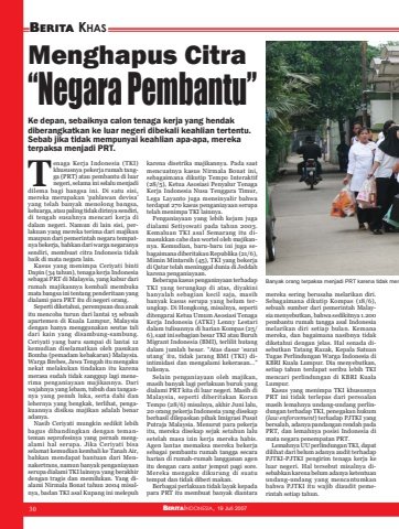 30 BERITAINDONESIA, 10 Agustus 2006BERITA KHAS30 BERITAINDONESIA, 19 Juli 2007Menghapus Citra“Negara Pembantu”Ke depan, sebaiknya calon tenaga kerja yang hendakdiberangkatkan ke luar negeri dibekali keahlian tertentu.Sebab jika tidak mempunyai keahlian apa-apa, merekaterpaksa menjadi PRT.enaga Kerja Indonesia (TKI)khususnya pekerja rumah tangga (PRT) atau pembantu di luarnegeri, selama ini selalu menjadidilema bagi bangsa ini. Di satu sisi,mereka merupakan ‘pahlawan devisa’yang telah banyak menolong bangsa,keluarga, atau paling tidak dirinya sendiri,di tengah susahnya mencari kerja didalam negeri. Namun di lain sisi, perlakuan yang mereka terima dari majikanmaupun dari pemerintah negara tempatnya bekerja, bahkan dari warga negaranyasendiri, membuat citra Indonesia tidakbaik di mata negara lain.Kasus yang menimpa Ceriyati bintiDapin (34 tahun), tenaga kerja Indonesiasebagai PRT di Malaysia, yang kabur darirumah majikannya kembali membukamata bangsa ini tentang penderitaan yangdialami para PRT itu di negeri orang.Seperti diketahui, perempuan dua anakitu mencoba turun dari lantai 15 sebuahapartemen di Kuala Lumpur, Malaysiadengan hanya menggunakan seutas talidari kain yang disambung-sambung.Ceriyati yang baru sampai di lantai 12kemudian diselamatkan oleh pasukanBomba (pemadam kebakaran) Malaysia.Warga Brebes, Jawa Tengah itu mengakunekat melakukan tindakan itu karenamerasa sudah tidak sanggup lagi menerima penganiayaan majikannya. Dariwajahnya yang lebam, tubuh dan tangannya yang penuh luka, serta dahi danlehernya yang bengkak, terlihat, pengakuannya disiksa majikan adalah benaradanya.Nasib Ceriyati mungkin sedikit lebihbagus dibandingkan dengan temanteman seprofesinya yang pernah mengalami hal serupa. Jika Ceriyati bisaselamat kemudian kembali ke Tanah Air,bahkan mendapat bantuan dari Mennakertrans, namun banyak penganiayaanserupa dialami TKI lainnya yang berakhirdengan tragis dan memilukan. Yang dialami Nirmala Bonat tahun 2004 misalnya, badan TKI asal Kupang ini melepuhkarena disetrika majikannya. Pada saatmencuatnya kasus Nirmala Bonat ini,sebagaimana dikutip Tempo Interaktif(28/5), Ketua Asosiasi Penyalur TenagaKerja Indonesia Nusa Tenggara Timur,Lega Layanto juga mensinyalir bahwaterdapat 270 kasus penganiayaan serupatelah menimpa TKI lainnya.Penganiayaan yang lebih kejam jugadialami Setiyowati pada tahun 2003.Kemaluan TKI asal Semarang itu dimasukkan cabe dan wortel oleh majikannya. Kemudian, baru-baru ini juga sebagaimana diberitakan Republika (21/6),Mimin Mintarsih (45), TKI yang bekerjadi Qatar telah meninggal dunia di Jeddahkarena penganiayaan.Beberapa kasus penganinyaan terhadapTKI yang terungkap di atas, diyakinihanyalah sebagian kecil saja, masihbanyak kasus serupa yang belum terungkap. Di Hongkong, misalnya, sepertiditengarai Ketua Umum Asosiasi TenagaKerja Indonesia (ATKI) Lenny Lestaridalam tulisannya di harian Kompas (25/6), saat ini sebagian besar TKI atau BuruhMigrant Indonesia (BMI), terlilit hutangdalam jumlah besar. “Atas dasar ‘suratutang’ itu, tidak jarang BMI (TKI) diintimidasi dan mengalami kekerasan…”tulisnya.Selain penganiayaan oleh majikan,masih banyak lagi perlakuan buruk yangdialami PRT kita di luar negeri. Masih diMalaysia, seperti diberitakan KoranTempo (28/6) misalnya, akhir Juni lalu,20 orang pekerja Indonesia yang disekapberhasil dilepaskan pihak Imigrasi PusatPutraja Malaysia. Menurut para pekerjaitu, mereka disekap sejak setahun lalusetelah masa izin kerja mereka habis.Agen lantas memaksa mereka bekerjasebagai pembantu rumah tangga secaraharian di rumah-rumah langganan agenitu dengan cara antar jemput pagi sore.Mereka mengaku dikurung di suatutempat dan tidak diberi makan.Berbagai perlakuan tidak layak kepadapara PRT itu membuat banyak diantaramereka sering berusaha melarikan diri.Sebagaimana dikutip Kompas (18/6),sebuah sumber dari pemerintah Malaysia menyebutkan, bahwa sedikitnya 1.200pembantu rumah tangga asal Indonesiamelarikan diri setiap bulan. Kemanamereka, dan bagaimana nasibnya tidakdiketahui dengan jelas. Hal senada disebutkan Tatang Razak, Kepala SatuanTugas Perlindungan Warga Indonesia diKBRI Kuala Lumpur. Dia menyebutkan,setiap tahun terdapat seribu lebih TKImencari perlindungan di KBRI KualaLumpur.Kasus yang menimpa TKI khususnyaPRT ini tidak terlepas dari persoalanmasih lemahnya undang-undang perlindungan terhadap TKI, penegakan hukum(law enforcement) terhadap PJTKI yangbersalah, adanya pandangan rendah padaPRT, dan lemahnya posisi Indonesia dimata negara penempatan PRT.Lemahnya UU perlindungan TKI, dapatdilihat dari belum adanya audit terhadapPJTKI-PJTKI pengirim tenaga kerja keluar negeri. Hal tersebut misalnya disebabkan karena belum adanya ketentuanundang-undang yang mencantumkanbahwa PJTKI itu wajib diaudit pemerintah setiap tahun.TBanyak orang terpaksa menjadi PRT karena tidak mem