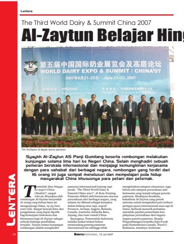 34 BERITAINDONESIA, 19 Juli 2007 L ENTERA34LenteraThe Third World Dairy & Summit China 2007Al-Zaytun Belajar HingSyaykh Al-Zaytun AS Panji Gumilang beserta rombongan melakukankunjungan selama lima hari ke Negeri China. Selain menghadiri sebuahpemeran berskala internasional dan menjajagi kemungkinan kerjasamadengan para sahabat dari berbagai negara, rombongan yang terdiri dari16 orang ini juga sempat menelusuri dan mempelajari pola hidupmasyarakat China khususnya para petani dan peternak.Tim Al-Zaytun di depan arena pameran foto-foto: dok. al-zaytunT untutlah ilmu hinggake negeri China(Hadist)”, sangatrelevan dirasakan olehrombongan Al-Zaytun berjumlah16 orang yang belum lama inimengunjungi China, 19-23 Juni2007 lalu. Sangat banyak ilmu danpengalaman yang dapat dipetikbagi kemajuan Indonesia dankhususnya bagi Al-Zaytun sebagaisebuah lembaga pendidikanterpadu. Tujuan utama kunjunganrombongan adalah menghadirimengirimkan satupun utusannya, jugabelum ada satupun perusahaan asalIndonesia yang tampil sebagai pesertapameran. Meskipun demikian,kehadiran Al-Zaytun yang penuhantusias untuk mengetahui peta terbarujaringan pasar internasional susu sapi didunia, berhasil menarik perhatiansejumlah pejabat pemerintah danpimpinan perusahaan dari negaranegara peserta pameran. KepalaPengembangan Genetika Sapi Perahpada Kementerian Canada, Ward GRobinson, misalnya, berkenanpameran internasional tentang sapiperah, “The Third World Dairy &Summit China 2007”, di Kota Nanjing.Pameran diikuti oleh bermacam-macamperusahaan dari berbagai negara, yangselama ini dikenal sebagai kampiundalam bidang susu sapi, sepertiPerancis, Jerman, Inggris, Belanda,Canada, Australia, Selandia Baru,Jepang, dan tuan rumah China.Sayangnya, Pemerintah Indonesiamelalui badan terkait belummemandang penting pameraninternasional ini sehingga tidak