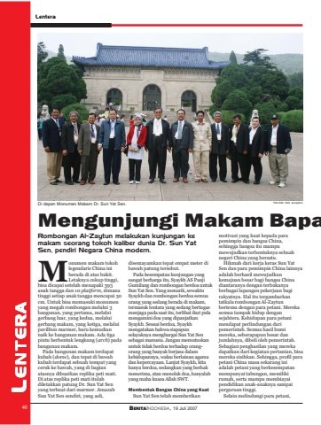 40 BERITAINDONESIA, 19 Juli 2007LenteraL ENTERA40Mengunjungi Makam BapaRombongan Al-Zaytun melakukan kunjungan kemakam seorang tokoh kaliber dunia Dr. Sun YatSen, pendiri Negara China modern.Monumen makam tokohlegendaris China iniberada di atas bukit.Letaknya cukup tinggi,bisa dicapai setelah menapaki 393anak tangga dan 10 platform, dimanatinggi setiap anak tangga mencapai 30cm. Untuk bisa memasuki monumenyang megah rombongan melalui 3bangunan, yang pertama, melaluigerbang luar, yang kedua, melaluigerbang makam, yang ketiga, melaluipavillion marmer, baru kemudiannaik ke bangunan makam. Ada tigapintu berbentuk lengkung (arch) padabangunan makam.Pada bangunan makam terdapatkubah (dome), dan tepat di bawahkubah terdapat sebuah tempat yangceruk ke bawah, yang di bagianatasnya dibuatkan replika peti mati.Di atas replika peti mati itulahdiletakkan patung Dr. Sun Yat Senyang terbuat dari marmer. JenazahSun Yat Sen sendiri, yang asli,disemayamkan tepat empat meter dibawah patung tersebut.Pada kesempatan kunjungan yangsangat berharga itu, Syaykh AS PanjiGumilang dan rombongan berdoa untukSun Yat Sen. Yang menarik, sewaktuSyaykh dan rombongan berdoa semuaorang yang sedang berada di makam,termasuk tentara yang sedang bertugasmenjaga pada saat itu, terlihat ikut pulamengamini doa yang dipanjatkanSyaykh. Seusai berdoa, Syaykhmengatakan bahwa siapapunselayaknya menghargai Sun Yat Sensebagai manusia. Jangan memutuskanuntuk tidak berdoa terhadap orangorang yang banyak berjasa dalamkehidupannya, walau berlainan agamadan kepercayaan. Lanjut Syaykh, kitahanya berdoa, sedangkan yang berhakmenerima, atau menolak doa, hanyalahyang maha kuasa Allah SWT.Membentuk Bangsa China yang KuatSun Yat Sen telah memberikanmotivasi yang kuat kepada parapemimpin dan bangsa China,sehingga bangsa itu mampumewujudkan terbentuknya sebuahnegeri China yang bersatu.Hikmah dari kerja keras Sun YatSen dan para pemimpin China lainnyaadalah berhasil mewujudkankemajuan besar bagi bangsa Chinadiantaranya dengan terbukanyaberbagai lapangan pekerjaan bagirakyatnya. Hal itu tergambarkantatkala rombongan Al-Zaytunbertemu dengan para petani. Merekasemua tampak hidup dengansejahtera. Kehidupan para petanimendapat perlindungan daripemerintah. Semua hasil bumimereka, seberapapun besar danjumlahnya, dibeli oleh pemerintah.Sebagian penghasilan yang merekadapatkan dari kegiatan pertanian, bisamereka sisihkan. Sehingga, profil parapetani China masa sekarang iniadalah petani yang berkesempatanmempunyai tabungan, memilikirumah, serta mampu membiayaipendidikan anak-anaknya sampaiperguruan tinggi.Selain melindungi para petani,Di depan Monumen Makam Dr. Sun Yat Sen. foto-foto: dok. al-zaytun