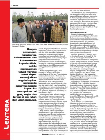 44 BERITAINDONESIA, 19 Juli 2007LenteraL ENTERA44Dengansemangat,kesabaran,kebersamaan danketawakalankepada Allah,selalumenguatkantekad merekauntuk dapatmewujudkansegala impian,yang padadasarnya segalaimpian itumerupakan halyang wajar danterpuji di sisi Allahdan umat manusia.Tahun Pengajaran Pendidikan Nasional.Permulaan tahun ajaran adalah bulanJuli dan tidak mengikuti kebiasaanpesantren, yang mengawali tahunpembelajarannya pada bulan Syawal.Pertimbangannya adalah, calon pelajaryang akan memasuki lembagapendidikan Al-Zaytun ini adalah paralulusan SD yang menggunakan kalenderpembelajaran pendidikan nasional,sehingga tidak menyulitkan semuapihak.Karenanya pada tanggal 1 Juliditetapkan sebagai awal tahunpembelajaran Al-Zaytun. Pembelajaranpertama dimulai pada 1 Juli 1999 M.Awal tahun pembukaan pembelajarandibuka oleh Menteri Pertanian Prof.Solahuddin. Santri tahun pertamaberjumlah 1.460 orang (624 santri nisadan 836 santri rijal), yang berasal dariseluruh provinsi Indonesia dan juga darinegeri jiran Malaysia. Tenaga pendidikdan mustami’ berjumlah 150 orang (35nisa dan 115 rijal).Ada suasana haru, bahagia, banggadan puas bagi segenap eksponen AlZaytun ketika awal pembelajaran itudimulai. Siklus tiga tahun persiapanyang telah dilalui dengan selamat, sejakproses pembangunan diawali, telahmenghantarkan pembukaan sebuahlembaga pendidikan kepesantrenanbergaya Indonesia sepenuhnya.Bagi mereka, tahun 1996 sampaidengan 1999, itu merupakan tahuntahun yang sarat dengan impian yangmereka ciptakan sendiri dan jugasesekali bertanya, apakah merekamampu mewujudkan impian itu?Namun semangat, kesabaran,kebersamaan dan ketawakalan kepadaAllah, selalu menguatkan tekad merekauntuk dapat mewujudkan segala impian,yang pada dasarnya segala impian itumerupakan hal yang wajar dan terpuji disisi Allah dan umat manusia.“Alhamdulillah tiga tahun persiapanitu, dengan izin Allah dan restu umatmanusia khususnya bangsa Indonesia,Al-Zaytun yang dilahirkan di bumiIndonesia, tepatnya di dusun Sandrem,Desa Mekarjaya, Kecamatan Haurgeulis,Kabupaten Indramayu, Provinsi JawaBarat, telah memulai pembelajarandengan selamat,” ujar Syaykh AS PanjiGumilang bersyukur.Diresmikan Presiden RIBangsa Indonesia menyambutgembira kelahiran Al-Zaytun. Terbuktidari antusias masyarakat dari seluruhprovinsi mempercayakan anak-anaknyadididik di pesantren Al-Zaytun ini.Kegembiraan bangsa Indonesia inidimanifestasikan pula oleh PresidenRepublik Indonesia Prof Dr BJ Habibie,dengan kehadirannya meresmikan PusatPendidikan dan Pengembangan BudayaToleransi dan Perdamaian ini.Hari itu, tepatnya 27 Agustus 1999,bertepatan dengan 16 Jumada al-Ula1420 H, kedatangan Presiden B.J.Habibie untuk meresmikan Kampus AlZaytun, cukup membuat suasana meriahbagi warga Haurgeulis dan sekitarnya.Maklum, bagi mereka saat itulah kalipertama lingkungan Haurgeulis (HG)dan sekitarnya kedatangan KepalaNegara, orang pertama di negeri ini. Takhanya warga dari HG, warga Sukra,Anjatan dan Kroya - tiga kecamatantetangga HG yang mengetahui peristiwaitu pun ikutan berbondong-bondonguntuk turut menyaksikan.Habibie dan rombongan, di antaranyaProf Malik Fajar (waktu itu MenteriAgama RI), datang dengan naik KeretaApi Argo Bromo dari Stasiun Gambir keStasiun HG. Sungguh sebuah peristiwayang tak bisa dilupakan. Dari StasiunHG, presiden dan rombonganmelanjutkan perjalanan menujukompleks Al-Zaytun dengan naik mobil.Warga setempat menyambutnya disepanjang jalan.Jalan menuju Al-Zaytun telahdibenahi sebelumnya sebagai bagianpersiapan kedatangan presiden itu.Persiapan itu tak hanya dilakukan olehcivitas Al-Zaytun tetapi juga oleh DinasBina Marga setempat. Poros jalan HGAl-Zaytun dipoles menjadi mulus,walaupun kemudian kemulusannyahanya bertahan beberapa bulan saja.Ketika konvoi Presiden BJ Habibiemulai memasuki kompleks Al-Zaytun,yang waktu itu belum sehijau sekarang,para karyawan pembangunan berbajukuning telah siap berbaris membentukpagar betis sepanjang rute yang dilaluikonvoi itu. Bahkan ketika ahli hitungergonomi pesawat terbang itu bersafariMendiknas Bambang Sudibyo dan Wakil Ketua MPR H Aksa Mahmud mengunjungiKampus Al-Zaytun.