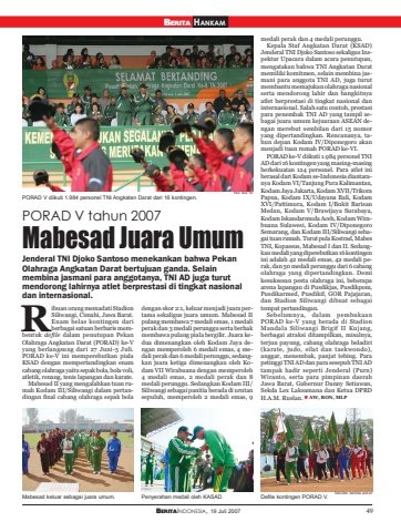 BERITAINDONESIA, 19 Juli 2007 49BERITA HANKAMPORAD V tahun 2007Mabesad Juara UmumJenderal TNI Djoko Santoso menekankan bahwa PekanOlahraga Angkatan Darat bertujuan ganda. Selainmembina jasmani para anggotanya, TNI AD juga turutmendorong lahirnya atlet berprestasi di tingkat nasionaldan internasional.ibuan orang memadati StadionSiliwangi, Cimahi, Jawa Barat.Enam belas kontingen dariberbagai satuan berbaris membentuk defile dalam penutupan PekanOlahraga Angkatan Darat (PORAD) ke-Vyang berlangsung dari 27 Juni-5 Juli.PORAD ke-V ini memperebutkan pialaKSAD dengan mempertandingkan enamcabang olahraga yaitu sepak bola, bola voli,atletik, renang, tenis lapangan dan karate.Mabesad II yang mengalahkan tuan rumah Kodam III/Siliwangi dalam pertandingan final cabang olahraga sepak boladengan skor 2:1, keluar menjadi juara pertama sekaligus juara umum. Mabesad IIpulang membawa 7 medali emas, 1 medaliperak dan 3 medali perunggu serta berhakmembawa pulang piala bergilir. Juara kedua dimenangkan oleh Kodam Jaya dengan memperoleh 6 medali emas, 4 medali perak dan 6 medali perunggu, sedangkan juara ketiga dimenangkan oleh Kodam VII Wirabuana dengan memperoleh4 medali emas, 2 medali perak dan 8medali perunggu. Sedangkan Kodam III/Siliwangi sebagai panitia berada di urutansepuluh, memperoleh 2 medali emas, 9medali perak dan 4 medali perunggu.Kepala Staf Angkatan Darat (KSAD)Jenderal TNI Djoko Santoso sekaligus Inspektur Upacara dalam acara penutupan,mengatakan bahwa TNI Angkatan Daratmemiliki komitmen, selain membina jasmani para anggota TNI AD, juga turutmembantu memajukan olahraga nasionalserta mendorong lahir dan bangkitnyaatlet berprestasi di tingkat nasional daninternasional. Salah satu contoh, prestasipara penembak TNI AD yang tampil sebagai juara umum kejuaraan ASEAN dengan merebut sembilan dari 15 nomoryang dipertandingkan. Rencananya, tahun depan Kodam IV/Diponegoro akanmenjadi tuan rumah PORAD ke-VI.PORAD ke-V diikuti 1.984 personel TNIAD dari 16 kontingen yang masing-masingberkekuatan 124 personel. Para atlet iniberasal dari Kodam se-Indonesia diantaranya Kodam VI/Tanjung Pura Kalimantan,Kodam Jaya Jakarta, Kodam XVII/TrikoraPapua, Kodam IX/Udayana Bali, KodamXVI/Pattimura, Kodam I/Bukit BarisanMedan, Kodam V/Brawijaya Surabaya,Kodam Iskandarmuda Aceh, Kodam Wirabuana Sulawesi, Kodam IV/DiponegoroSemarang, dan Kodam III/Siliwangi sebagai tuan rumah. Turut pula Kostrad, MabesTNI, Kopassus, Mabesad I dan II. Sedangkan medali yang diperebutkan 16 kontingenini adalah 42 medali emas, 42 medali perak, dan 50 medali perunggu dari 6 cabangolahraga yang dipertandingkan. Demikesuksesan pesta olahraga ini, beberapaarena lapangan di Pusdikjas, Pusdikpom,Pusdikarmed, Pusdikif, GOR Pajajaran,dan Stadion Siliwangi dibuat sebagaitempat pertandingan.Sebelumnya, dalam pembukaanPORAD ke-V yang berada di StadionMandala Siliwangi Brigif II Kujang,berbagai atraksi ditampilkan, misalnya,terjun payung, cabang olahraga beladiri(karate, judo, silat dan taekwondo),anggar, menembak, panjat tebing. Parapetinggi TNI AD dan para sesepuh TNI ADtampak hadir seperti Jenderal (Purn)Wiranto, serta para pimpinan daerahJawa Barat, Gubernur Danny Setiawan,Sekda Lex Laksamana dan Ketua DPRDH.A.M. Ruslan. AW, RON, MLPRPORAD V diikuti 1.984 personel TNI Angkatan Darat dari 16 kontingen.Mabesad keluar sebagai juara umum. Penyerahan medali oleh KASAD. Defile kontingen PORAD V. foto-foto: berindo amronfoto: dok. tni