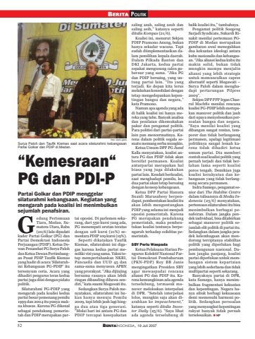 52 BERITAINDONESIA, 19 Juli 2007BERITA POLITIK“Kemesraan“PG dan PDI-PPartai Golkar dan PDIP menggelarsilaturahmi kebangsaan. Kegiatan yangmengarah pada koalisi ini menimbulkansejumlah penafsiran.edung PertemuanTiara, Medan, Sumatera Utara, Rabu(20/6) lalu dipadatikader Partai Golkar (PG) danPartai Demokrasi IndonesiaPerjuangan (PDIP). Ketua Dewan Penasehat PG Surya Palohdan Ketua Dewan Pertimbangan Pusat PDIP Taufik Kiemasyang hadir di acara ‘Silaturahmi Kebangsaan PG-PDIP’ itutersenyum ceria. Acara yangdihadiri pengurus teras keduapartai juga diisi dengan pidatopolitik.Silaturahmi PG-PDIP yangmengarah pada koalisi keduapartai besar pemenang pemilu1999 dan 2004 itu punya makna khusus. Karena PG dikenalsebagai pendukung pemerintah dan PDIP merupakan partai oposisi. Di parlemen sekarang, dari 550 kursi yang ada,PG menempati urutan teratasdengan 128 kursi (21%) sementara PDIP 109 kursi (19%).Seperti dikatakan TaufikKiemas, silaturahmi ini digagas karena kedua partai memiliki visi yang sama. Yakni tetap mempertahankan NKRI,Pancasila dan UUD 45 dansama-sama menyusun APBNyang prorakyat. “Jika dijinjingbersama rasanya akan lebihringan dibanding dibawa sendiri,” kata suami Megawati itu.Sedangkan Surya Paloh menyatakan, silaturahmi ini bukan hanya menuju Pemilu2009, tapi lebih jauh lagi hingga dua atau tiga generasi.“Mulai hari ini antara PG danPDIP tercapai kesepakatansaling asah, saling asuh dansaling asih,” katanya sepertiditulis Kompas (21/6).Koalisi ini, menurut SekjenPDIP Pramono Anung, bukanhanya sekadar wacana. Tapisudah diimplementasikan dalam pemilihan kepala daerah.Dalam Pilkada Banten danDKI Jakarta, kedua partaisepakat mengusung calon gubernur yang sama. “Jika PGdan PDIP bersaing, yang untung partai lain. “Itu yangterjadi. Ke depan kita terusmelakukan konsolidasi dengantetap mengedepankan kepentingan bangsa dan negara,”kata Pramono.Namun apa agenda yang adadi balik koalisi ini hanya mereka yang tahu. Banyak analisadan penilaian dikemukakanpakar dan pengamat politik.Para politisi dari partai-partailain pun mencermatinya. Karena dalam politik segala sesuatu memang serba mungkin.Ketua Umum DPP PG JusufKalla menyatakan, koalisi antara PG dan PDIP tidak akanbersifat permanen. Koalisiantarpartai merupakan halbiasa yang juga dilakukanpartai lain. Kendati berkoalisi,saat menghadapi pemilu, kedua partai akan tetap bersaingdengan konsep kebangsaan.Ketua DPP Partai HanuraSuaidi Marasabesy berpendapat, pembentukan koalisi ituakan lebih menguntungkanPDIP yang selama ini menjadioposisi pemerintah. KarenaPG merupakan pendukungpemerintah, maka pembentukan koalisi tentunya berpengaruh terhadap soliditas pemerintah.SBY Perlu WaspadaKetua Pelaksana Harian Pengurus Kolektif Nasional Partai Demokrasi Pembaharuan(PKN-PDP) Roy BB Janismengingatkan Presiden SBYagar mewaspadai rencanaaliansi PG dan PDIP itu. Karena kemungkinan ada agendaterselubung, termasuk manuver meloloskan interpelasidi DPR. “Setelah interpelasilolos, mungkin saja akan diarahkan ke impeachment,”katanya seperti ditulis Investor Daily (25/6). “Saya lihatada agenda terselubung dibalik koalisi itu,” tambahnya.Pengamat politik SoegengSarjadi Syndicate, Sukardi Rinakit menilai pertemuan PGPDIP di Medan merupakangambaran awal meneguhkandua kekuatan ideologi antarakubu nasionalis dan kebangsaan. “Jika aliansi kedua kubu itumakin solid, bukan tidakmungkin mampu menjalinaliansi yang lebih strategisuntuk memunculkan capresalternatif seperti Megawati –Surya Paloh dalam menghadapi pertarungan Pilpres2009”.Sekjen DPP PPP Irgan Chaerul Machfis menilai rencanakoalisi PG-PDIP lebih merupakan manuver politik dan jauhdari upaya menyelesaikan persoalan bangsa dan negara.“Saya menilai koalisi yangdibangun sangat rentan, temporer dan tidak berlangsungpermanen, apalagi legitimasipolitiknya sangat lemah karena tidak dihadiri ketuaumum partai. Dia membericontoh soal koalisi politik yangpernah terjadi dan tidak bertahan lama seperti koalisiporos tengah. Demikian jugakoalisi kerakyatan dan kebangsaan yang tidak berlangsung secara permanen.Indra Samego, pengamat senior dari The Habibie Centredalam tulisannya di Media Indonesia (25/6) menyatakan,pertemuan silaturahmi itu bisamenimbulkan berbagai penafsiran. Dalam jangka pendek individual, bisa ditafsirkansebagai manuver politik sejumlah elit politik di partai itu.Sedangkan dalam jangka pendek kelembagaan akan mendorong terciptanya stabiiltaspolitik yang diperlukan bagipembangunan nasional. Dalam jangka panjang, koalisipartai diperlukan untuk membangun sistem kepartaianyang lebih sederhana dan tidakmultipartai seperti sekarang.Banyaknya partai di DPR,kata Samego, hanya menimbulkan fragmentasi kekuatandan kepentingan. Negara hanya sibuk berbagi kekuasaandemi memenuhi harmoni politik. Sedangkan persoalanyang menyangkut kepentinganrakyat banyak tidak pernahterselesaikan. SPGSurya Paloh dan Taufik Kiemas saat acara silaturahmi kebangsaanPartai Golkar dan PDIP di Medan.foto: repro gatra