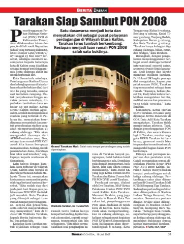 BERITAINDONESIA, 19 Juli 2007 53BERITA DAERAHTarakan Siap Sambut PON 2008Satu dasawarsa menjadi kota danmenyatakan diri sebagai pusat pelayananperdagangan di Wilayah Utara Kaltim,Tarakan terus tumbuh berkembang.Kesiapan menjadi tuan rumah PON 2008salah satu buktinya.rena di Tarakan banyak penginapan, hotel bahkan hotelberbintang pun ada. Demikianpula dengan transportasi, baikdarat, laut dan udara semuamendukung,” kata Jusuf SKyang juga Ketua Umum KONITarakan dan Ketua Umum SubPB PON XVII 2008 Tarakan.Pendapat serupa, diakuioleh Drs Ibrahim, MAP KetuaPelaksana Harian PON XVII2008 Kaltim Kota Tarakan.Menurut Ibrahim, yang jugaSekretaris Daerah Kota Tarakan ini, penyelenggaraanPON akan diadakan di tujuhkota di Kaltim. Kota Samarinda akan mempertandingkan 21 cabang olahraga, sekaligus sebagai pusat kegiatanPON XVII 2008. Sementara diKota Balikpapan akan dipertandingkan 8 cabang, KotaTenggarong (Kukar) 7 cabang,Bontang 5 cabang, Kutai Timur 5 cabang, Tanjung Redeb,Kabupaten Berau 3 cabang,dan Kota Tarakan 3 cabang.“Tarakan hanya kebagian tigacabang olahraga, biliar, catur,dan bridges,” kata Ibrahim.Barangkali, dengan pengalaman menyelenggarakan berbagai event olahraga bertarafinternasional seperti catur,womens circuit (tenis lapangan, Red) kempo dan karatemembuat Walikota Tarakan,Dr H Jusuf SK begitu percayadiri mengatakan, kapan punpelaksanaan PON, Tarakansiap menyambut sebagai tuanrumah. “Rasanya, beliau (Jusuf SK, Red) tidak terlalu berlebihan mengatakan hal itu,melihat sarana dan prasaranayang telah tersedia,” kataIbrahim.Sementara, Ketua HarianKONI Tarakan, H Gazali yangdijumpai Berita Indonesia diGOR Datu Adil Kota Tarakanmengatakan, Tarakan tidakmengirimkan atletnya. Tapi,dengan penyelenggaraan PONdi Kaltim, dan secara khususlagi di Tarakan, mantan anggota DPRD Tarakan ini berharap, generasi muda bisaterpacu dan termotivasi untukmengambil bagian dalam PONberikutnya.Ditanya soal persiapan keperluan dan peralatan atlet,Gazali mengatakan semua disediakan Panitia Besar (PB)PON XVII 2008 Kaltim. Tarakan hanya menyediakantempat pertandingan untukketiga cabang olahraga. Pertandingan catur akan ditempatkan di Grand Tarakan Mall(GTM) Simpang Tiga Tarakan.Sedangkan pertandingan biliarakan ditempatkan di StadionIndoor Telaga Keramat, Pamusian. Sementara pertandingan bridge akan dilangsungkan di Stadion IndoorSenyiur, Kampung Baru Tarakan. “Sebagai tuan rumah,saya berharap penyelenggaraan ketiga cabang olahraga ini,mendapat dukungan semualapisan masyarakat Tarakan,”pintanya. ASM, SLP, MLPenyelenggaraan Pekan Olahraga Nasional (PON) XVII diKalimantan Timur,akan dilaksanakan tahun depan, 6-18 Juli 2008. Kepastianjadwal yang tertuang dalam SKKONI Nomor 1460/UMM/V/07 tanggal 15 Mei 2007 tersebut, sekaligus memberi kesempatan kepada beberapakota di Kaltim yang dijadikansebagai tempat terselenggaranya pesta olahraga akbar iniuntuk berbenah diri.Kota Samarinda misalnya.Pembangunan Stadion Utamadan kelengkapannya di atas lahan seluas 80 hektare (ha) dari200 ha yang tersedia, sampaisaat ini belum rampung. Untuk penyelesaian hingga seratus persen misalnya, diperlukan tambahan dana sebesar Rp 118 miliar. KetuaDPRD Kaltim Herlan Agussalim, setelah meninjau lokasistadion yang terletak di Palaran itu, menyatakan kesediaannya menambah dana untuk penyelesaian stadion yangakan mempertandingkan 21cabang olahraga. “Kita akanmengambil dananya dariAPBD-Perubahan 2007. Dan,sebagai tuan rumah PON XVII2008 kita harus berupayamenyukseskan. Sedang, untukpenambahan dana, ibaratnyabiar tekor asal tersohor,” ungkapnya kepada wartawan diSamarinda.Lain halnya dengan Tarakan. Kota terbesar di WilayahUtara Kaltim atau berada didaerah perbatasan Sabah Malaysia Timur ini, menyatakankesiapannya menyambut pestaolahraga bertaraf nasional tersebut. “Kita sudah siap darijauh-jauh hari. Kapan pun pelaksanaan PON XVII itu tidakjadi masalah. Kota Tarakanyang ditunjuk sebagai tuanrumah tempat penyelenggaraan, sarana dan prasarana,serta seluruh masyarakatnyasiap menyambut,” kata dr HJusuf SK Walikota Tarakan,kepada Berita Indonesia, Rabu, dua pekan lalu.Kesiapan Kota Tarakan untuk dijadikan sebagai tuanrumah tentu bukan hanyatempat bertanding, tapi termasuk akomodasi, seperti penginapan, transportasi dan lainsebagainya. “Kita tidak permasalahkan soal penginapan kaPGrand Tarakan Mall: Salah satu tempat pertandingan yang sudahdipersiapkan.Walikota Tarakan, Dr H Jusuf SKfoto-foto: dok.humas pemkot tarakan