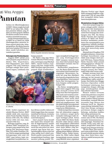 BERITAINDONESIA, 19 Juli 2007 63BERITA PEREMPUANati Wira AngginiPanutanbudaya ini dikembangkannyadi IKKT. Dalam rangka hari jadiIKKT ke-40 tahun lalu, diadakan pameran lukisan yang diikuti 120 isteri prajurit. BahkanIbu Ratna sendiri turut memamerkan sejumlah karyanya.Untuk memperingati hari jadi IKKT ke-41 tahun ini, tidakdiselenggarakan pameran lukisan seperti tahun lalu. Sebagai gantinya, Ibu Ratna besertapara isteri pejabat TNI lainnyaakan unjuk kebolehan memainkan gamelan.Dukungan dan PemberdayaanAnggota IKKT adalah paraisteri prajurit yang berdinas diMabes TNI, Departemen,Non-Departemen, para isterianggota TNI yang suaminyabertugas sebagai atase pertahanan negara, Lemhanas danluarga prajurit.Ibu Ratna yang juga KetuaUmum Dharma Pertiwi mengakui, tantangan yang dihadapiIKKT, seperti halnya organisasi yang lain, sangat berat.IKKT berupaya agar para isteriprajurit dapat memberdayangan mengikuti berbagai kursus yang diselenggarakanIKKT maupun instansi lainnya, isteri-isteri prajurit dapatmenambah wawasan dan keterampilannya.Berdasarkan pengalamannya, Ibu Ratna Djoko Suyantomerasakan betul manfaat berorganisasi. Menurutnya, banyak hal yang bisa dipelajaridan banyak pengetahuan baruyang dipetiknya. Isteri prajuritharus ikut berorganisasi, karena berguna untuk pengembangan diri.Ibu Ratna mengharapkan,isteri-isteri anggota TNI yangjuga menjadi wanita karirtetap/mau ikut berorganisasi.Jika suatu saat suaminya menduduki jabatan sebagai yangdituakan, isteri tentu akanmemimpin organisasi yanglebih luas jangkauannya. Jikadia tidak belajar berorganisasidari bawah, dia tidak tahu apayang harus dilakukannya.Untuk memperluas wawasandan tali silaturahmi anggotanya, tentunya sangat perlumenjalin hubungan baik dengan berbagai pihak. KetuaUmum IKKT Ibu Ratna DjokoSuyanto salah satunya antaralain mengadakan silaturahmirutin setiap tahun dengan paraisteri Atase Militer yang bertugas di Indonesia yang tergabung dalam Military Attaches(Milat) Ladies. Dalam kesempatan itu, Milat Ladies diajakmengunjungi yayasan-yayasanyang dikelola unsur organisasiDharma Pertiwi agar dapatlebih mengenal kegiatan organisasi isteri TNI ini yang telahikut mengabdi dalam membantu kesejahteraan.Menjalankan dengan IkhlasPara isteri prajurit juga berperan sebagai public relationbagi suami dan kesatuannya.Karena itu, mereka dituntutuntuk ikut menjaga dan membangun citra TNI. Ibu RatnaDjoko Suyanto dan segenapstafnya di IKKT tak hentihentinya melakukan pendekatan dan mengingatkan paraanggotanya tentang pentingnya menghindari perpecahanyang bisa mencoreng namabaik TNI.Menjadi isteri Panglima TNImengharuskannya menerimaberbagai konsekuensi yangtidak sama dengan isteri prajurit TNI biasa. Namun RatnaDjoko Suyanto tidak pernahmenganggapnya sebagai beban. Menurutnya, selamamenjalankan tugas organisasidengan senang dan ikhlas,maka tidak akan terasa sulit.Sebagai seorang isteri danibu, wanita yang hobi berolahraga ini tak pernah lupamenyisihkan waktu untuk keluarga. Hari Sabtu dan Minggubiasanya digunakan untukberkumpul sekeluarga danmengisinya dengan olahragapagi, mendengarkan musikatau sekadar bersantai.Momen makan bersamasuami dan puterinya yang kiniduduk di bangku semesterenam London School jurusankomunikasi, menjadi hiburantersendiri bagi dirinya dankeluarga kecil itu. Baginyayang penting bukanlah kuantitas atau berapa seringnyapertemuan dengan anggotakeluarga, melainkan kualitasdari setiap pertemuan itu.Meski menjadi isteri orangnomor satu di TNI, Ibu Ratnamengaku kenyamanannya tidak terganggu. Suaminya bukanlah orang yang suka memakai pengawalan ketat jikatengah pergi dengan keluarga.“Di luar dinas, kita sama seperti masyarakat biasa. Apalagi nanti setelah pensiun semuajuga akan biasa-biasa saja,”ujarnya sambil tersenyum manis. RHBAIS. Induk organisasi iniadalah Dharma Pertiwi. IKKTadalah salah satu unsurnya,selain Persit Kartika ChandraKirana (TNI AD), Pia ArdhyaGarini (TNI AU) dan Jalasenastri (TNI AL).Berbagai kegiatan yang dilakukan IKKT mendapat dukungan yang sangat besar darijajaran TNI, khususnya Panglima TNI selaku Pembina Utama. Hal itu sangat penting bagikelangsungan misi atau visiIKKT yang intinya ingin meningkatkan kesejahteraan kekan dirinya sendiri, dalam artitidak tinggal diam dan mampumembuat terobosan, terutamadalam hal peningkatan ekonomi keluarganya.Isteri prajurit harus kreatifdan harus bisa menjadi teladan di lingkungannya sendirimaupun di masyarakat. Menurut ibu satu puteri ini, isteriprajurit juga harus bisa mengembangkan dirinya dari halyang paling kecil sekali pun.Harus pandai menyiasati danmengantisipasi keadaan, jugamencari peluang positif. DeRatna Suyanto bersama keluarga.Ketua Umum Dharma Pertiwi memberikan bantuan kepada korban banjirdi Jakarta.